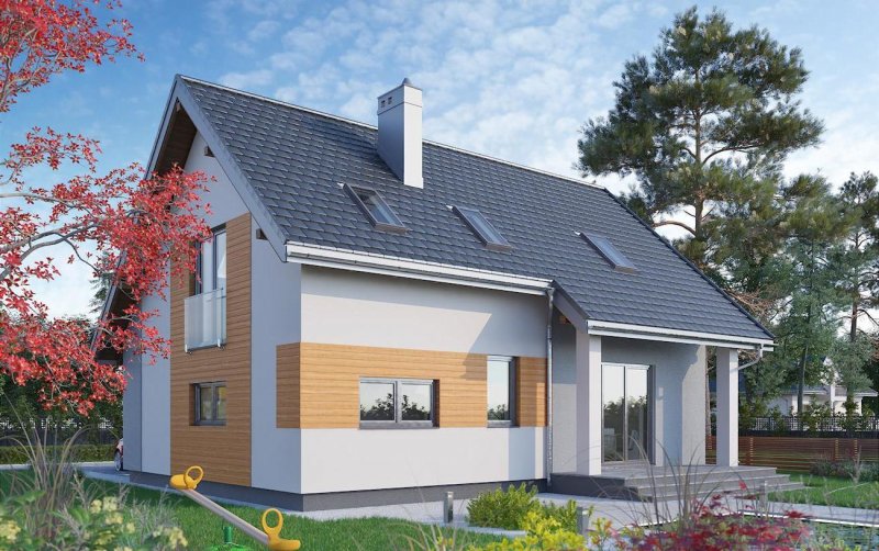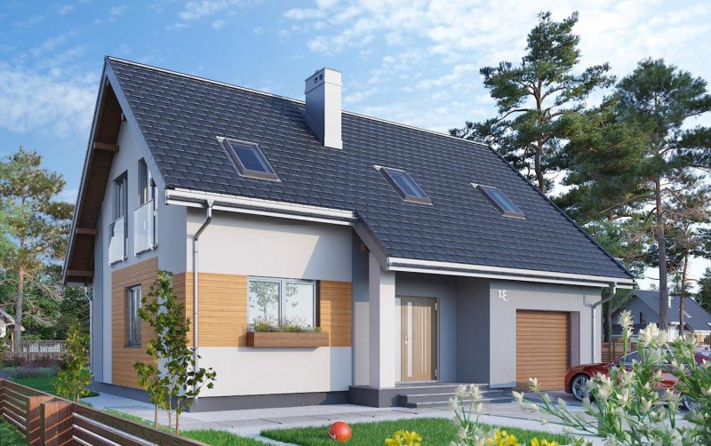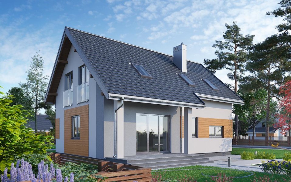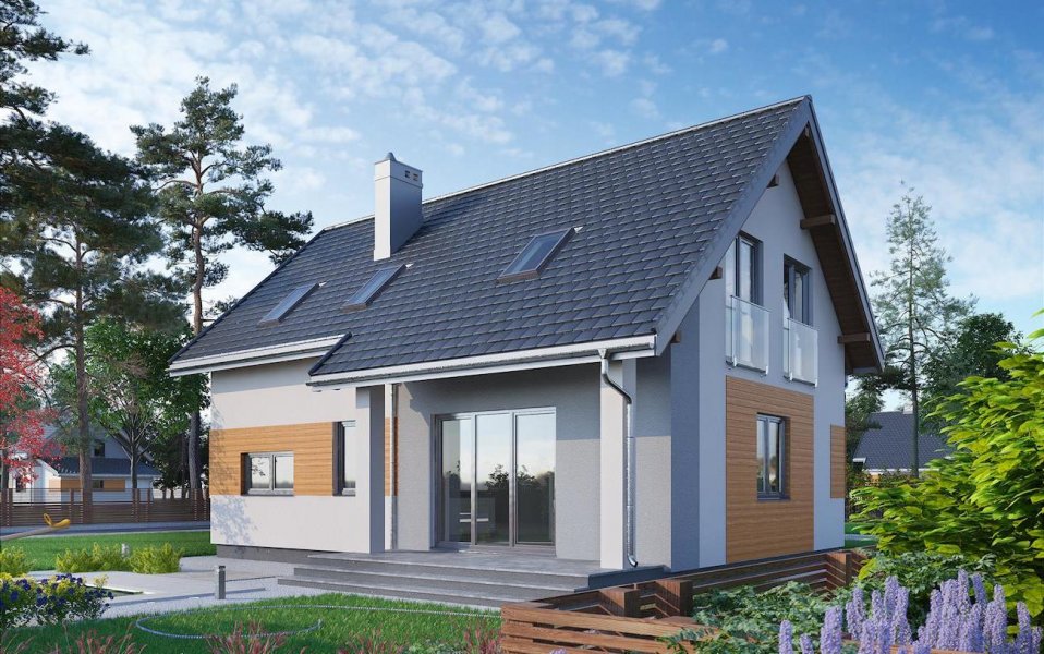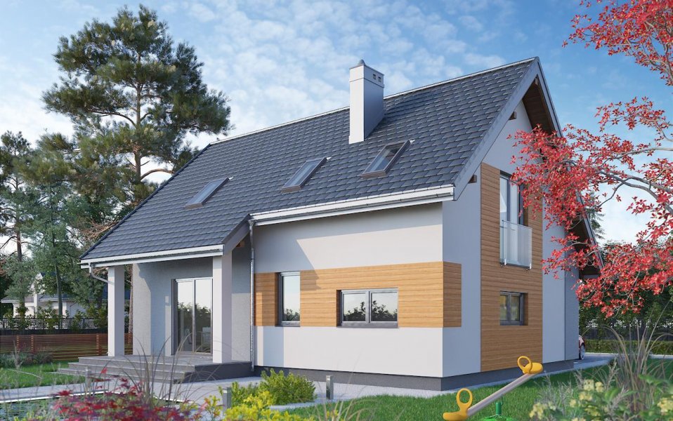 Szczególnie ekonomiczne propozycje domów parterowych z użytkowym poddaszem i wbudowanym garażem mają zwarty prostokątnym zarys i dwuspadowy, prosty dachu bez lukarn. W tej grupie, w przedziale wielkości ok. 90m2 p.u., projekt domu Tibor zbliżony jest sylwetką, wejściowym podcieniem z przedłużonym okapem oraz programem funkcjonalnym do Tomira i Toli Mini. Strefę wspólną rozwiązano jednak w jeszcze bardziej otwarty sposób. Pokój dzienny zajmuje niemal cały parter, poza sienią z przejściem do garażu i kotłowni oraz łazienką. Salon nie tylko łączy się z kuchnią ale pełni funkcję holu obejmując schody. Dzięki temu, oprócz wc, znalazło się na dole miejsce na kabinę prysznicową, a projekt domu Tibor oferując jeszcze dwie kolejne łazienki na poddaszu nie ma sobie równych w tym zakresie wśród domów o tak niewielkiej powierzchni. Trzy spore sypialnie na dwóch poziomach drugiej kondygnacji są wygodne i ustawne. Nieco wyższe, niż w Toli i Tomirze, ścianki kolankowe oraz doświetlenie pomieszczeń wysokimi oknami porte fenetre wprowadzają do tradycyjnej bryły nowoczesny ład.