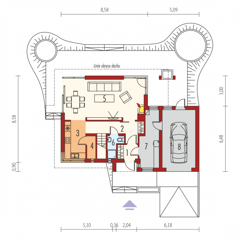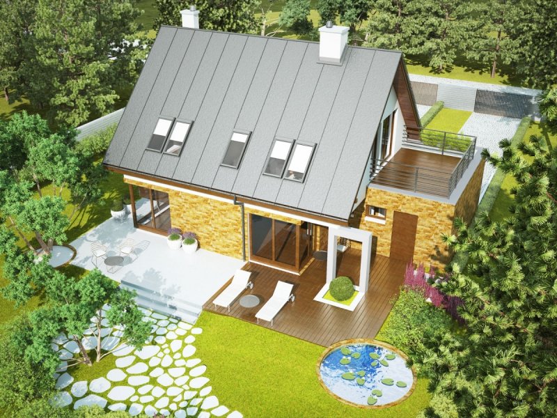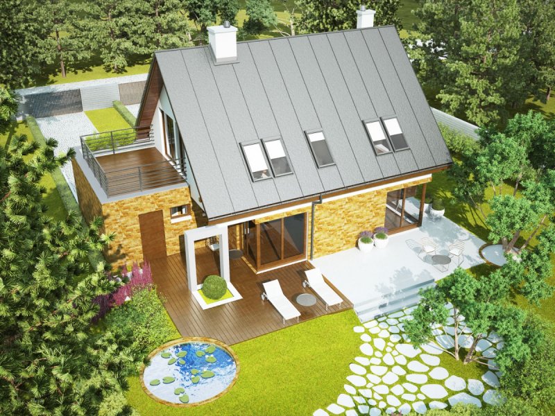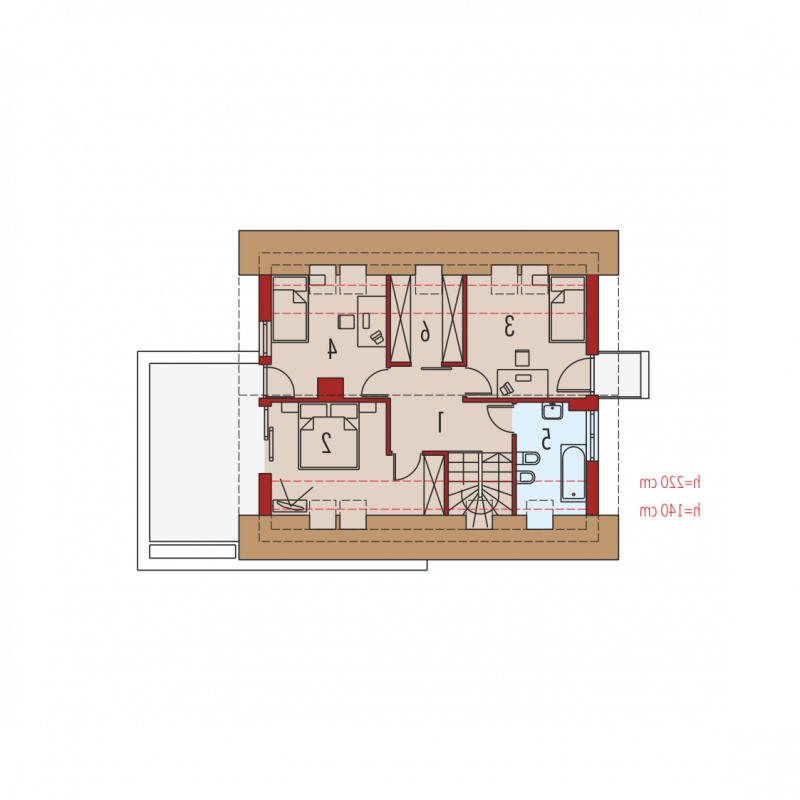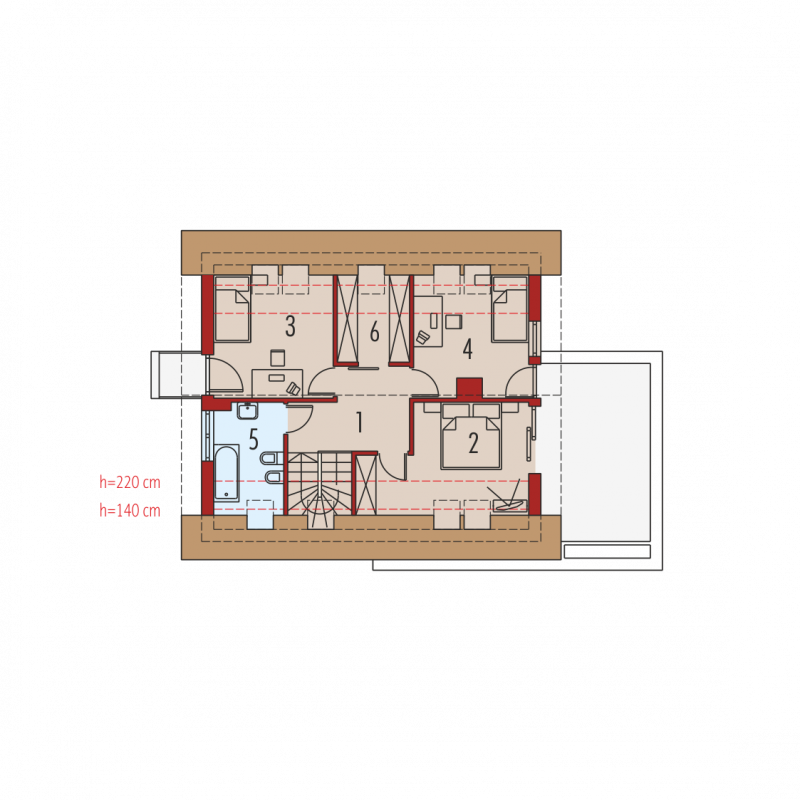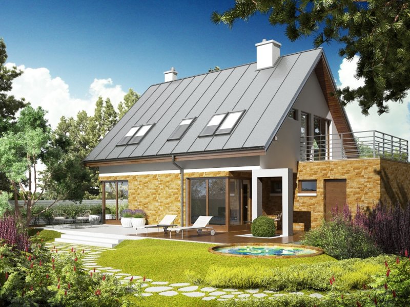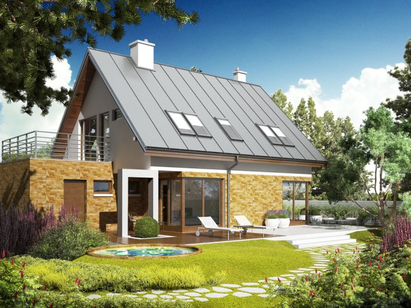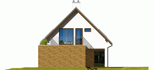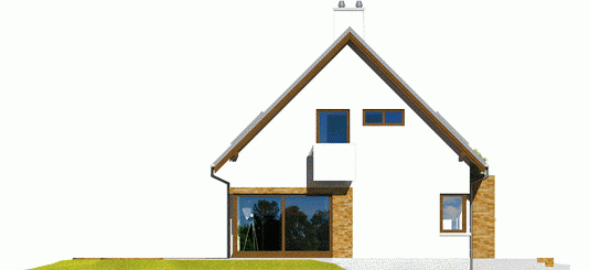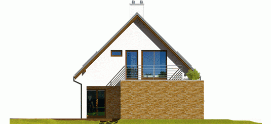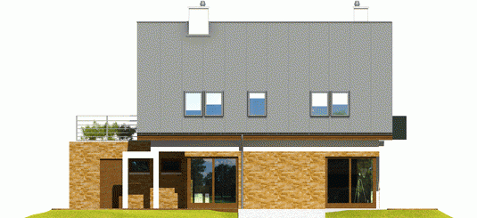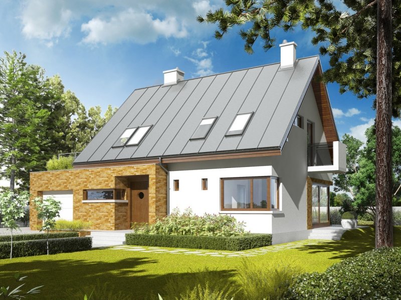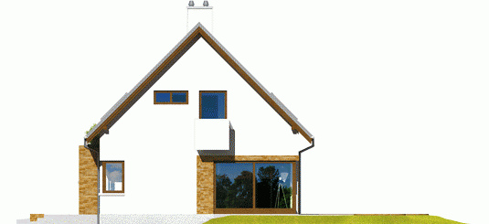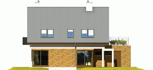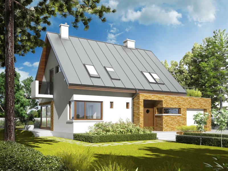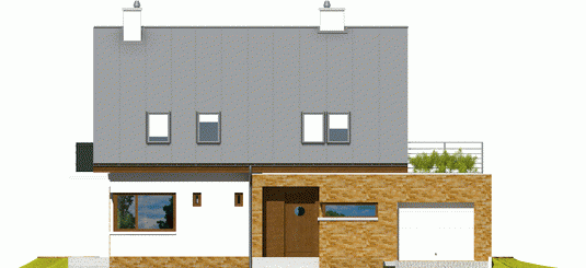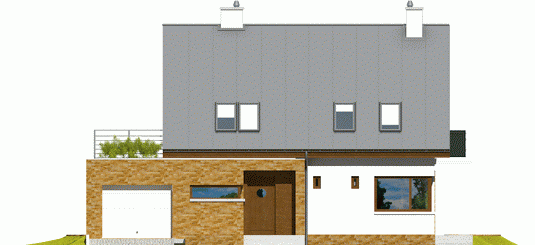 Dom parterowy, z poddaszem użytkowym, niepodpiwniczony, z garażem jednostanowiskowym. Przeznaczony dla 3-4-osobowej rodziny. Dom charakteryzuje czytelny układ pomieszczeń. Na parterze znajduje się strefa dzienna z przestronnym dobrze doświetlonym salonem, z miejscem na część jadalną oraz kuchnię ze spiżarnią. Dodatkowo w strefie wejściowej znalazły się wiatrołap, hol, łazienka oraz pomieszczenie gospodarcze, z którego można dostać się do garażu. Strefę nocną na poddaszu tworzą trzy duże sypialnie, łazienka i garderoba. Nowoczesny Tim G1 (wersja B) cieszy swoich domowników słonecznym wnętrzem i stylowymi elementami wykończenia. Gustowny kamień doskonale komponuje się z szykowną elewacją, nadając bryle niepowtarzalnego uroku. Zachwycającą częścią domu jest taras zlokalizowany nad garażem, który tworzy dodatkową strefę rekreacyjną, z fantastycznym widokiem na ciekawie zaprojektowany ogród. Istnieje możliwość podpiwniczenia domu.