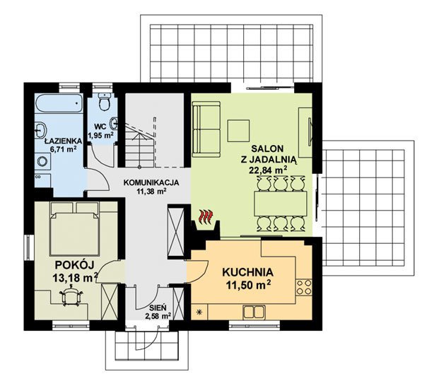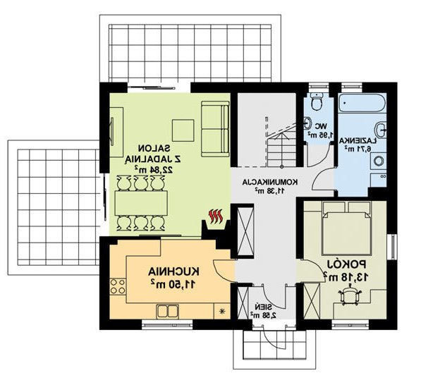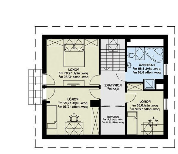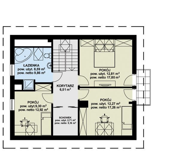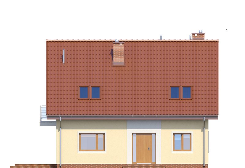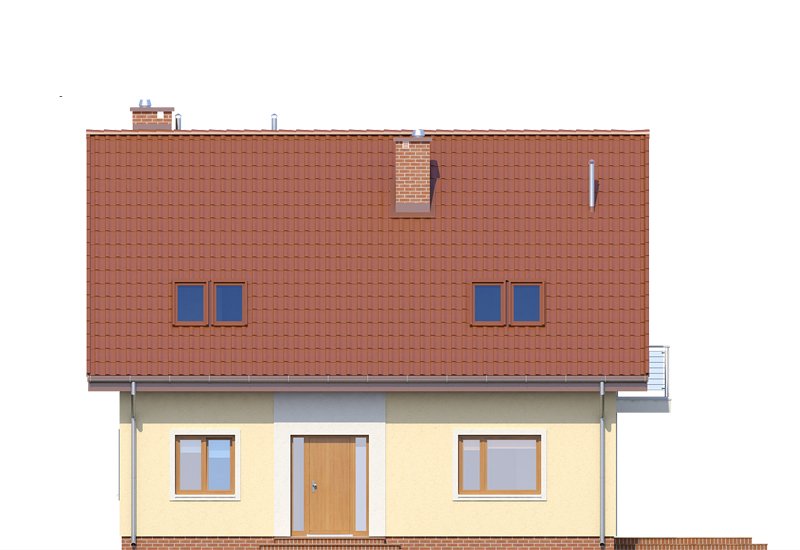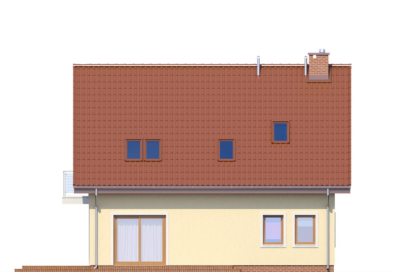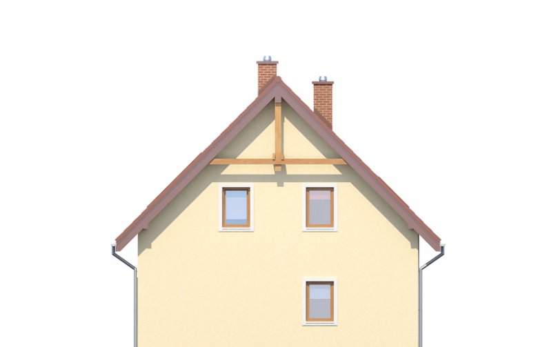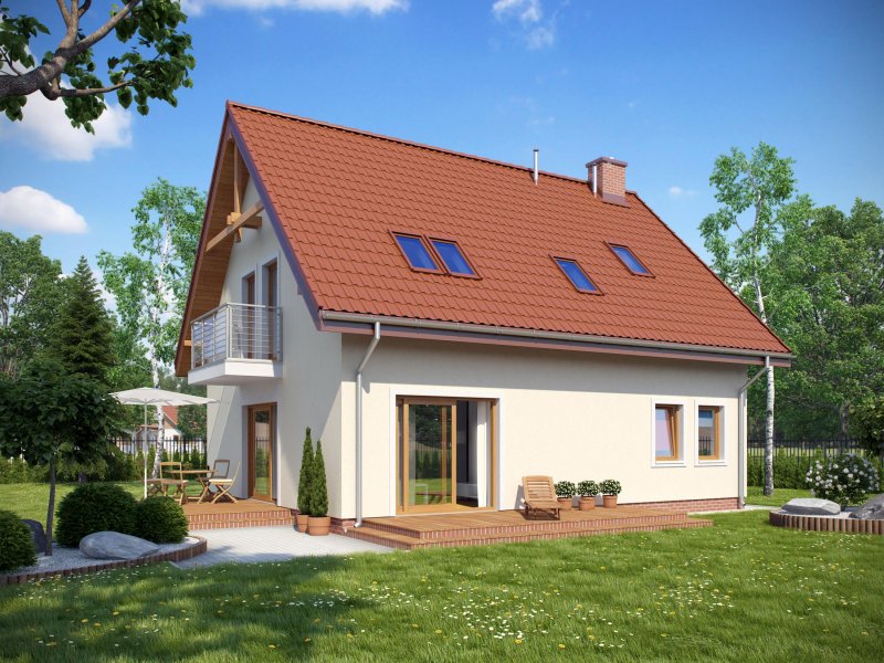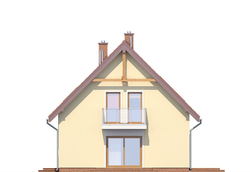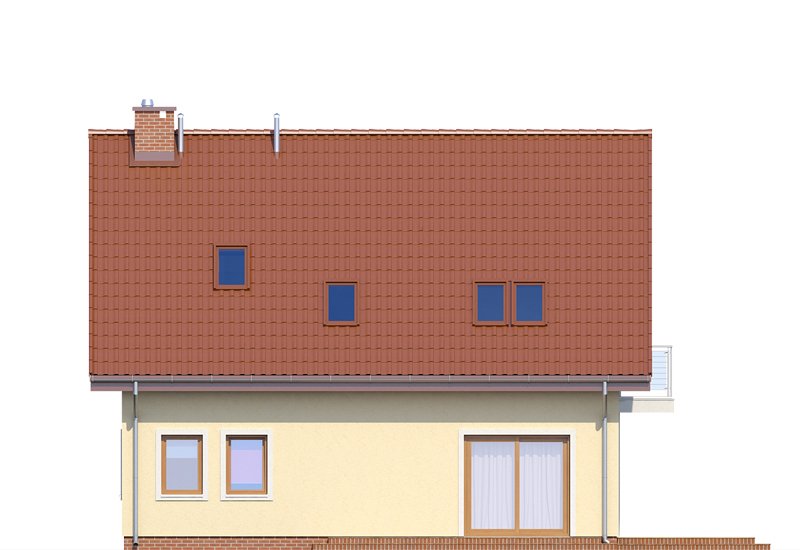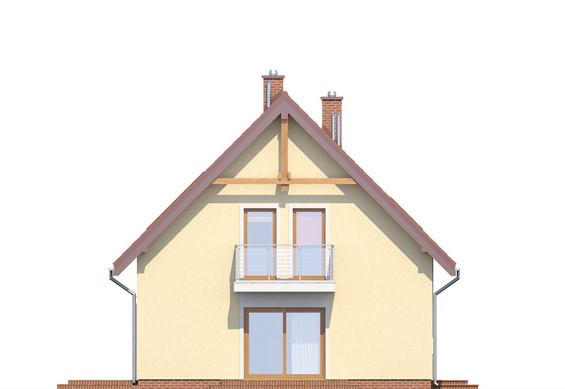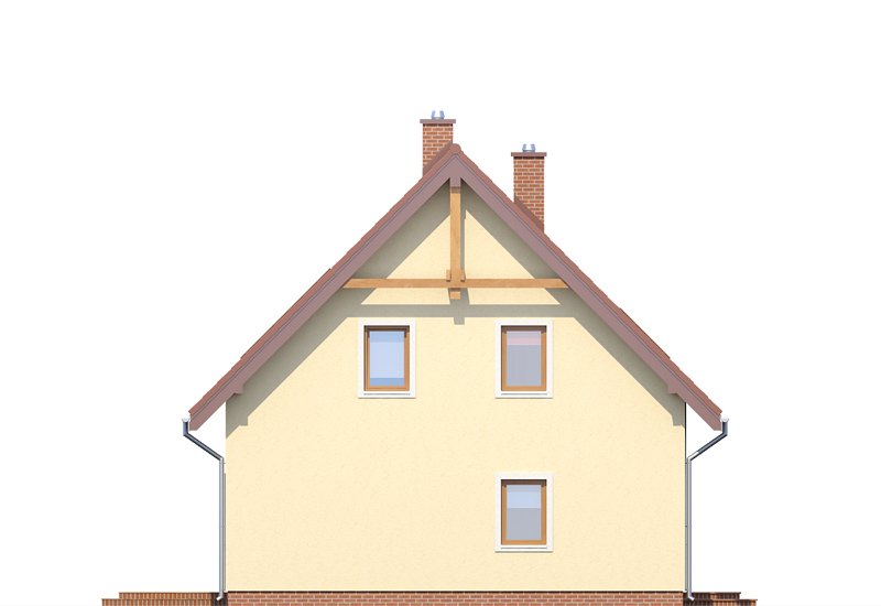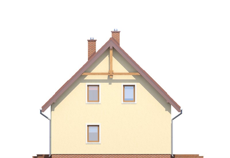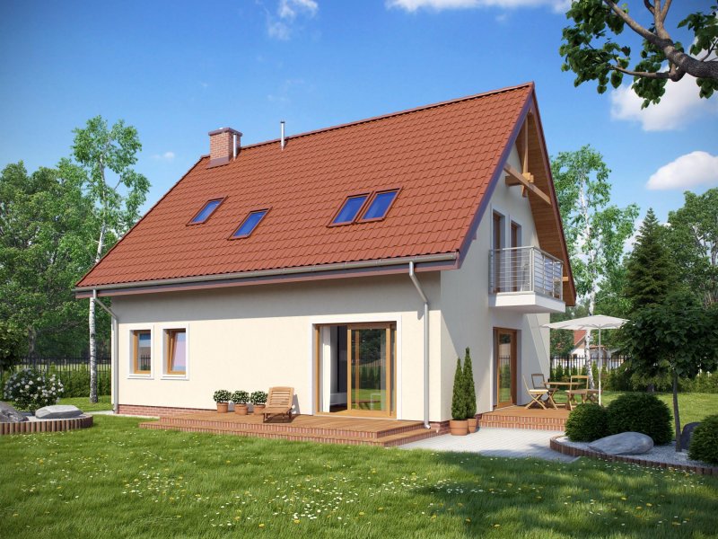 Dom wyróżnia się wyraźnym podziałem na strefę dzienną (parter), dostępną dla domowników i dla gości oraz strefę nocną (piętro), o bardziej kameralnym charakterze. Na parterze poza kuchnią i salonem otwartym na ogród zaproponowaliśmy przestronny pokój gościnny z łazienką. Na piętrze znajdują się trzy przytulne sypialnie pod spadzistym dachem, dużą, wygodną łazienkę oraz pomieszczenie pomocnicze, które doskonale sprawdzi się jako schowek lub garderoba.