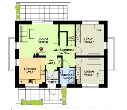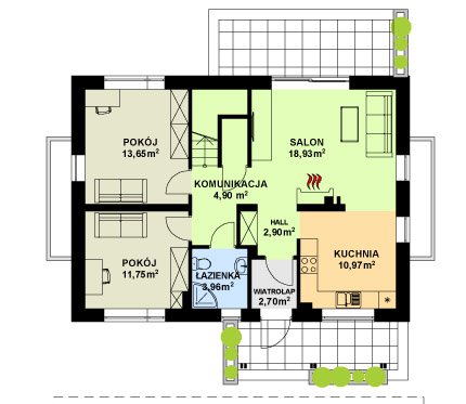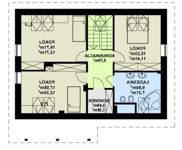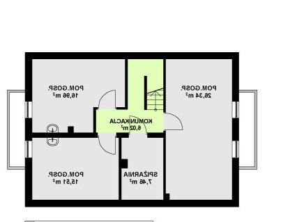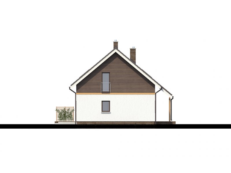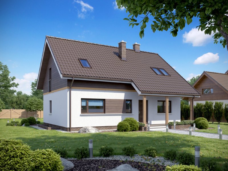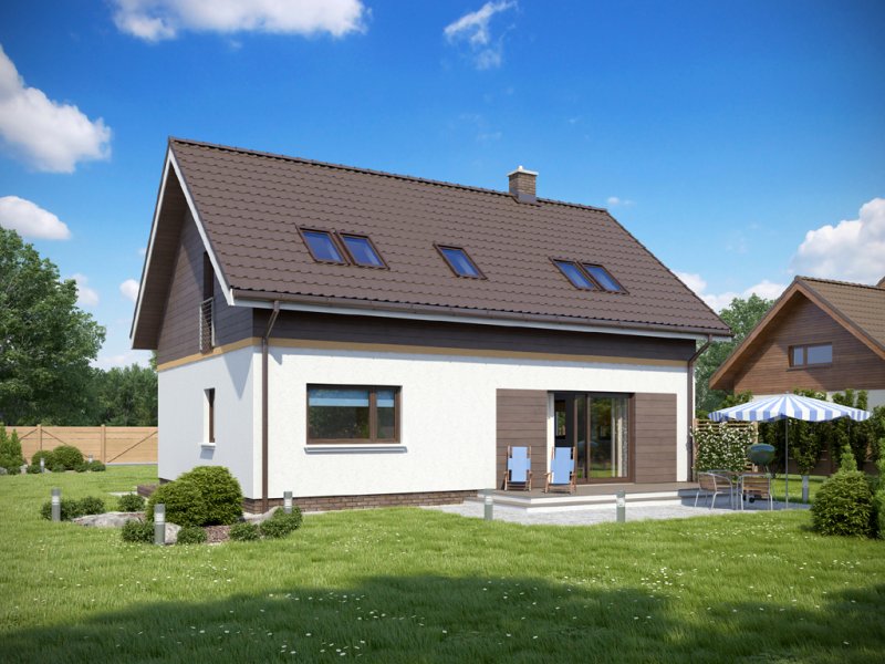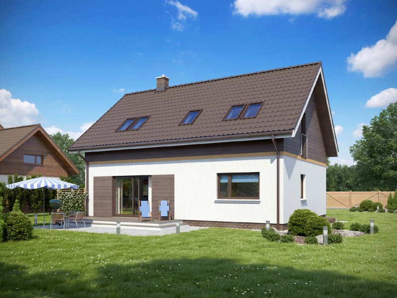 Dom o niezwykle funkcjonalnym wnętrzu. Na niewielkiej powierzchni zmieszczono program użytkowy dla pięcio-, a nawet sześcioosobowej rodziny. Wygodnym udogodnieniem jest wydzielenie na parterze dwóch pokoi z własną łazienką. Mogą służyć one jako domowe biuro, pokoje gościnne lub pomieszczenia mieszkalne dla starszej osoby. W domu przewidziano także piwnicę.