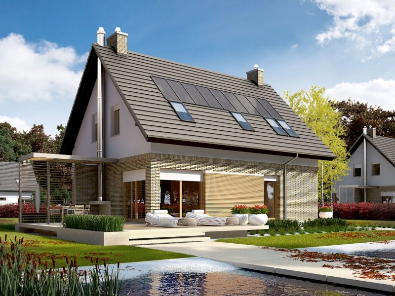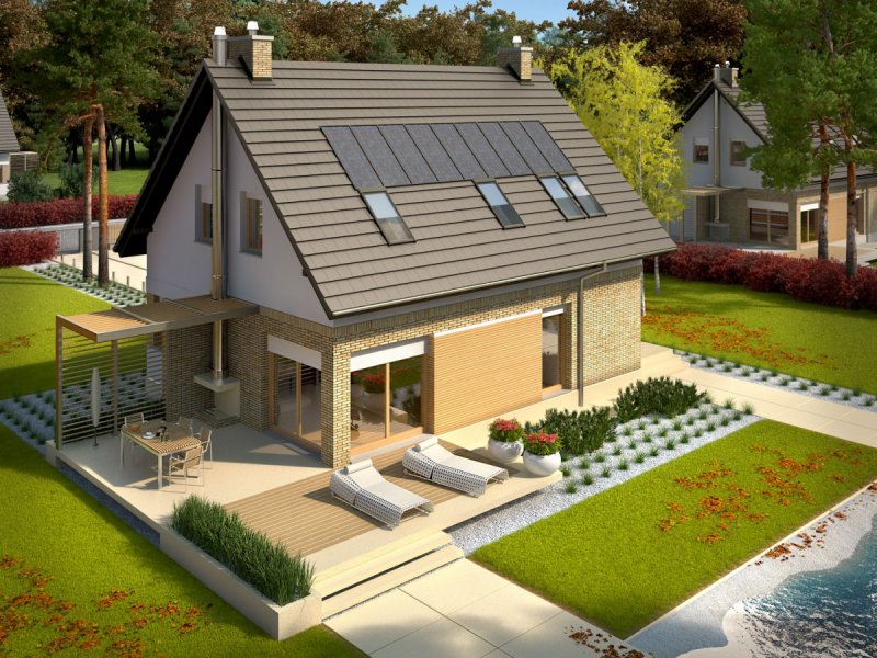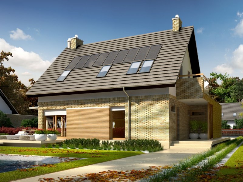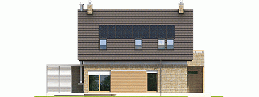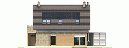 - Elewacje: tynk cienkowarstwowy mineralny i okładzina drewniana oraz klinkierowa
