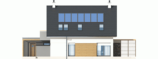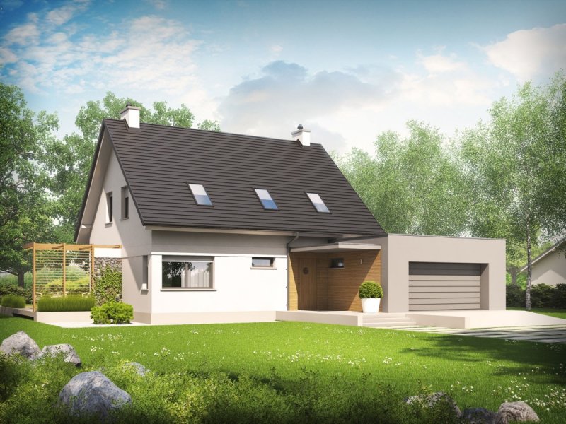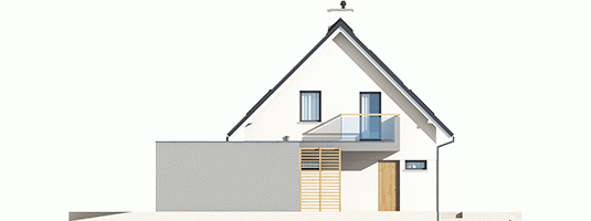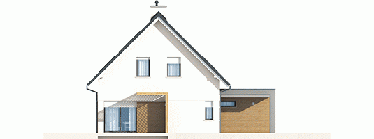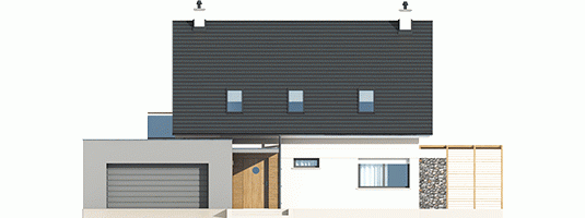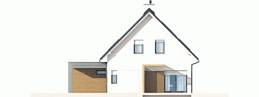 Tobiasz II G2 to dom, który nawiązuje do modernistycznego minimalizmu. Klasyczną bryłę z prostym dwuspadowym dachem, zgrabnie wzbogacono o obszerny, dwustanowiskowy garaż w formie prostopadłościanu. Interesującym elementem architektury budynku jest dekoracyjna pergola, która pełni jednocześnie funkcję parawanu, zapewniając domownikom zaciszny, komfortowy azyl na tarasie. Aby podkreślić nowoczesny charakter Tobiasza II G2, do wykończenia elewacji wykorzystano elegancki duet bieli i szarości, a także grę kontrastów – chłodną urodę kamienia i przytulny urok drewna. Wnętrze domu z elastycznym układem funkcjonalnym, harmonijnie dopasuje się do zmieniających się potrzeb rodziny, ciesząc mieszkańców swoją codzienną wygodą.