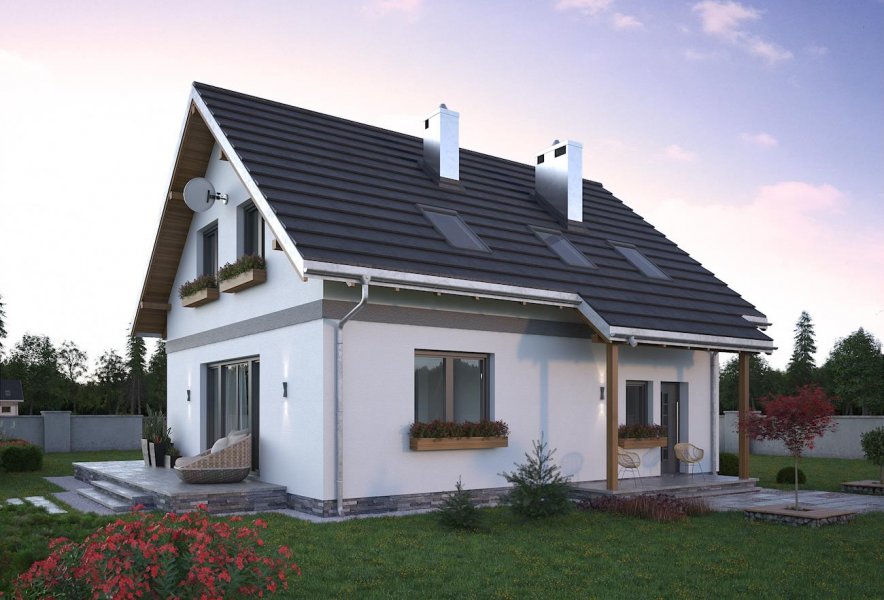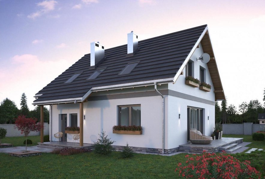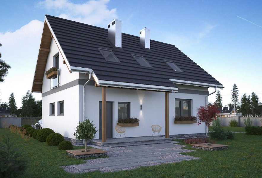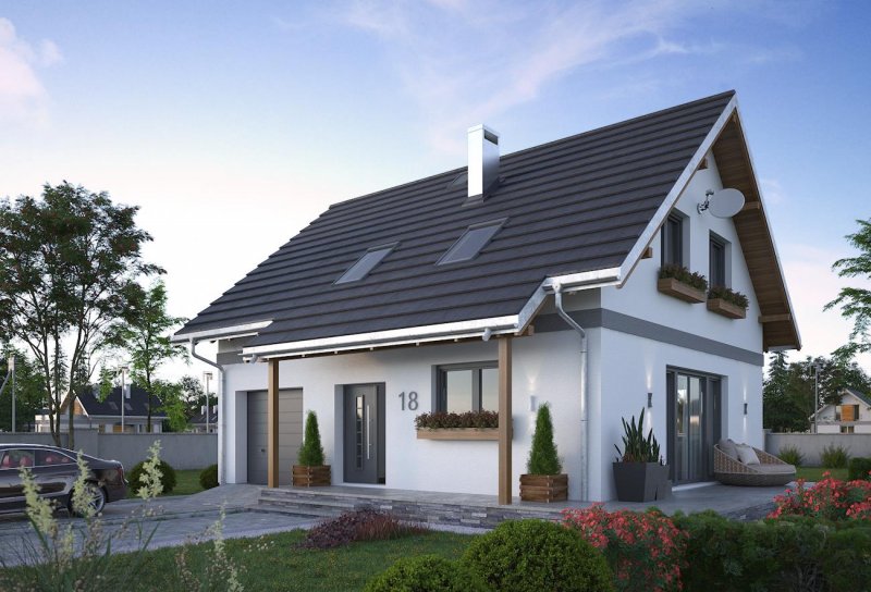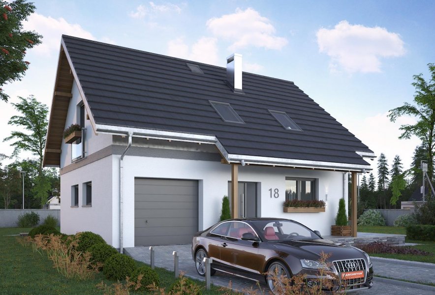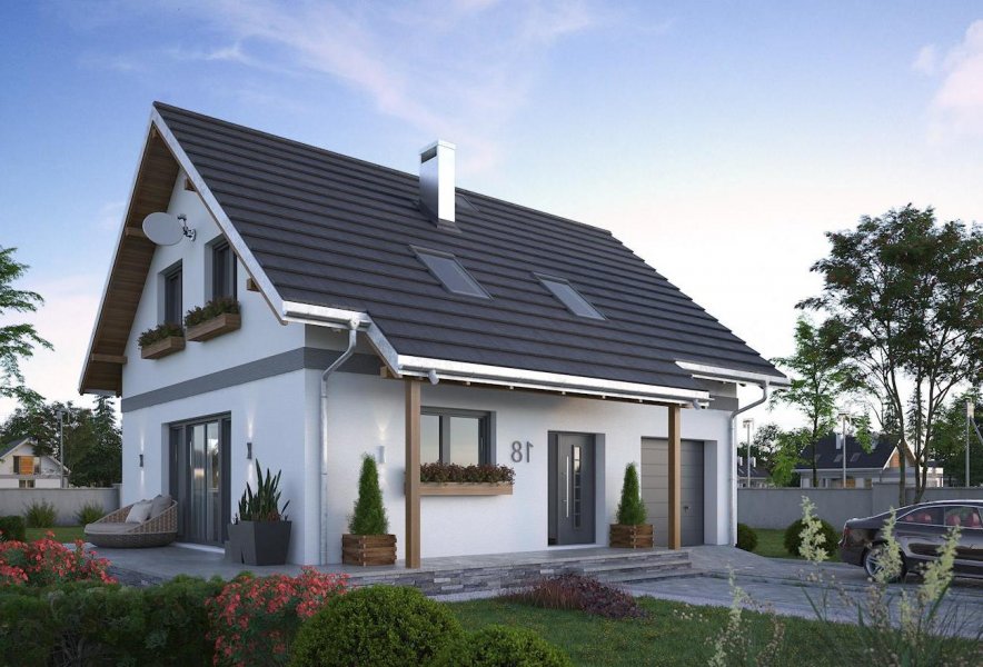 Do realizacji niedrogiego domu parterowego z użytkowym poddaszem i wbudowanym garażem o powierzchni ok. 95m2 i najprostszej bryle mogą posłużyć m.in. projekty Zojka Nano i Tola Mini. Oba mają prosty dwuspadowy dach bez lukarn i kalenicę równoległą do drogi dojazdowej. Projekt domu Tola Mini to rozwiązanie z bardziej oddzielonym od strefy komunikacji, choć również otwartym, pokojem dziennym. Na parterze ma tylko wc ale oferuje za to dodatkowe, wykorzystujące miejsce pod schodami pomieszczenie gospodarcze przy kotłowni ulokowanej za garażem. Poddasze podzielono na trzy wygodne sypialnie i dużą łazienkę, rezygnując z zaproponowanego w Zojce Mini dużego przedpokoju z miejscem do pracy. Podobnie jak w Zojce Mini elewacje są energooszczędne - gładkie, bez balkonów w szczytach. Jedynym detalem urozmaicającym sylwetkę są obniżenia okapów wsparte drewnianymi słupkami i tworzące podcienie nad wejściem frontowym i wyjściem z kotłowni na tyłach posesji. Oszczędną, tradycyjną stylistykę w projekcie domu Tola Mini przełamuje duże balkonowe przeszklenie jadalni z wyjściem na taras w ścianie bocznej. Można podkreślić je i osłonić rozwijaną latem markizą.