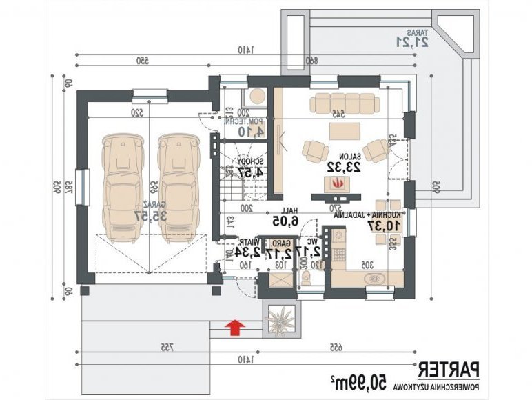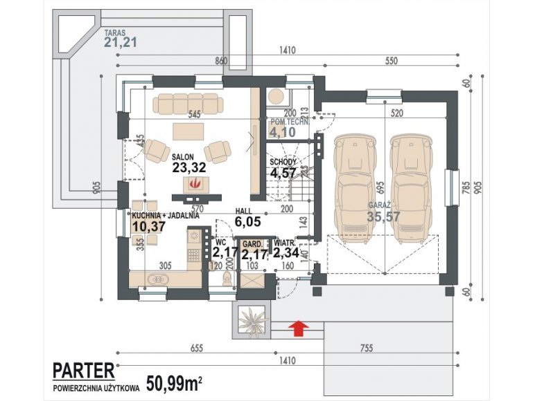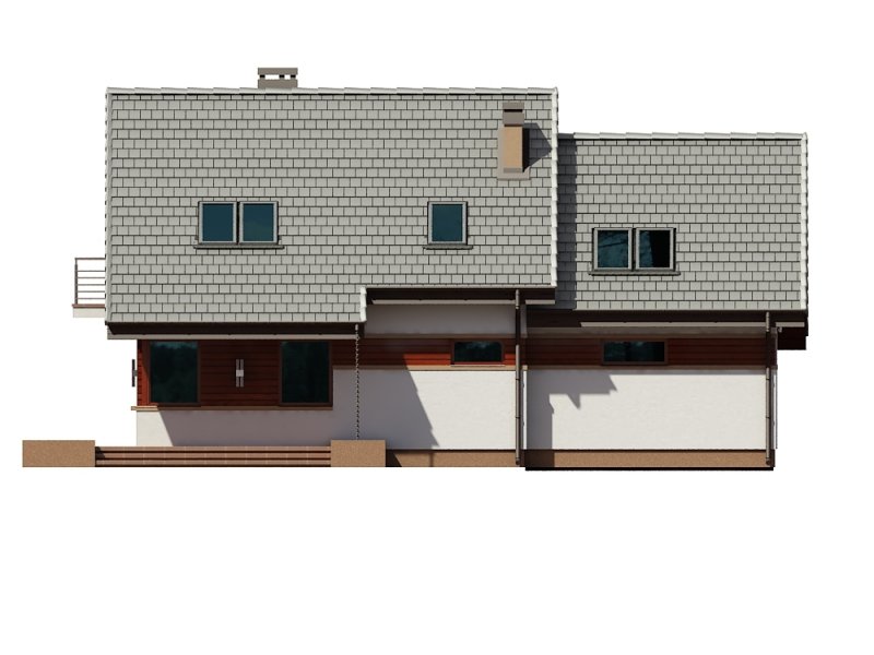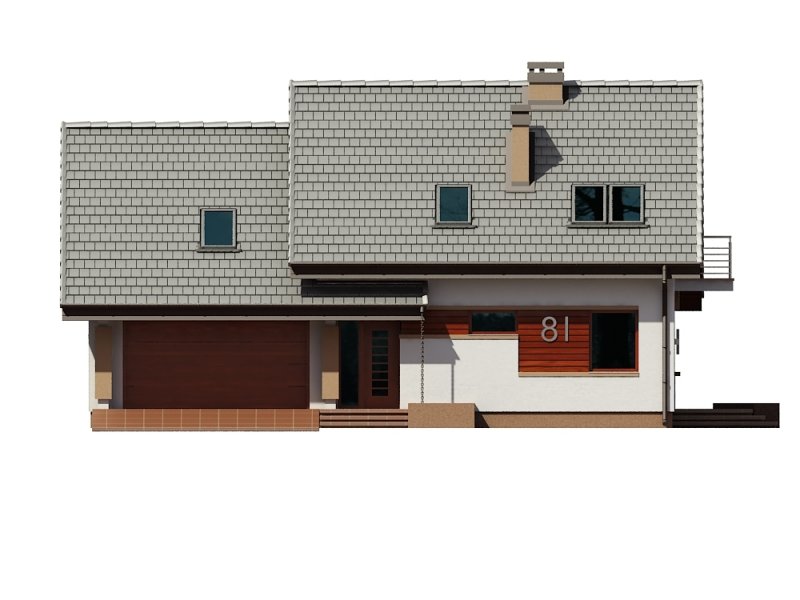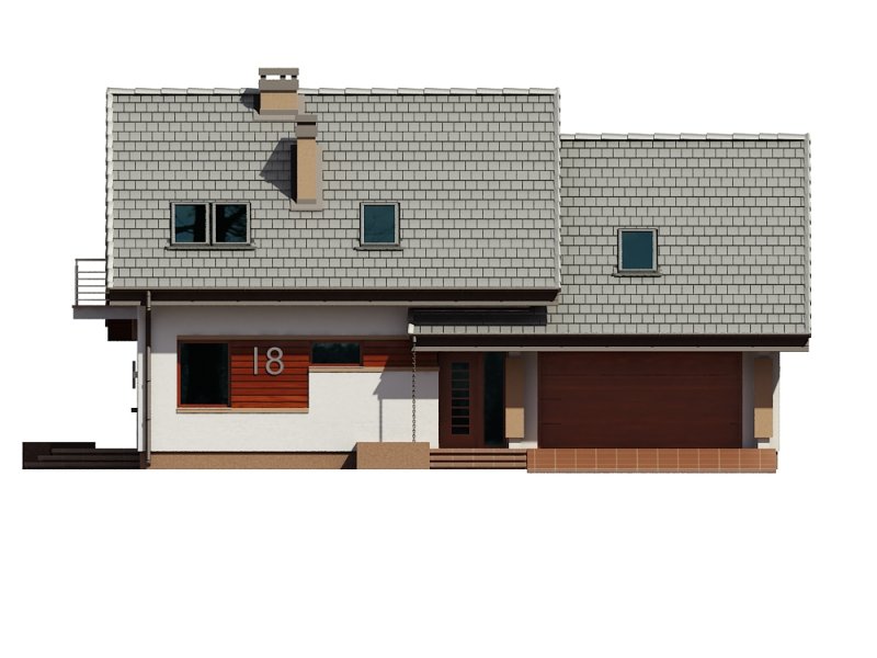 W parterowej części frontowej domu znajduje się kuchnia z aneksem jadalnym połączona z salonem, który usytuowano tak aby zapewnić dobrą ekspozycję zarówno w elewacji bocznej jak i tylnej. Program użytkowy parteru uzupełniają: wc, garderoba, dwustanowiskowy garaż oraz kotłownia na olej lub gaz lub paliwo stałe (np. ekogroszek, pelety). Strefę nocną sytuowaną na poddaszu tworzą dwa pokoje przeznaczone dla dzieci (w tym jeden z garderobą może być użytkowany przez 2 osoby), i ogólnodostepna łazienka oraz oddzielna, przestronna część dla rodziców składająca się z dużej sypialni i garderoby.