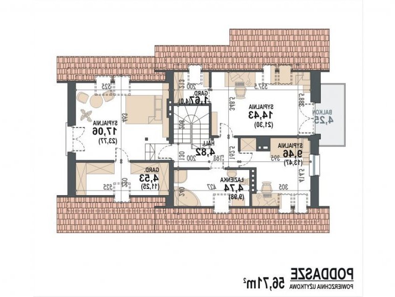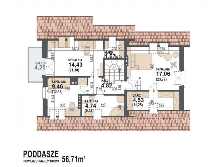 Dach : dwuspadowy o konstrukcji drewnianej, pokryty dachówką ceramiczną, cementową lub blachodachówką