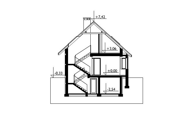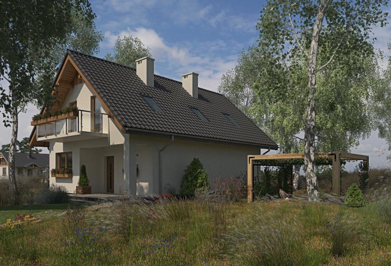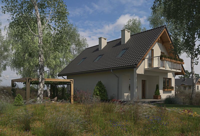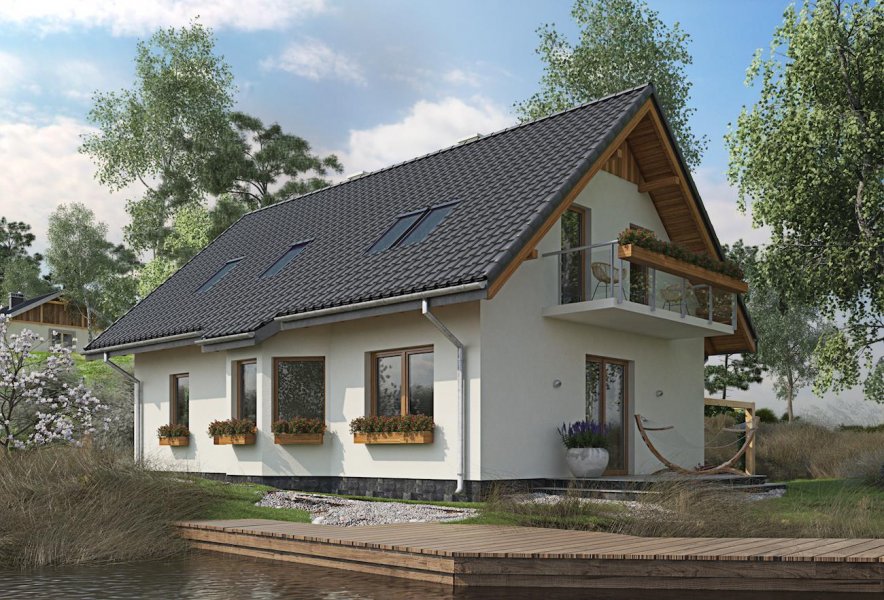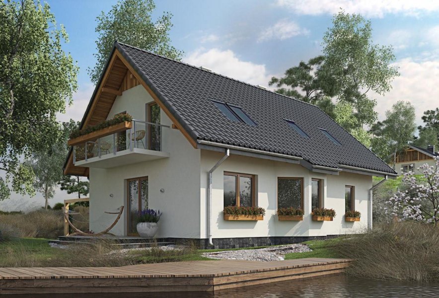 Funkcjonalny dom dla 4-5 osobowej rodziny. Na parterze wydzielona kuchnia, łazienka oraz przestronny salon z jadalnią. Poddasze to cztery sypialnie i łazienka. W piwnicy pokój hobby, kotłownia i pralnia. Dom ma prostą bryłę, nieduże rozmiary i dobrze pasuje na wąskie działki. Dach dwuspadowy o nachyleniu 42°, podcień akcentujący wejście. Od tyłu domu zadaszenie nad tarasem tworzy balkon. Ryzalit w jadalni doświetla całą część dzienną domku.