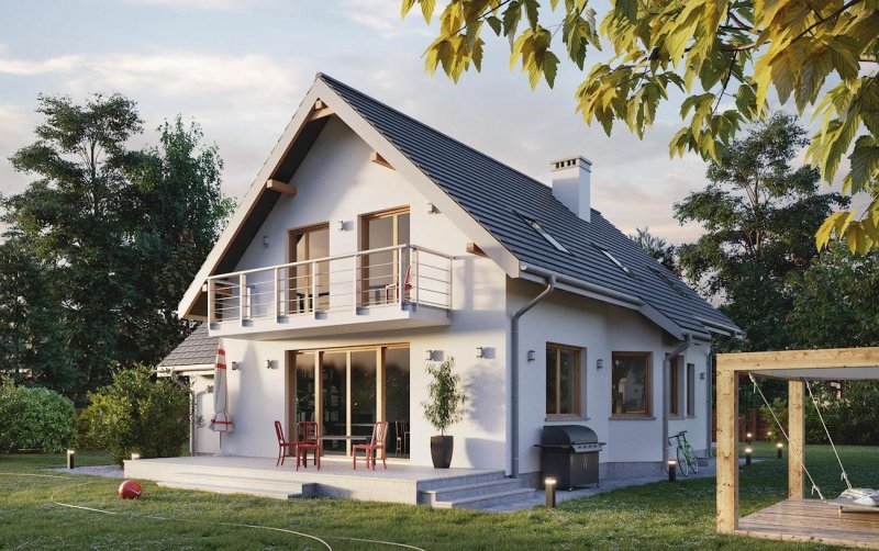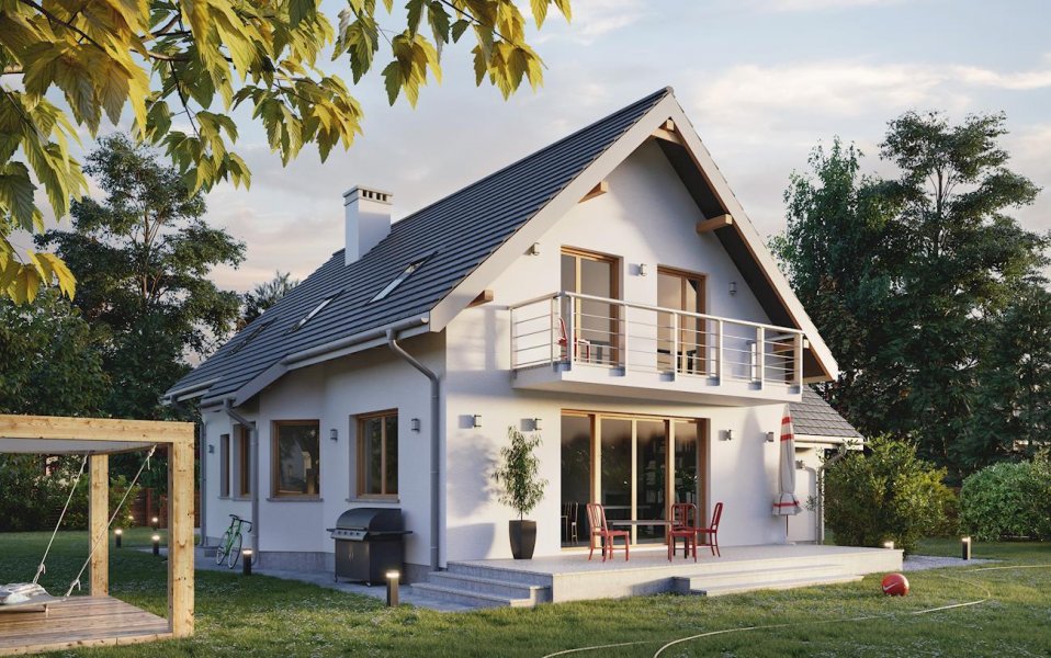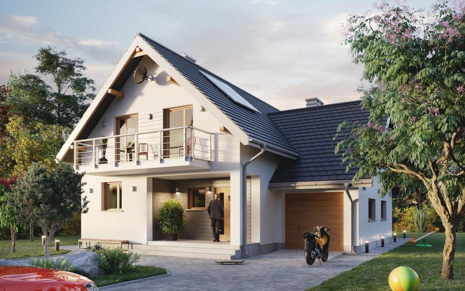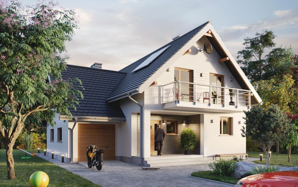 Projekt domu Tosia Mobil jest jedną z propozycji domu parterowego z użytkowym poddaszem i z garażem, o powierzchni ok.120m2, o bryle zbudowanej na planie zbliżonym do litery T. Kalenice dwuspadowych dachów nad ramionami rzutu są prostopadłe. Wyższa część mieszkalna, pod którą zaprojektowano piwnice, wysuwa się do przodu jeszcze wyraźniej niż w podobnej Kolibie Astro. Wejście frontowe osłonięte balkonem podkreśla dodatkowo wnęka z narożnym słupem. Parter mieści przestronny salon i kuchnię z łazienką. Łączy je jadalnia ulokowana w ryzalicie rozrysowanym na planie części ośmiokąta foremnego, otwarta na hol i wygodne, dwubiegowe schody. Słupy konstrukcji stropu oddzielają optycznie pokój dzienny od komunikacji i zejścia do piwnic, tworząc warunki do całkowitego odseparowania tej przestrzeni ścianą działową lub aranżacją mebli. Poddasze to cztery niewielkie ale bardzo ustawne, jak na wydłużony rzut całości, sypialnie z wyjściami na balkony oraz komfortowa łazienka. Część gospodarcza w projekcie domu Tosia Mobil dostępna jest z sieni i przewiduje tylko garaż ze strychem, a kotłownia jest jednym z trzech dużych pomieszczeń piwnicy.
