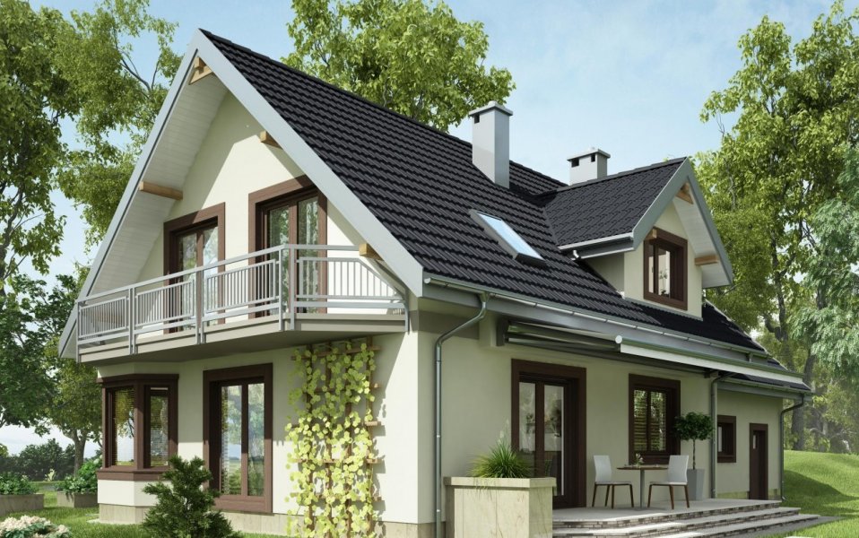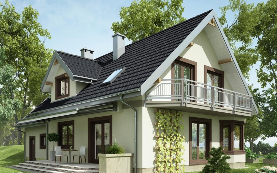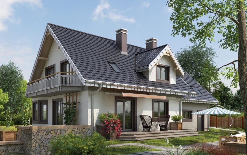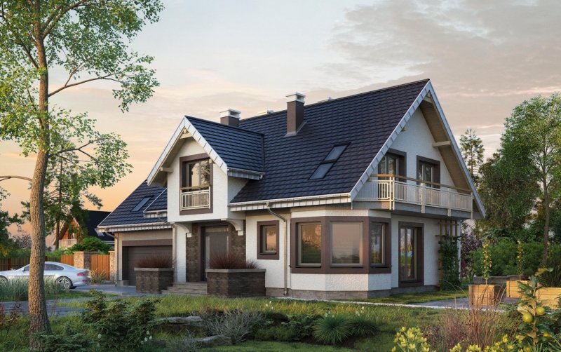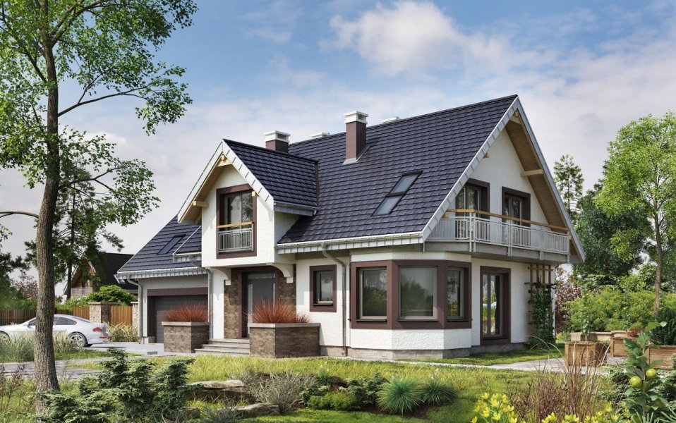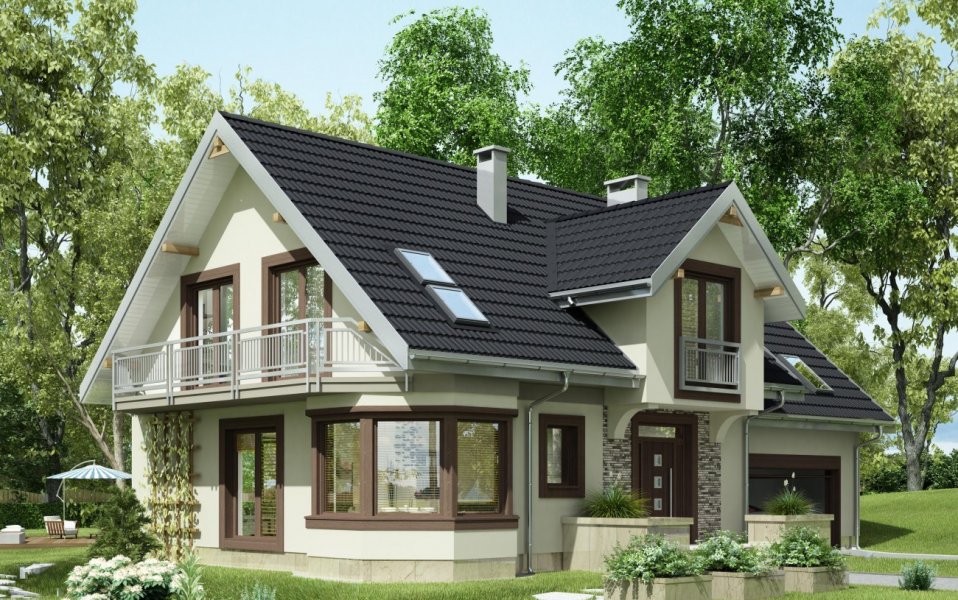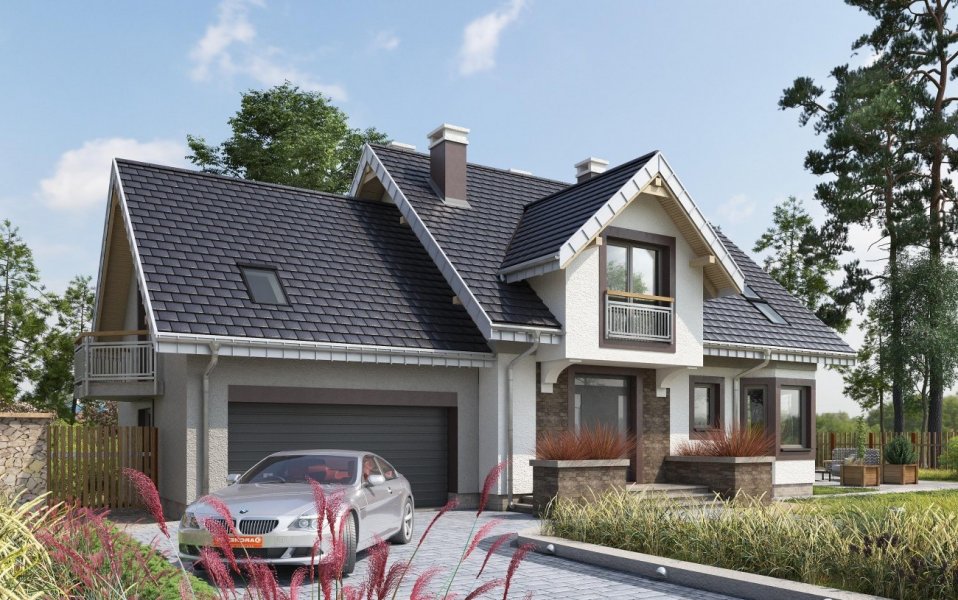 Mniej zwarta bryła charakteryzująca projekty domów dużych, takich jak Turkus to z jednej strony konieczność, z drugiej - architektoniczny atut. Większa długość ścian zewnętrznych ułatwia dobre oświetlenie obszernych wnętrz. Jednocześnie w budynku o znacznych gabarytach powstają mniejsze formy, co zmienia korzystnie jego proporcje. Mieszkalną część Turkusa akcentuje narożny ryzalit na rzucie ośmiokąta z jadalnią przy kuchni oraz lukarny od frontu i ogrodu. Na parterze przewidziano bardzo przestronny, otwarty układ salonu i gabinet. Część nocna na poddaszu składa się z 3 sypialni. Dwustanowiskowy garaż i kotłownię zamknięto w dostawionej, niższej bryle, przekrytej osobnym dwuspadowym dachem, który mieści komfortowo wyposażoną główną sypialnię. Oprócz podstawowych pomieszczeń projekt domu Turkus Rex oferuje trzy łazienki oraz, bezcenne w domu, schowki. Jeszcze większy salon z inaczej umiejscowionym kominkiem, a na poddaszu dodatkowo pralnię ma projekt domu Turkus Rex z rodziny Turkusa.