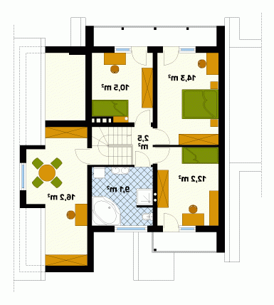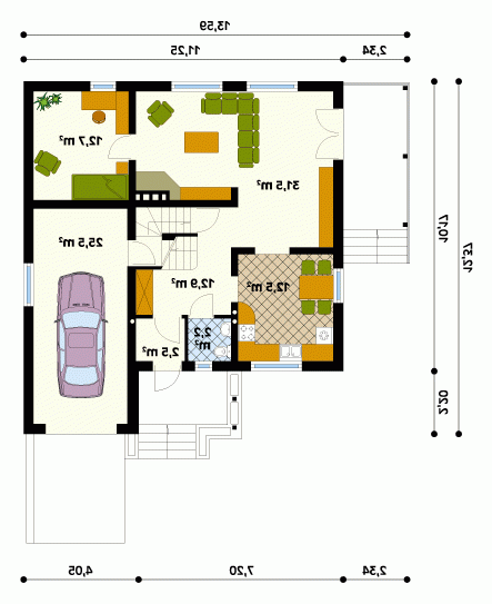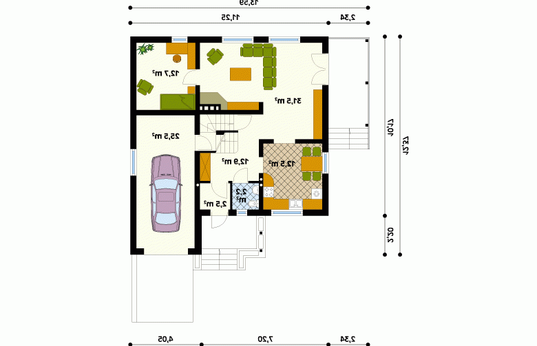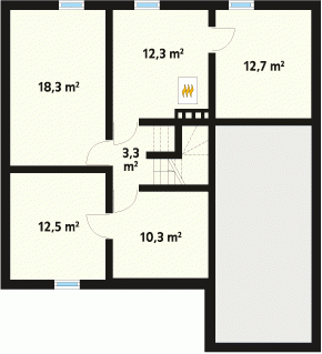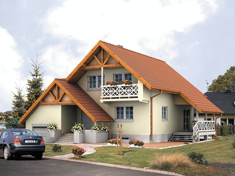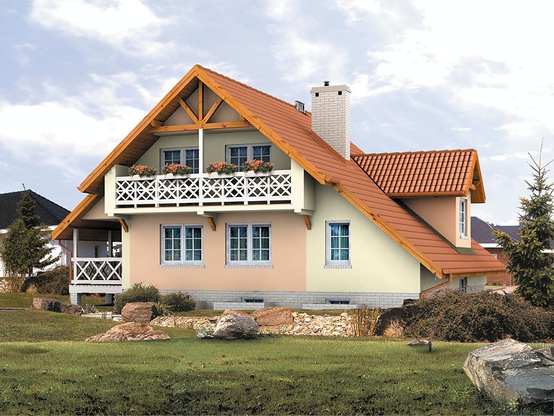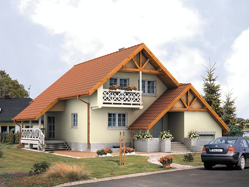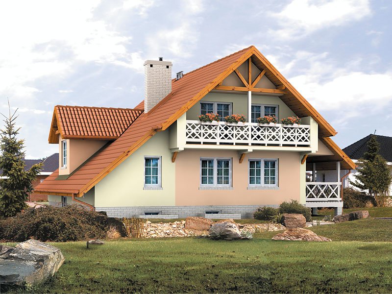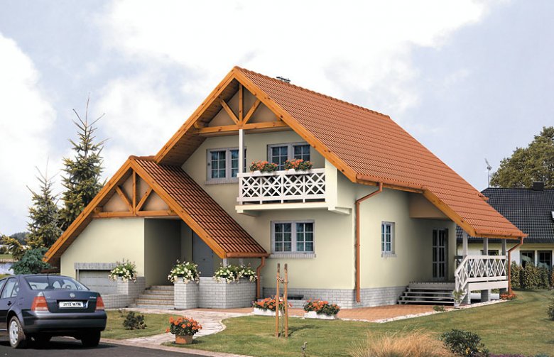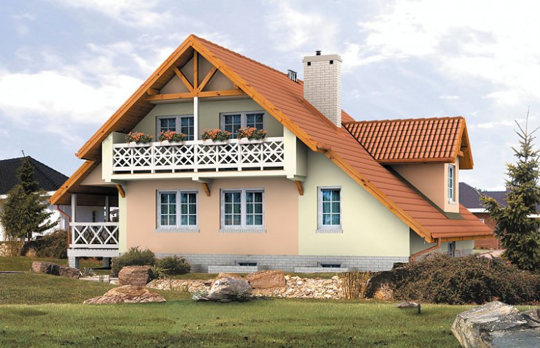 Wolno stojący, parterowy dom jednorodzinny z użytkowym poddaszem i podpiwniczeniem. Przeznaczony dla 4 – 5-osobowej rodziny. Dodatkowy pokój gościnny lub gabinet do pracy na parterze.
