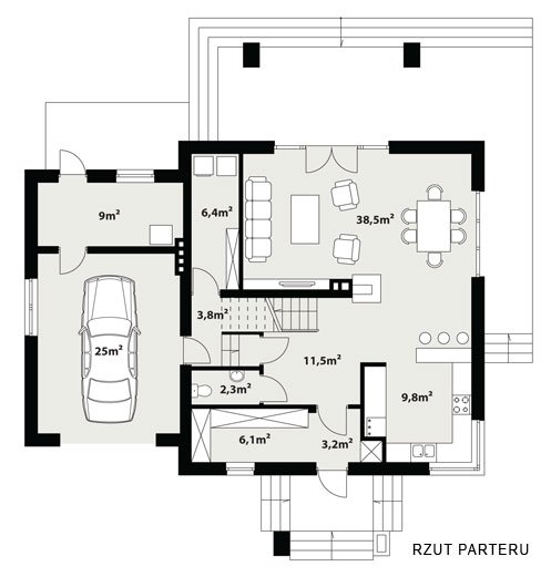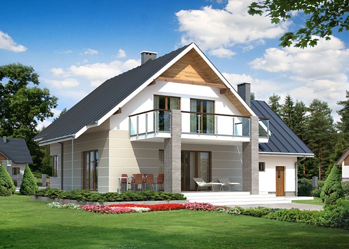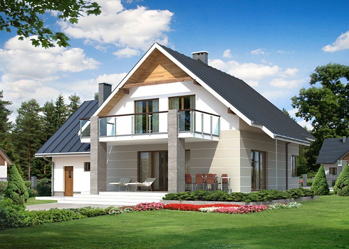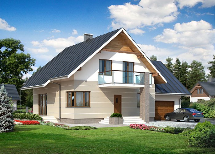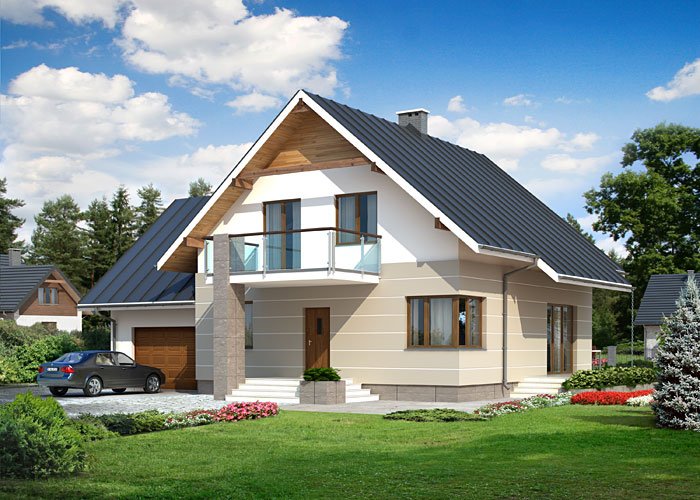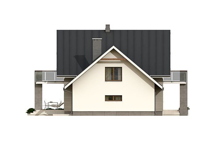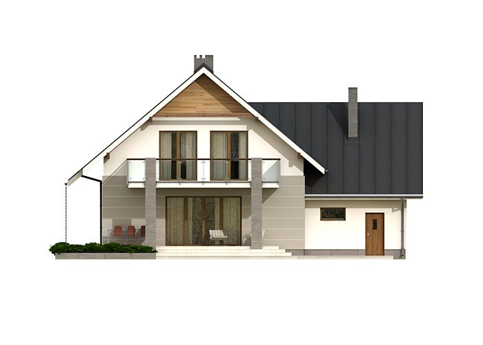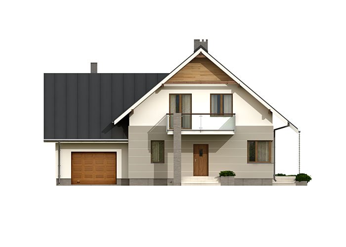 Dom jednorodzinny, parterowy, z poddaszem użytkowym, niepodpiwniczony, z dużym garażem. Bardzo wygodny i przestronny, z nowocześnie ujętą reprezentacyjną bryłą. Posiada przestronny salon, który dodatkowo można powiększyć o powierzchnię pomieszczenia pomocniczego. Duży taras przekryty częściowo balkonem umożliwi wypoczynek na wielu poziomach relaksu. Wygodna kotłownia z drzwiami zewnętrznymi, dużo pomieszczeń pomocniczych i schowków. Wentylacja z odzyskiem ciepła (rekuperacja) zapewni oszczędność eksploatacji oraz komfort życia.