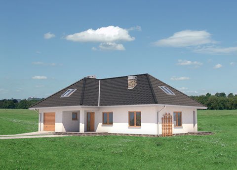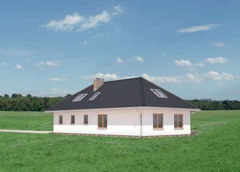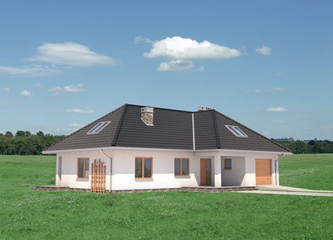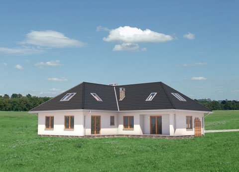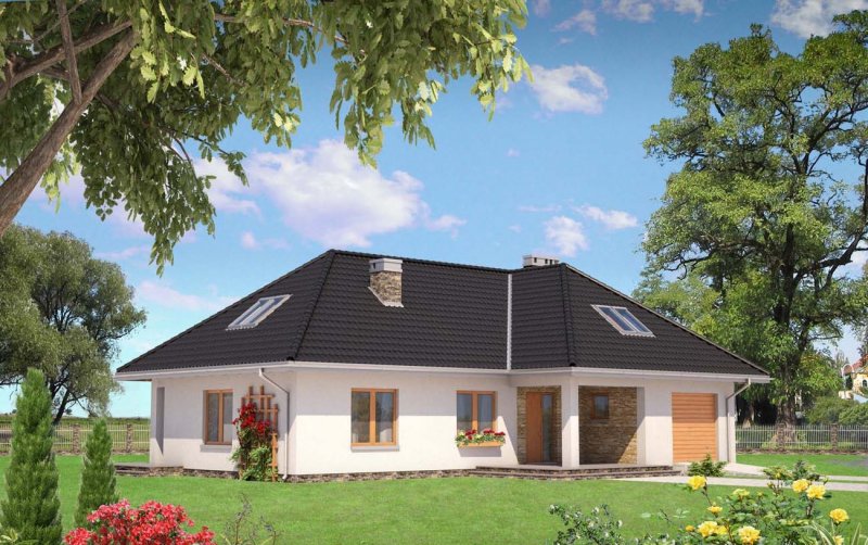 Projekt domu Tymoteusz-2 to wyjątkowa propozycja: duży atrialny dom z pojedynczym garażem powstał na stosunkowo niewielkim planie litery T. Tak, jak w identycznym wymiarami rzutu, parterowym Tymoteuszu, główny trakt budynku równoległy do drogi dojazdowej otwiera się pokojem dziennym na dziedziniec ogrodowy. Wariant 2 przewiduje przy tym żelbetowy strop i nieco większe nachylenie dachu, a w holu – oszczędne schody. Dostosowany do użytkowania poddasza schemat konstrukcyjny zamyka ścianami nośnymi kuchnię i salon, przez co mieszkanie ma bardziej tradycyjny charakter. Na parterze znajduje się także gabinet, a w skrzydle ogrodowym - trzy duże sypialnie i dwie ogólnie dostępne łazienki. Poddasze doświetlono tylko oknami dachowymi, co, podobnie jak w sporo mniejszej ale zbliżonej funkcjonalnie Wandzie, nadało wnętrzom trzech dodatkowych sypialni i łazienki specyficzny charakter. Czterospadowe, przenikające się dachy nad ramionami budynku mają tę samą wysokość, a front w projekcie domu Tymoteusz-2 akcentuje podcień ze słupem przy wysuniętym skrzydle garażu. Budynek, mimo imponującej powierzchni, ma bardziej charakter rodzinnego domu niż rezydencji.