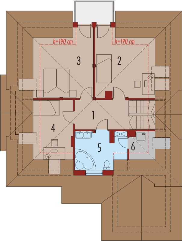 Dom z użytkowym poddaszem niepodpiwniczony z wbudowanym garażem przeznaczony dla 4-5 osobowej rodziny. Na parterze znajduje się strefa dzienna z hallem kuchnią jadalnią łazienką i pokojem dziennym oraz pokojem mogącym pełnić funkcję gabinetu. Z pokoju dziennego oraz sąsiedniego pokoju na parterze przewidziano wyjście na taras z podcieniem. Na poddaszu znajdują się dwie duże i jedna mała sypialnia oraz łazienka i pralnia z suszarnią.
