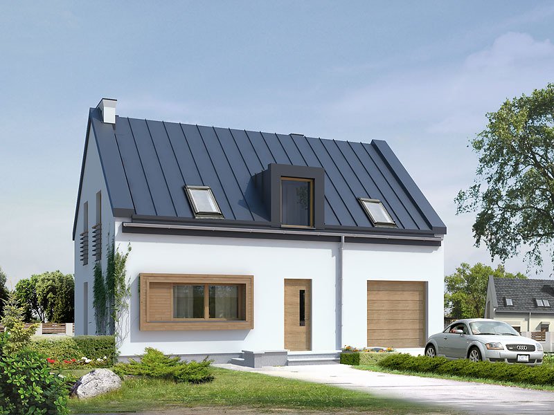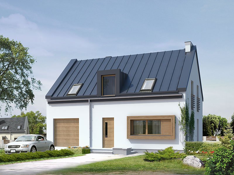 Ściany: 2-warstwowe - pustak ceramiczny + styropian, Stropy: żelbetowe, wylewane, Dach: blacha na rąbek stojący Classic Ruukki, kąt nachylenia 45°