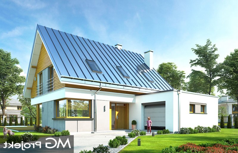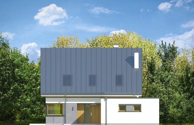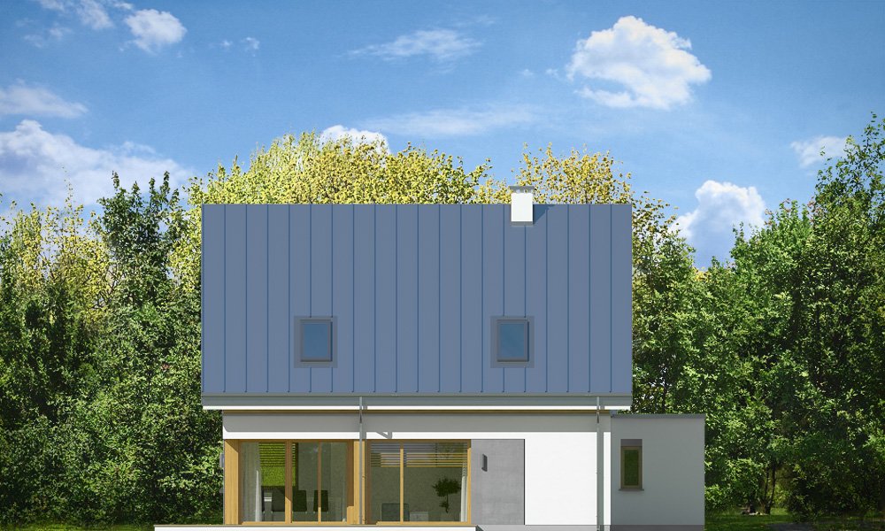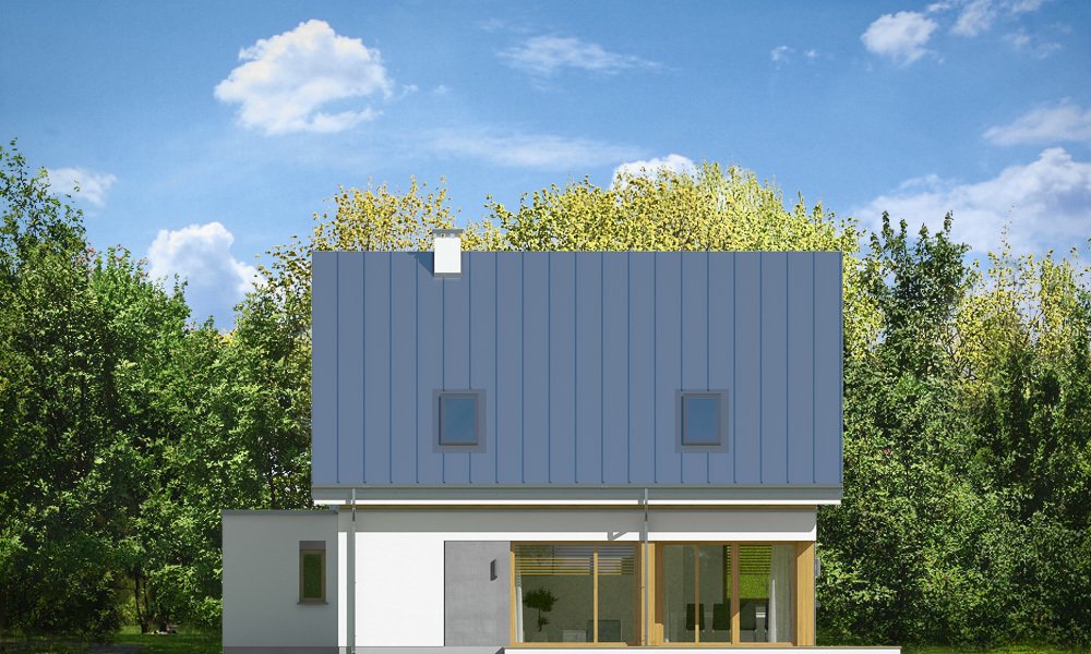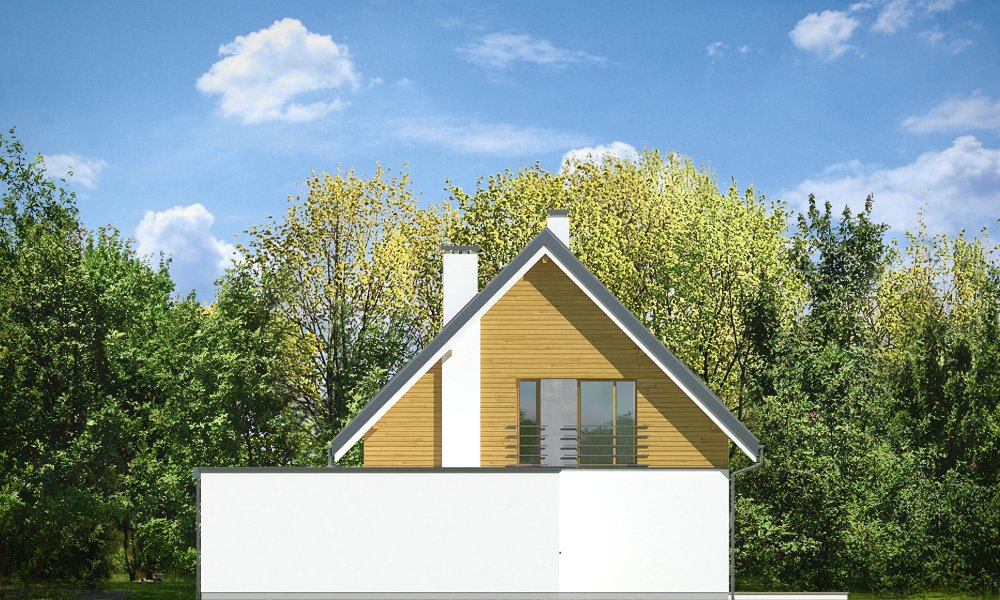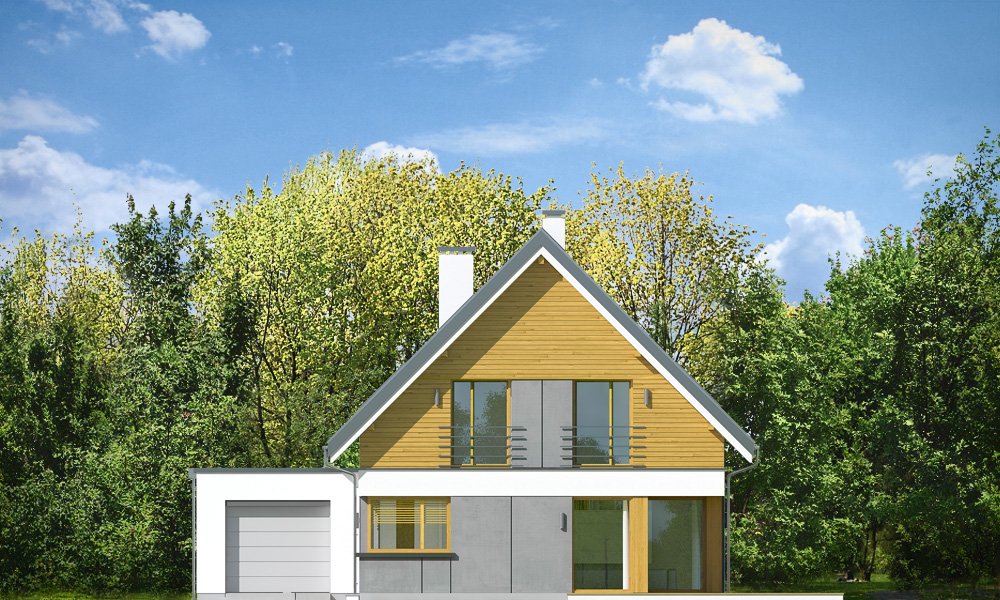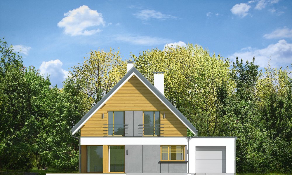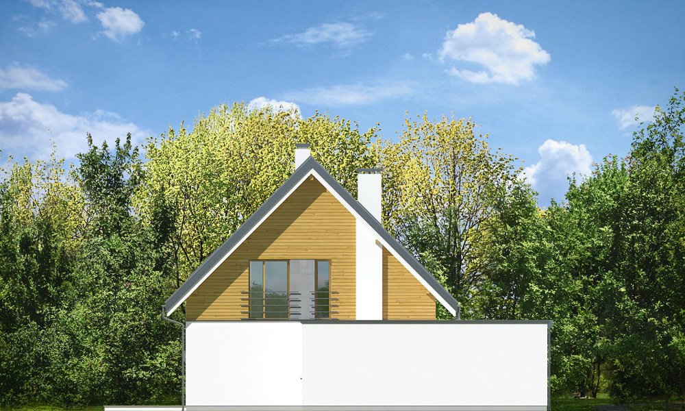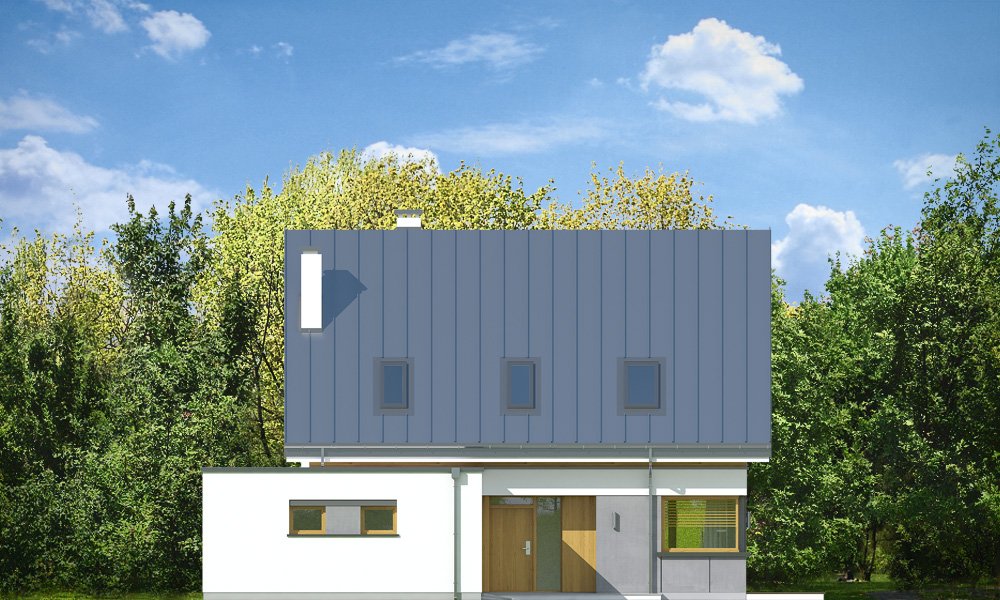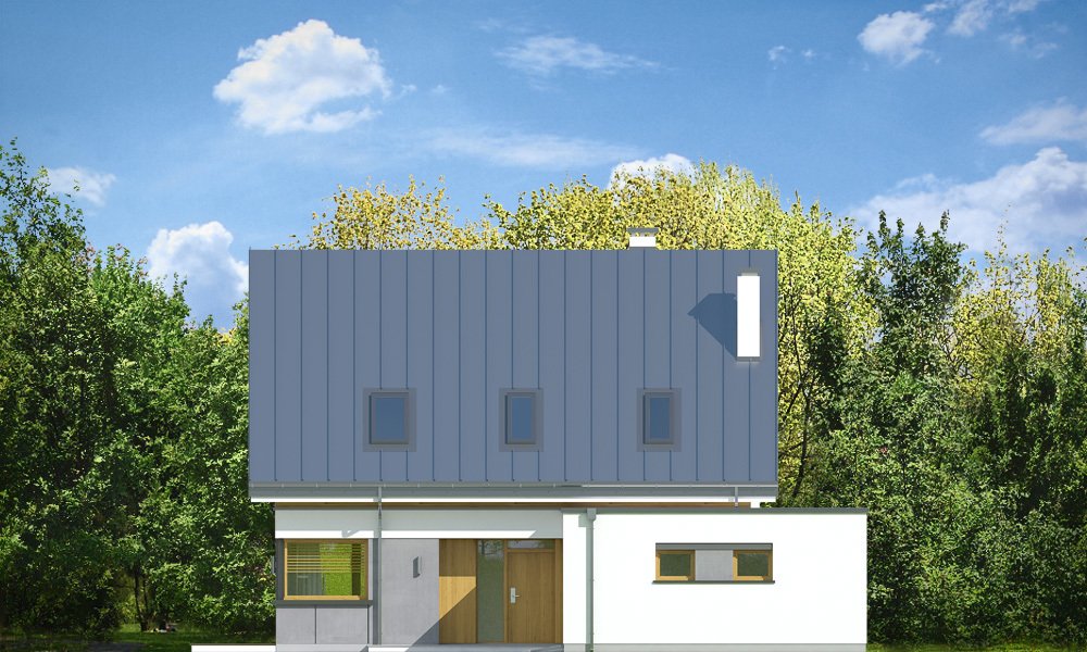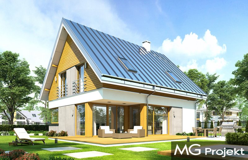 Viking 2 jest jednym z projektów z serii domów "Viking" - pomniejszoną wersją ze zwężoną bryłą główną i pojedynczym garażem. Budynek zaprojektowano na planie prostokąta, przykrytego dwuspadowym symetrycznym dachem, z dobudowanym parterowym garażem. Prosta nowoczesna architektura idzie w parze z funkcjonalnie zaprojektowanym wnętrzem. Front domu zaakcentowano szerokimi drzwiami wejściowym z bocznym naświetlem, umieszczonymi w podcieniu wejściowym, oraz narożnym dużym oknem kuchennym. Drzwi garażowe z boku pozwalają na stworzenie urokliwego placyku wjazdowego przed domem. Co więcej : dzięki temu budynek nadaje się zarówno na działkę z wjazdem od północy, jak i od strony południowej ( bramą garażową do drogi ). Podział elewacji na poziome pasy, okładziny z drewna i z płyt włókowo-cementowych urozmaicają sylwetkę domu. Od strony ogrodowej zaprojektowano duże przeszklenie z salonu i z jadalni, otwierające część dzienną na ogród, oraz ładny podcień zadaszający częściowo taras ogrodowy. Wnętrze : na parterze zaprojektowaliśmy jednoprzestrzenną powierzchnię z połączonych pomieszczeń salonu, jadalni, holu i kuchni ze spiżarnią. Przy schodach przechodzimy do części gospodarczej, z magazynem, kotłownią i garażem. Na poddaszu mamy trzy ładne sypialnie ( w tym sypialnię rodziców z garderobą ), oraz łazienkę z kącikiem na pralnię. Dom choć niewielki jest bardzo funkcjonalny. Będzie wygodnym miejscem do życia dla 3-5cioosobowej rodziny. Prosta konstrukcja budynku, łatwa zwarta bryła bez żadnych udziwnień, nowoczesne technologie i dobre ocieplenia dają energooszczędny, niedrogi w budowie i późniejszym utrzymaniu dom. Vikinga można bardzo łatwo dostosować do standardu NF40. Zapraszamy.