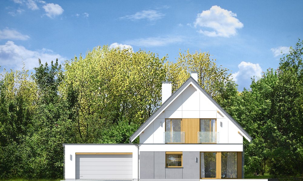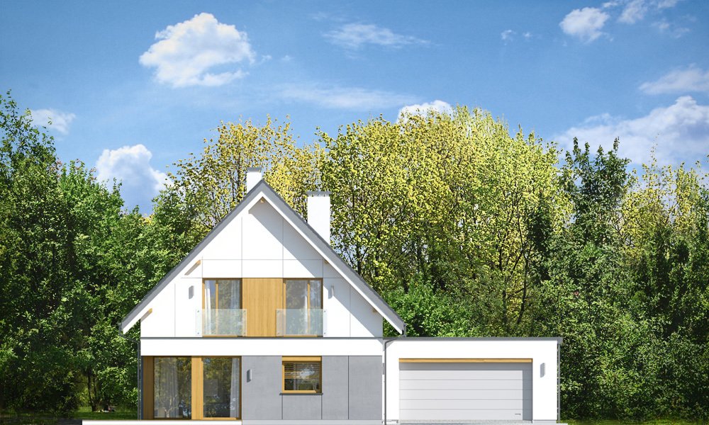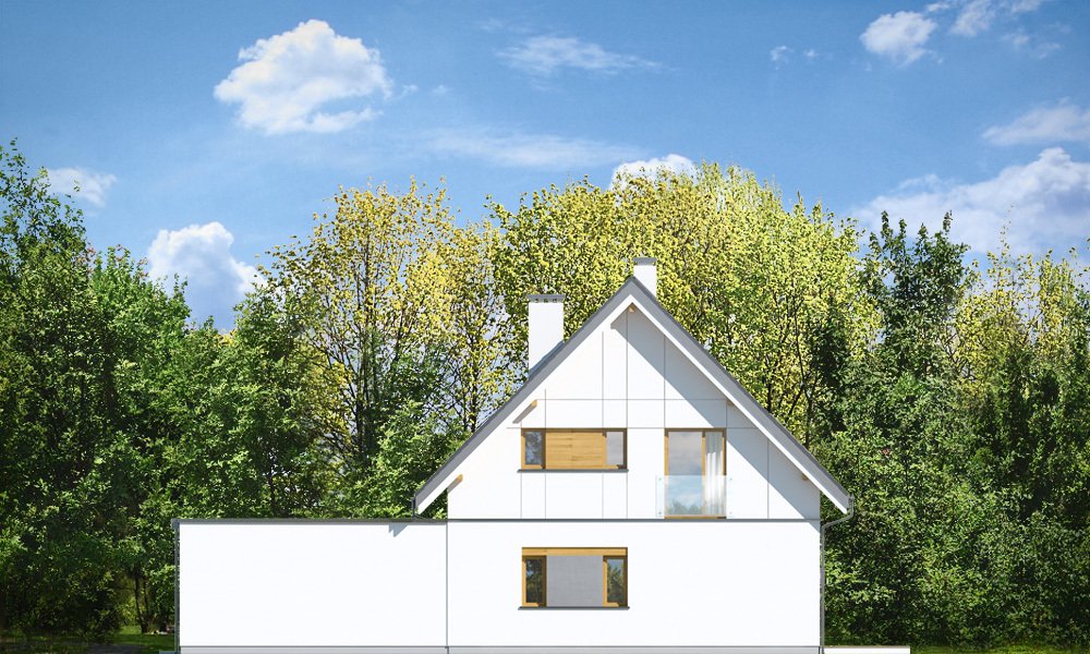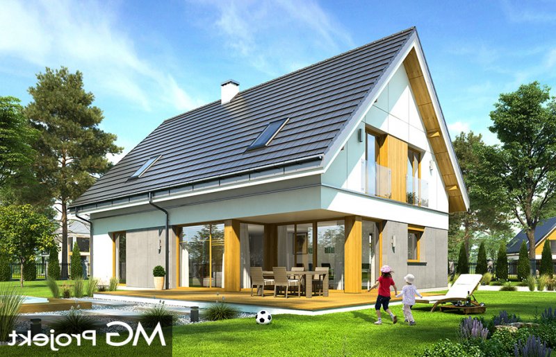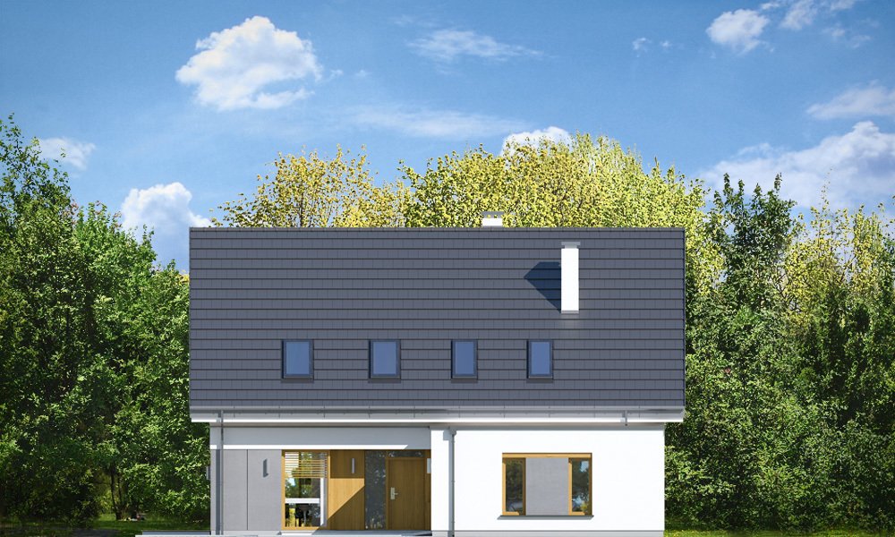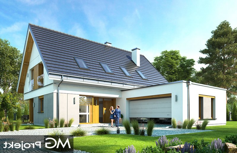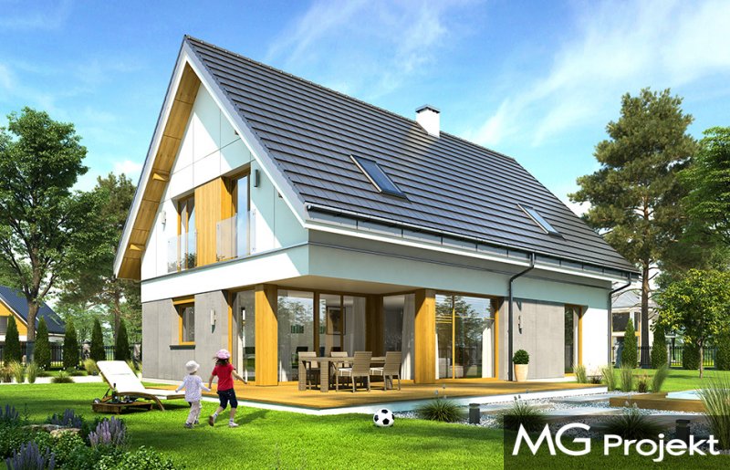 Viking to podstawowa bazowa wersja projektu z serii domów Viking. Jest to projekt parterowego budynku z poddaszem użytkowym, dla rodziny 4-6cioosobowej. Dom o prostej nowoczesnej bryle, energooszczędny, zbudowany na planie prostokąta, przykrytego dwuspadowym symetrycznym dachem, z dobudowanym parterowym garażem. Dzięki odpowiedniemu rozplanowaniu pomieszczeń i otworów okiennych i drzwiowych, nadaje się zarówno na działkę z drogą naprzeciwko wejścia ( równoległą do kalenicy ), jak i na działkę z wjazdem od południa ( wówczas wjazd znajduje się naprzeciwko wrót garażowych ). Nowoczesna architektura i funkcjonalne wnętrze przypadną do gustu osobom ceniącym rozsądek i maksymalny efekt w architekturze z zastosowaniem minimalistycznych środków. Front Vikinga zaakcentowany jest dużym przeszkleniem kuchni, oraz podcieniem z wejściowymi drzwiami z bocznym naświetlem. Ściany frontowa i garażowa tworzą wejściowo-wjazdowy placyk –dziedziniec. Dzięki takiemu rozwiązaniu przed domem znajdzie się sporo miejsca na wygodny podjazd, parking, oraz reprezentacyjną zieleń. Z tyłu domu królują duże przeszklenia salonu i jadalni otwierające wnętrze parteru na ogród, oraz wygodny podcień będący zadaszeniem części tarasu. Wnętrze podzielono część dzienną i gospodarczą na parterze, oraz sypialnie na poddaszu. Na parterze zaprojektowano jednoprzestrzenne wnętrze salonu, jadalni i holu, z częściowo otwartą na jadalnię kuchnią ze spiżarką. |Obok salonu znajduje się dodatkowy pokój : gabinet lub sypialnia gościnna i łazienka, a obok schodów przechodzimy do części gospodarczej, z pomieszczeniem gospodarczym, kotłownią i dwustanowiskowym garażem. Na poddaszu zaprojektowano dwie duże sypialnie dziecięce z szafami wbudowanymi, łazienkę, pralnię, oraz osobny apartament rodziców, z dwiema garderobami i oddzielną dużą łazienką. Dom jest bardzo wygodny i komfortowy. Jednocześnie jego prosta bryła i konstrukcja pozwoli na sprawną w niedrogą budowę, a energooszczędne rozwiązania i zwartość bryły budynku - na niewysokie koszty utrzymania domu. Dom można łatwo dostosować do standardu NF40. Zapraszamy.
