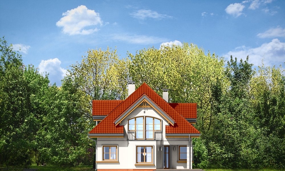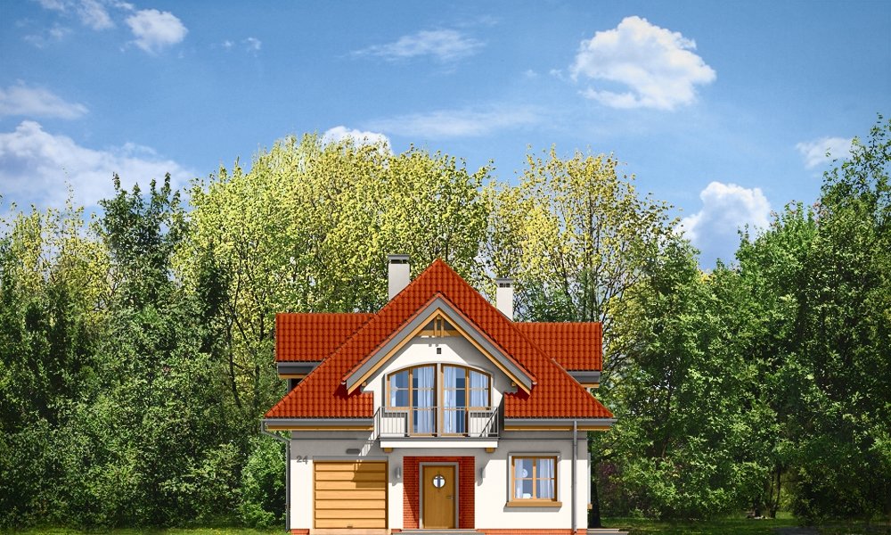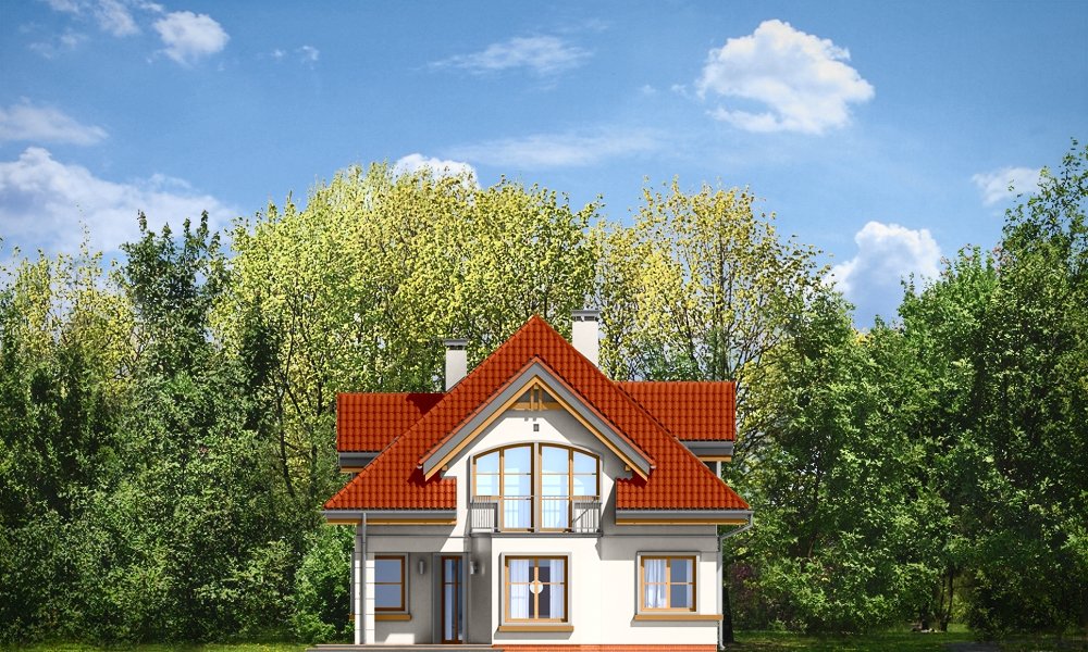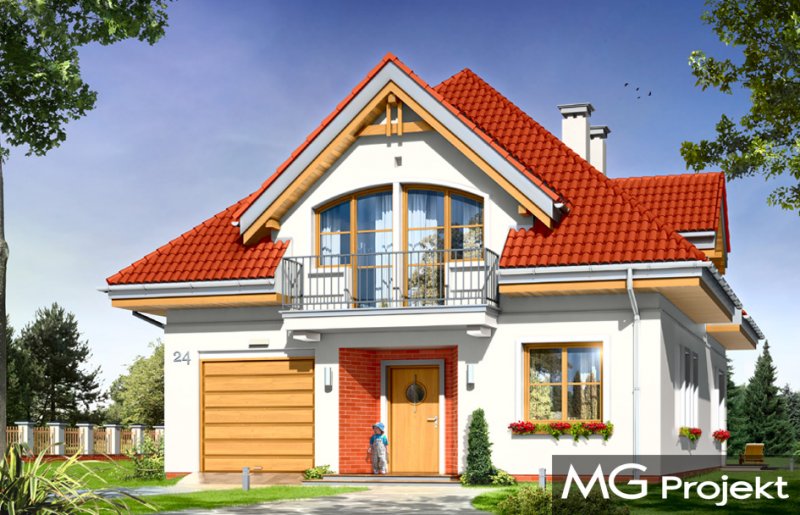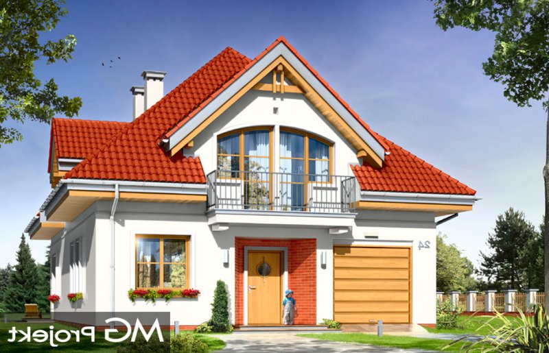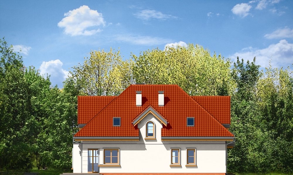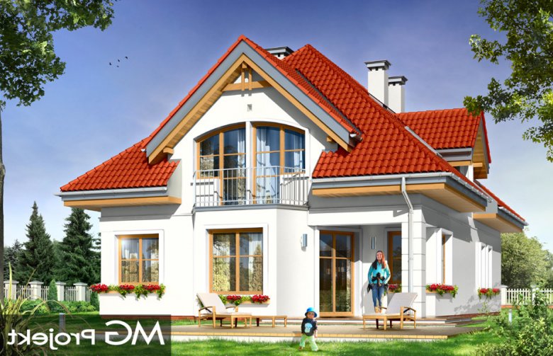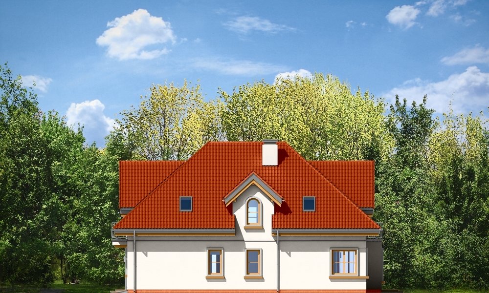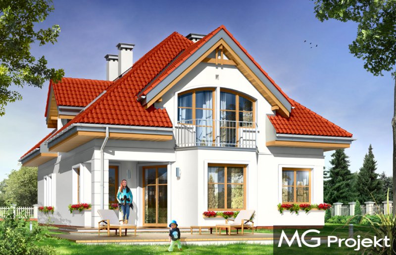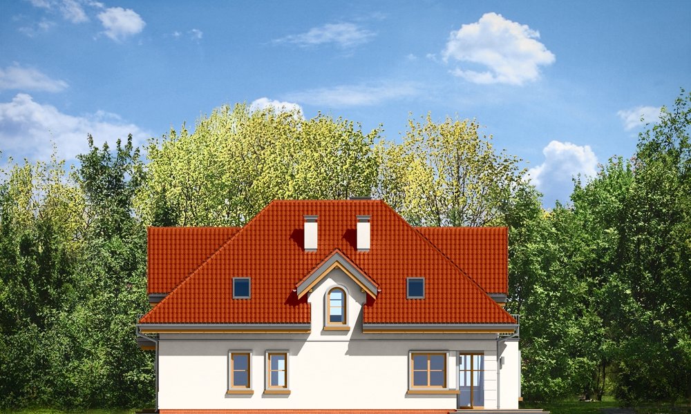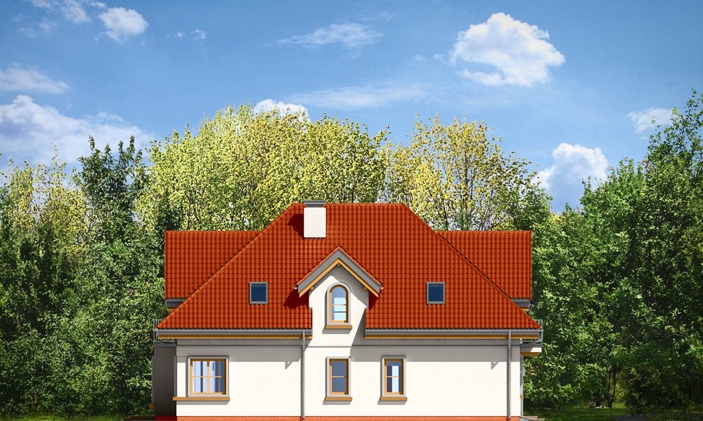 Weronika to uroczy domek jednorodzinny dla cztero-pięcioosobowej rodziny, parterowy z poddaszem użytkowym, zbudowany na planie prostokąta, przekryty czterospadowym dachem. Projekt dedykowany jest Inwestorom posiadającym dość wąską działkę, chcącym mimo to zbudować zgrabny, ładny dom nie przypominający „tramwaju”. Spokojna w wyrazie architektura domu łączy w sobie tradycyjną formą ze współczesnymi detalami i nowoczesnymi materiałami oraz kolorystyką. Front domu zdobi duża symetryczna lukarna z balkonem będącym jednocześnie zadaszeniem podestu wejściowego. Wejście zaakcentowano podcieniem wykończonym klinkierem. Elewację ogrodową zdobi podobna lukarna z balkonem, oraz wykusz aneksu jadalnego, oraz podcień salonu, przekrywający część tarasu. Wnętrze podzielono na część dzienną i pomieszczenia techniczne na parterze, oraz pokoje sypialne na poddaszu. Na dole, bardzo ładne wnętrze, z eleganckim holem z reprezentacyjnymi schodami, przechodzi w salon z ciekawie zaprojektowanym aneksem jadalnym z widokiem na ogród, oraz otwartą na salon kuchnią. W pobliżu wejścia znajduje się dodatkowy pokój – gabinet lub extra sypialnia. Na parterze znajdują się też: wbudowany w bryłę garaż, oraz kotłownia. Na poddaszu zaprojektowano cztery sypialnie, dużą wspólną łazienkę i garderobę dostępną z holu. W łatwy sposób można zamienić ogrodowe sypialnie na apartament rodziców z osobną łazienką i garderobą – jeśli jest taka potrzeba. Nad poddaszem znajduje się duży, bardzo przydatny strych. Weronika jest budynkiem o prostej konstrukcji, niedrogim w realizacji, energooszczędnym. Dom pasować będzie na wąską działkę. Pracownia posiada wersję odbicia lustrzanego projektu.