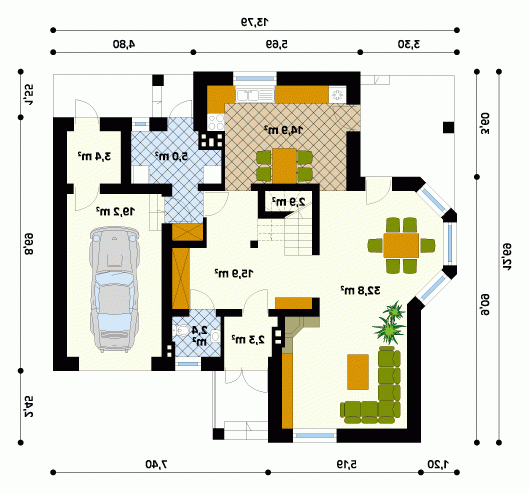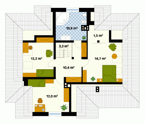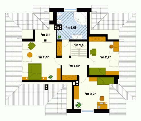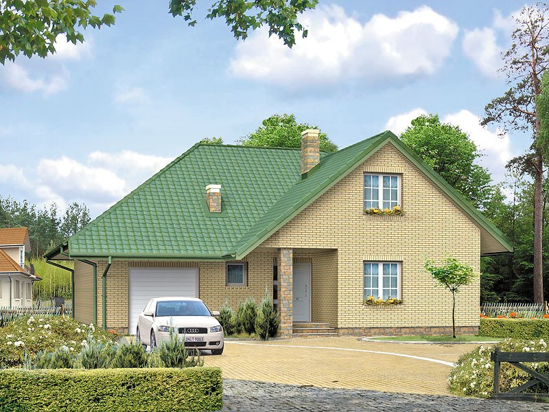 Dom jednorodzinny, parterowy, z użytkowym poddaszem, niepodpiwniczony. Na parterze duży korytarz i wygodna część dzienna z zadaszonym tarasem. Na poddaszu trzy sypialnie z łazienką. Wygodny dom dla 4 – 5 osób. Garaż oraz pomieszczenie gospodarcze z przejściem do domu i ogrodu.