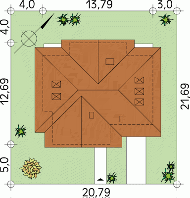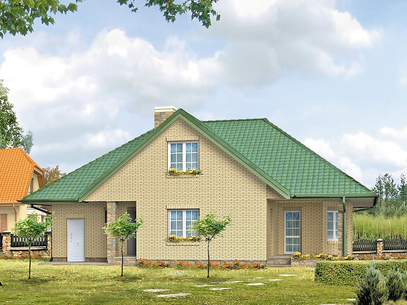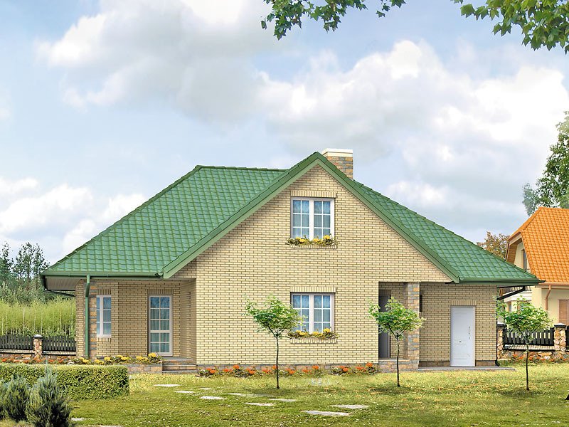 Ściany: 3-warstwowe - bloczek silikatowy lub pustak ceramiczny, Stropy: żelbetowe, wylewane, Dach: dachówka, kąt nachylenia 38°