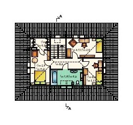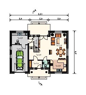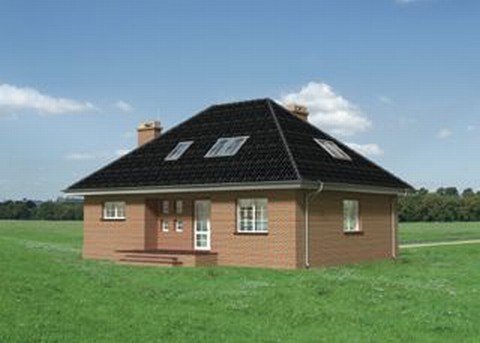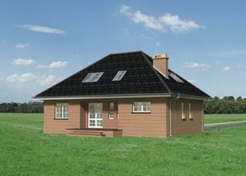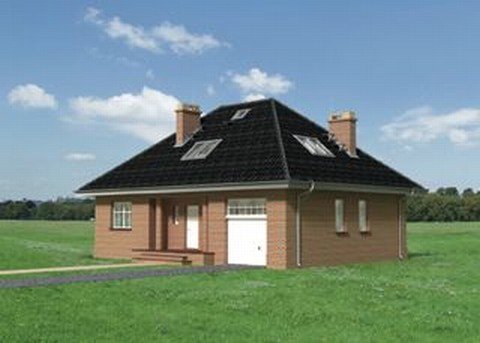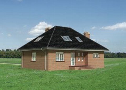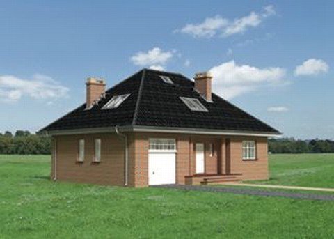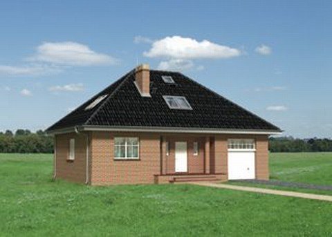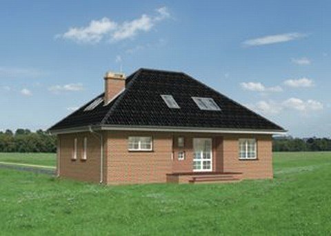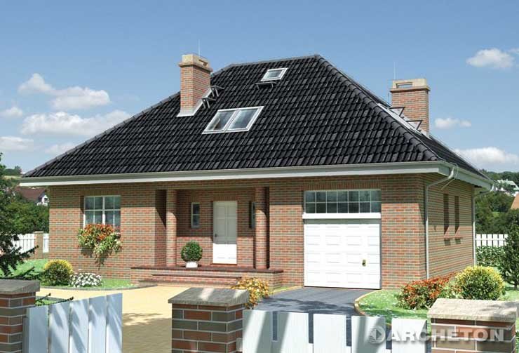 Dom parterowy, z użytkowym poddaszem, niepodpiwniczony, z garażem. Na parterze znajdują się: sień, hol, w.c., kuchnia, pokój dzienny z jadalnią, kotłownia z pralnią, z której jest przejście do garażu. Na poddaszu zlokalizowano 3 pokoje sypialne (jeden z garderobą), łazienkę oraz przedpokój. Bryłę stanowi prostopadłościan nakryty dachem czterospadowym o kącie nachylenia 40°. Urozmaicają ją dwa podcienie: wejściowy i ogrodowy.