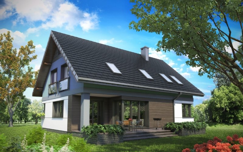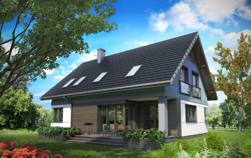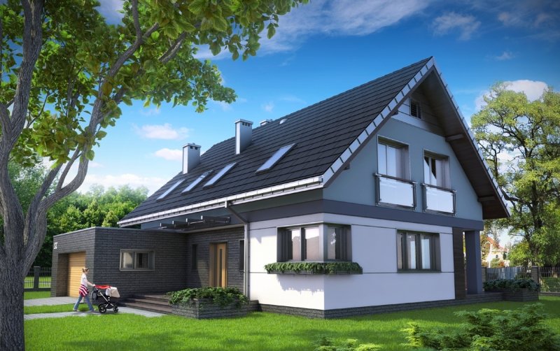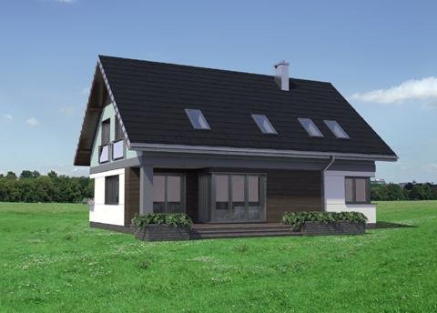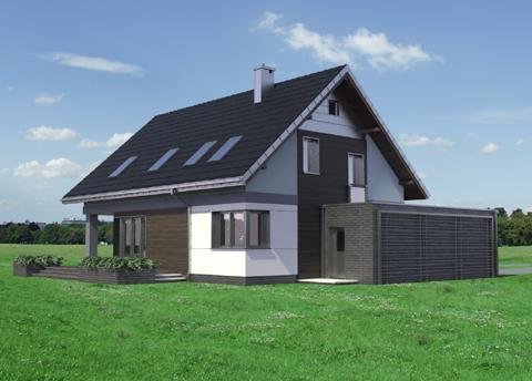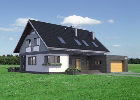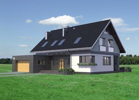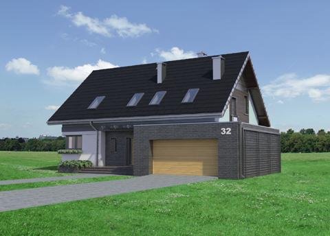Na rzucie litery L, projekty domów parterowych z użytkowym poddaszem powstają niemal równie często, jak na prostokątnym. Ale Zenon, w odróżnieniu od innych, tego typu koncepcji, pokazuje ciekawe przekrycie złożonej bryły. Dwuspadowy dach zamyka skrzydło mieszkalne, a kostka, wsunięta częściowo pod okap od frontu, mieści dwustanowiskowy garaż z kotłownią.