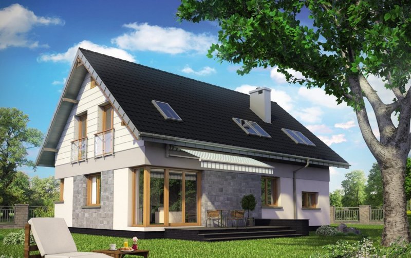 Projekt domu Zoltan Neo to niewielki parterowy dom zespolony z garażem. Mieści kompletne mieszkanie na parterze oraz wykorzystuje miejsce pod dwuspadowym dachem nad całym budynkiem, tak jak zbliżone rozwiązania z rodzin Heleny, Zofii i Zoi. Pokój dzienny z jadalnią, kuchnia, gabinet, łazienka oraz przejście pod schodami do garażu i kotłowni uzupełniają na poddaszu 4 wygodne sypialnie. Główną z nich z własną łazienką, nad garażem, oddzielono różnicą poziomów. Projekt domu Zoltan Neo jest najmniejszy w Rodzinie Zoltana i ma najprostszą, najbardziej energooszczędną bryłę bez lukarn w dachu, ryzalitu w ścianie bocznej i bez balkonów. Zwarty, prostokątny obrys obu części budynku przekryto wspólną, dwuspadową konstrukcją dachu z kalenicą równoległą do drogi dojazdowej. Od Zofii, Zoi i Heleny Rodzinę Zoltana odróżnia prostszy zarys detali (np. ryzalitu z jadalnią, który występuje w pozostałych jej wariantach proponujących także większe powierzchnie oraz czterospadowy dach w wersji Karo). W projekcie domu Zoltan Neo, jako w jedynym w rodzinie, wejście frontowe akcentuje wnęka wysuniętej nieco ku wjazdowi na działkę części garażowej i przedłużony okap.