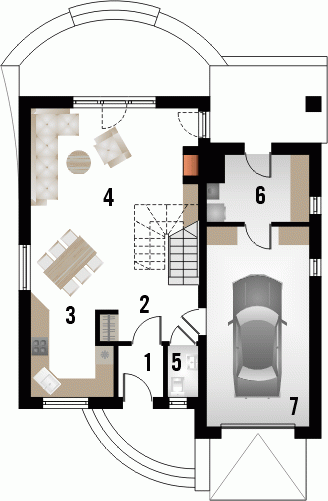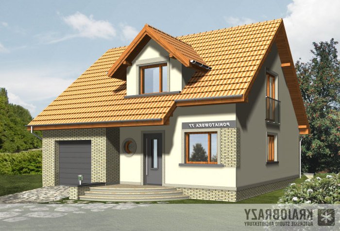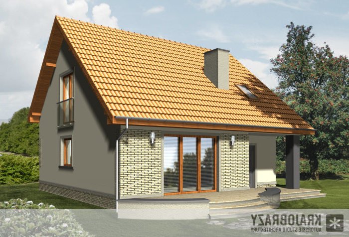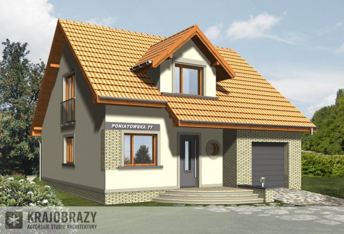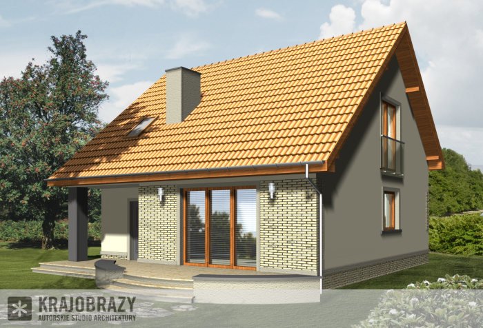 Dom jednorodzinny z grupy projektów nowoczesnych autorstwa pracowni KRAJOBRAZY. Atrakcyjny schemat funkcjonalny budynku został zamknięty w bryle o nowoczesnych detalach. Odpowiednio dobrane materiały wykończeniowe oraz kolorystyka zewnętrzna sprawiają, że dom wygląda współcześnie i będzie dobrze się prezentował w prawie każdym otoczeniu.