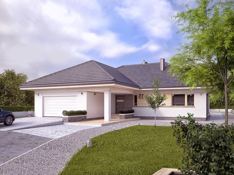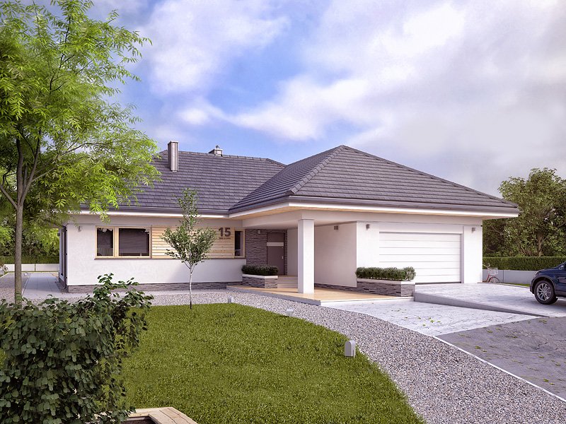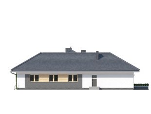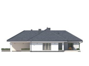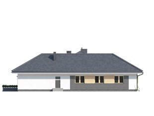 Ambrozja 6 to projekt parterowego domu spełniającego potrzeby 4-5 osobowej rodziny. Wyraźnie rysuje się podział na przestronną strefę dzienną i przytulną część prywatną. Otwarta, jasna kuchnia posiada dodatkowy atut w postaci spiżarni. Główna sypialnia zaprojektowana jako kompleks pomieszczeń z własną łazienką i garderobą, zagwarantuje pełną prywatność gospodarzom. Zadaszony taras umożliwia spędzanie czasu na świeżym powietrzu niezależnie od warunków pogodowych.