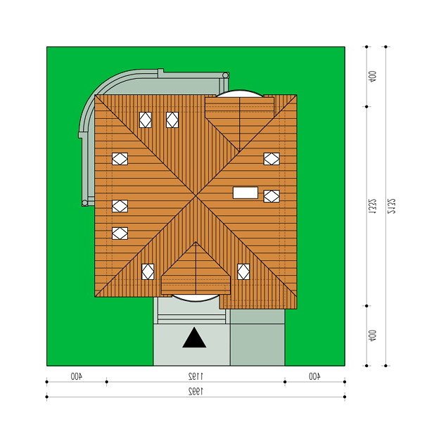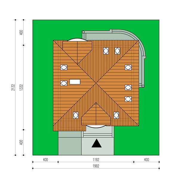 Dom posiada prosty układ - główna część domu na planie kwadratu z wysuniętym garażem. Małe skomplikowanie bryły i przekrycie czterospadowym dachem o jednakowym nachyleniu połaci sprawia, że jest łatwy w realizacji, a przez to tańszy.