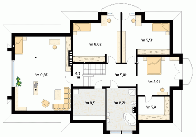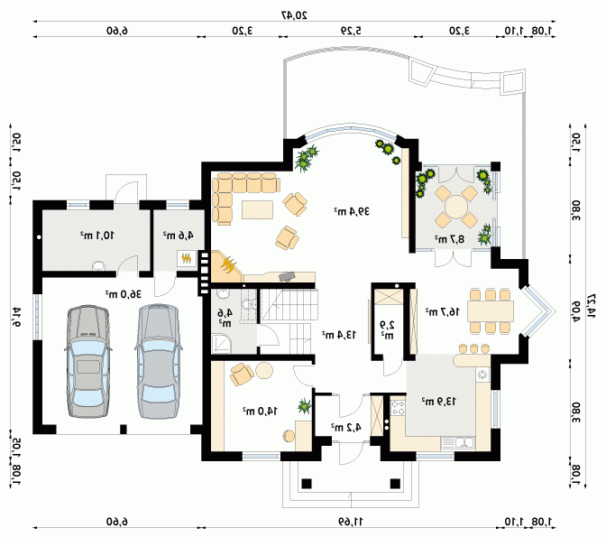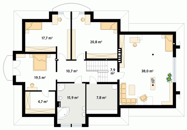 Dom o klasycznych proporcjach przeznaczony dla 4 – 5-osobowej rodziny. Przestronny parter z dodatkowym gabinetem. Na osi wejścia zaprojektowano w pokoju duże przeszklone okno z widokiem na ogród. Reprezentacyjny dom o rozbudowanej funkcji ucieszy wymagającego użytkownika.