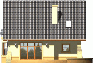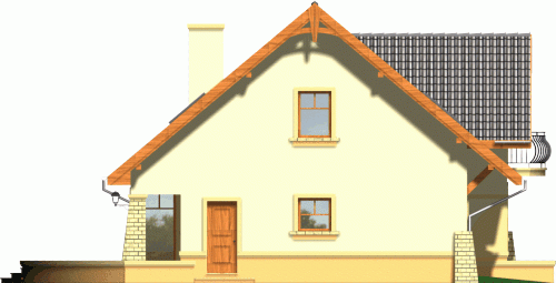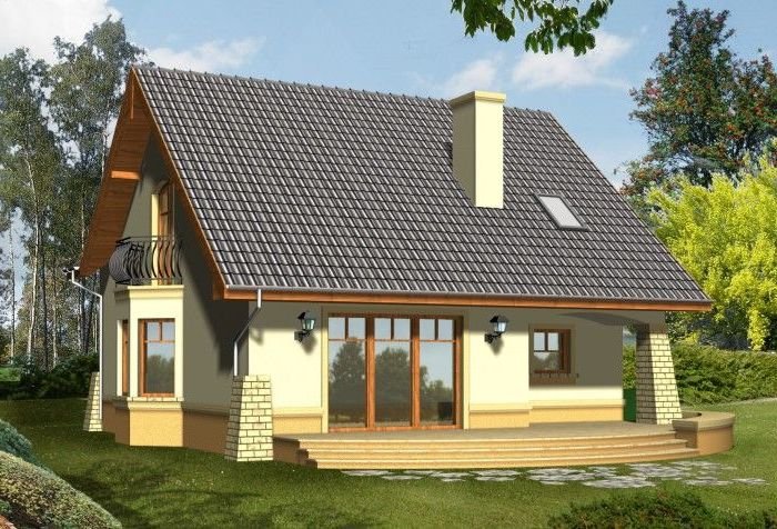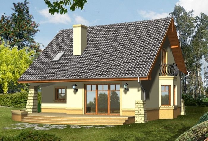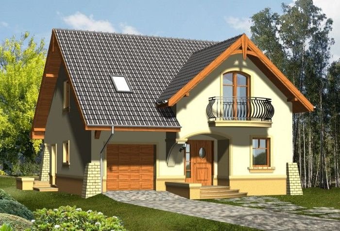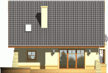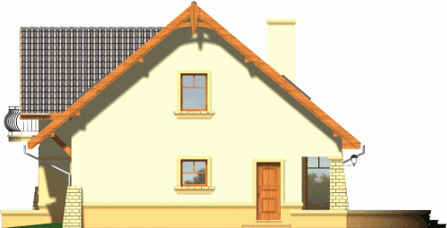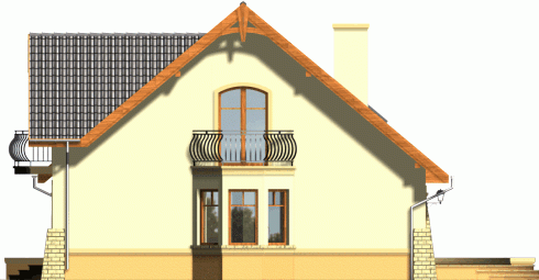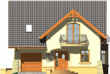 Klasyczny dom z dachem dwuspadowym z garażem w bryle budynku. Front budynku przykuwa uwagę reprezentacyjnym wejściem i atrakcyjnym balkonem z sypialni na poddaszu. Od strony ogrodu do budynku przylega częściowo zadaszony taras.