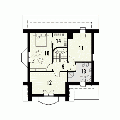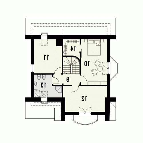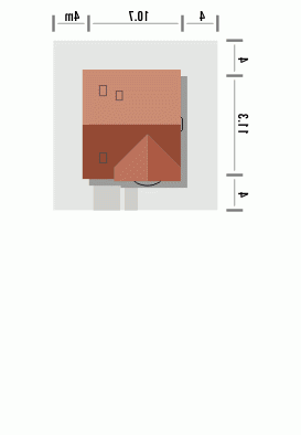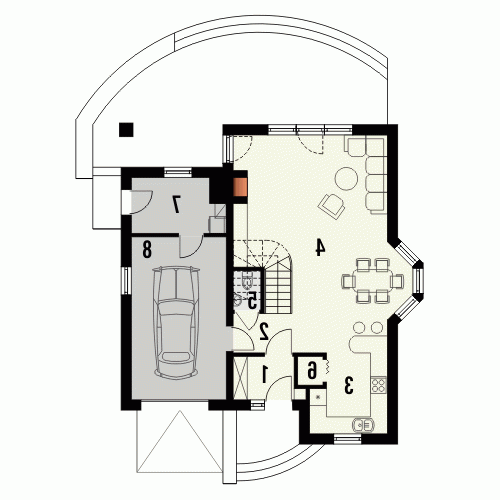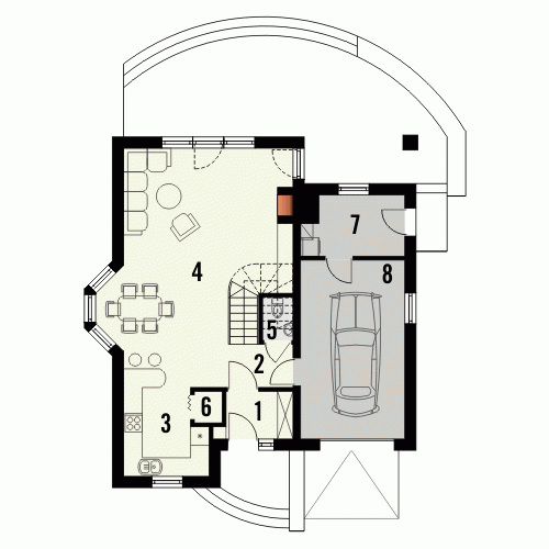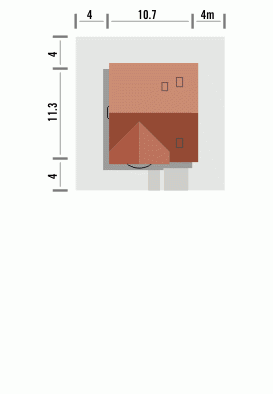 Budynek niepodpiwniczony piętrowy z garażem. Na parterze zaprojektowano pokój dzienny z jadalnią i kuchnię ze spiżarką oraz pom. gospodarcze i wc. Na poddaszu znajdują się trzy pokoje w tym jeden z dużym łukowym oknem oraz łazienka. Dokumentacja dostępna również w odbiciu lustrzanym.