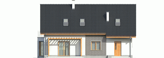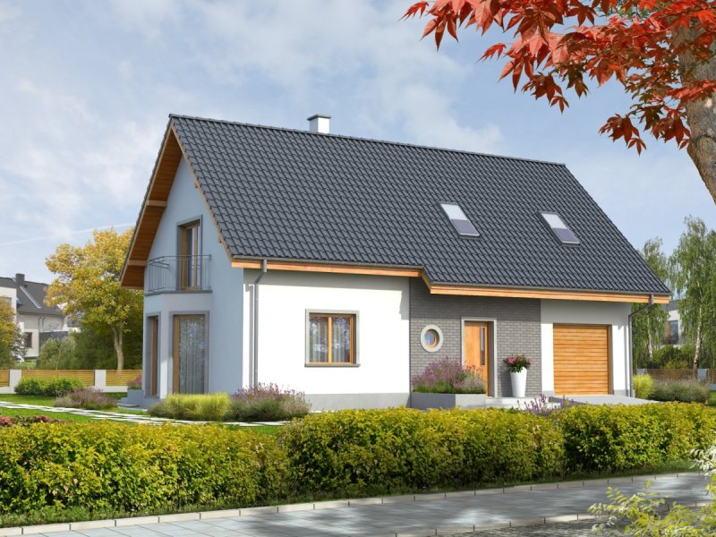 Dom parterowy z poddaszem użytkowym, niepodpiwniczony z garażem, przeznaczony dla 3-4 osobowej rodziny. Dom Ben II G1 jest większą wersją projektu Ben G1 . Wyróżnia go klasyczna forma oraz nieskomplikowana bryła. Ze względu na ergonomiczne wnętrze dom ten, z całą pewnością można umieścić w kategorii domów energooszczędnych. Okładzina klinkierowa wkomponowana w elewację budynku dodaje mu niepowtarzalnego uroku, tworząc ciekawy kontrast z szykowną bielą tynku. Dom Ben II G1 cechuje ponadto klarowny podział funkcjonalny ¬ na parterze znajduje się strefa dzienna z pokojem dziennym wraz z jadalnią, dużą kuchnią i spiżarnią, pomieszczeniem gospodarczym, a także łazienką. Atutem jest także obecność osobnego gabinetu, gdzie można spokojnie poświęcać się pracy. W razie potrzeby można urządzić w nim pokój dla gości. Poddasze przeznaczono na strefę nocną, którą tworzy sypialnia z garderobą, dwa wygodne pokoje, łazienka oraz garderoba.