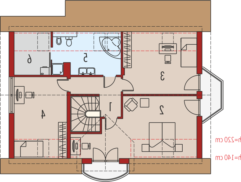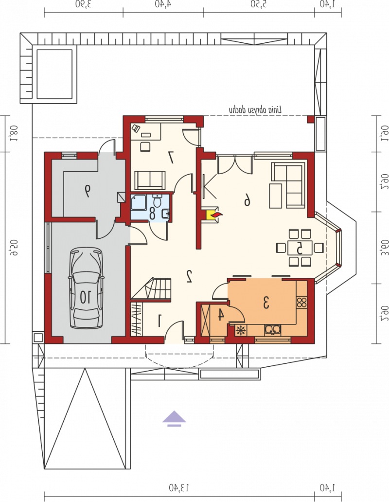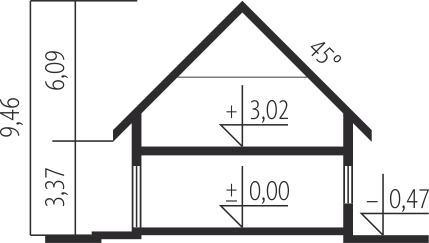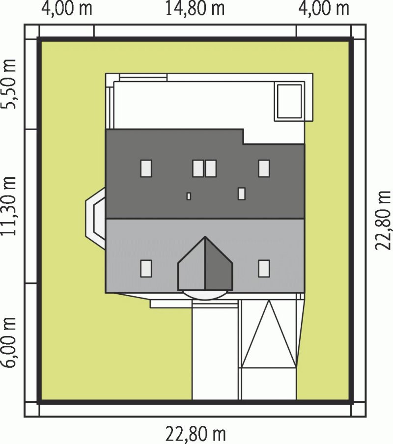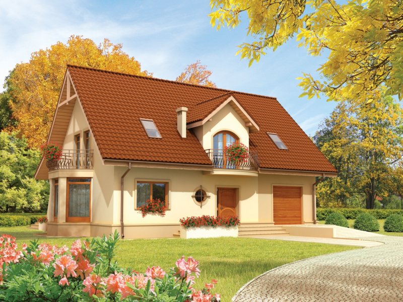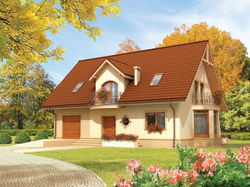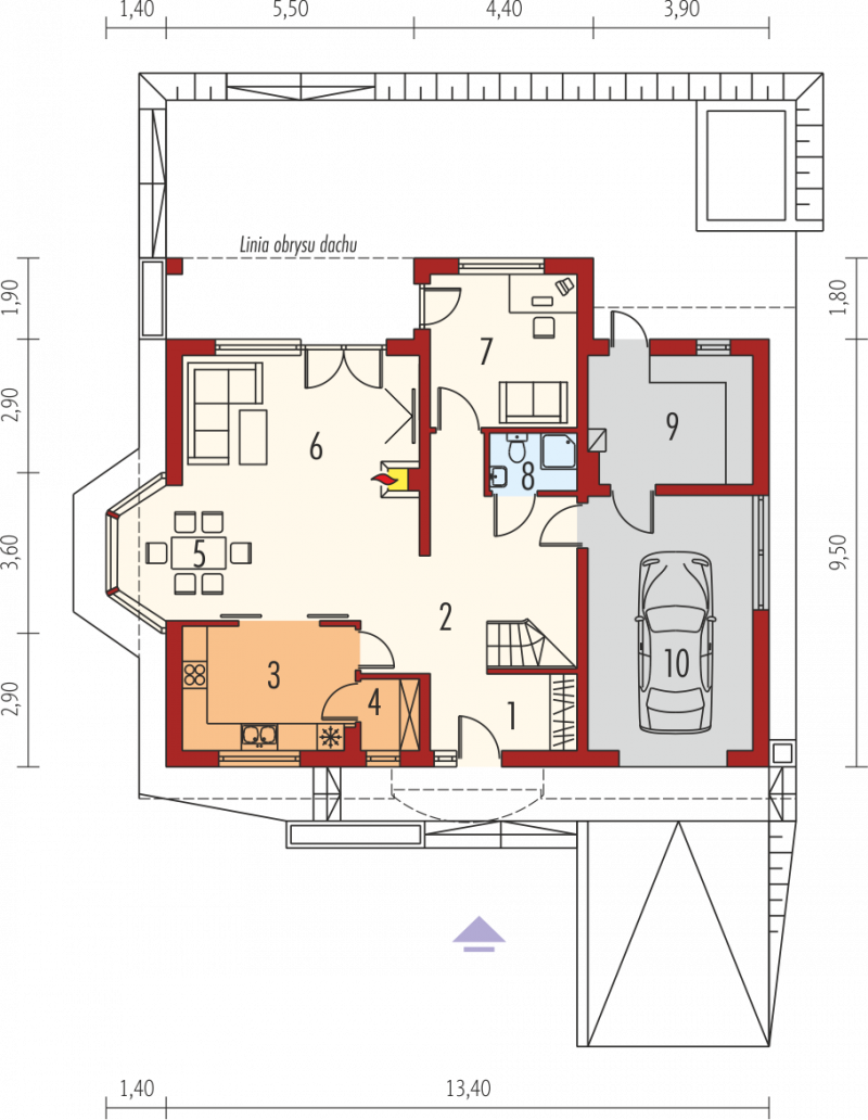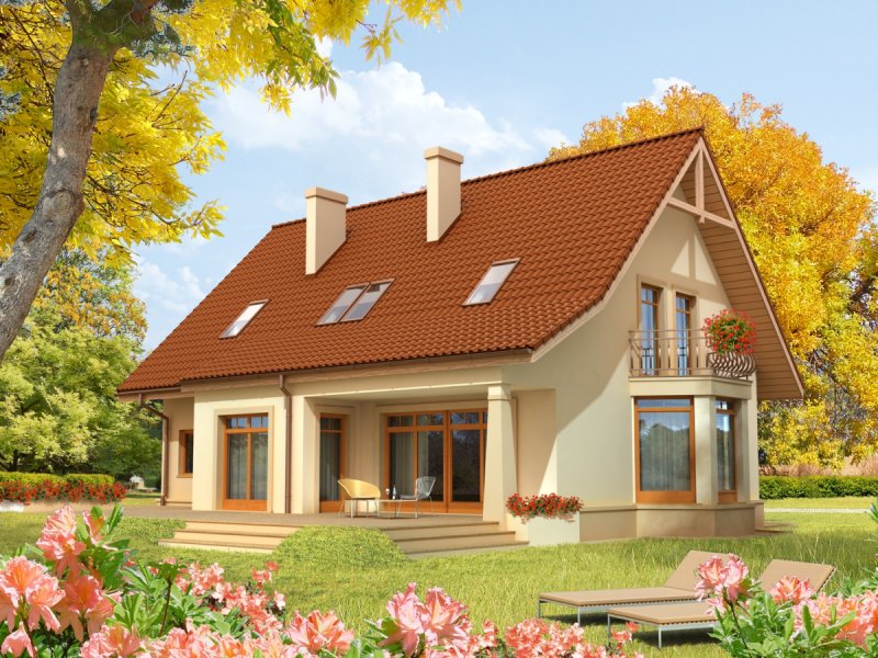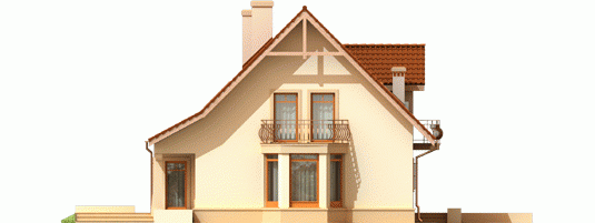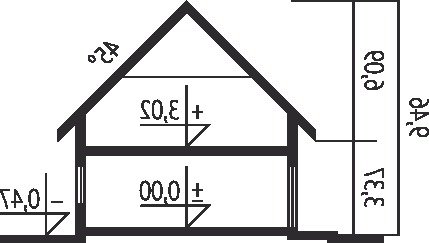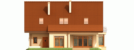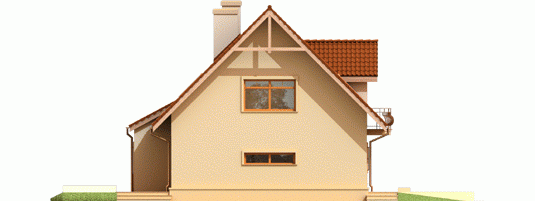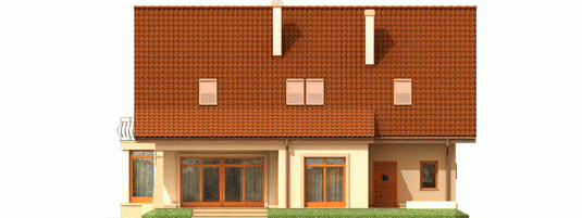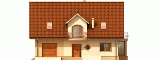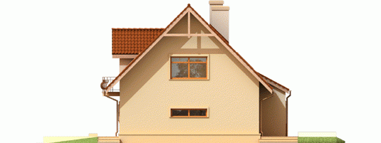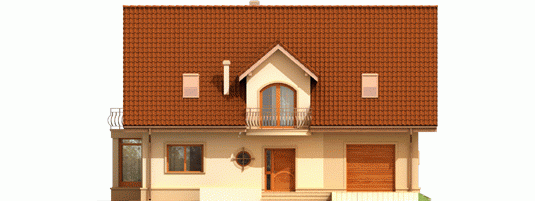 Dom parterowy z użytkowym poddaszem, niepodpiwniczony, przeznaczony dla 4-5-osobowej rodziny. Ciekawa architektura o eleganckiej linii to tylko jeden z atutów tego projektu. Parter został podzielony na trzy części. Trzon stanowi wiatrołap, klatka schodowa oraz gabinet i łazienka. Lewa część to przestronny pokój dzienny z jadalnią w przeszklonym wykuszu oraz częściowo otwarta kuchnia z praktyczną spiżarką. Prawa to część gospodarcza z garażem. Na poddaszu zaprojektowane zostały dwa pokoje, sypialnia oraz duża łazienka z dostępem do pralni.