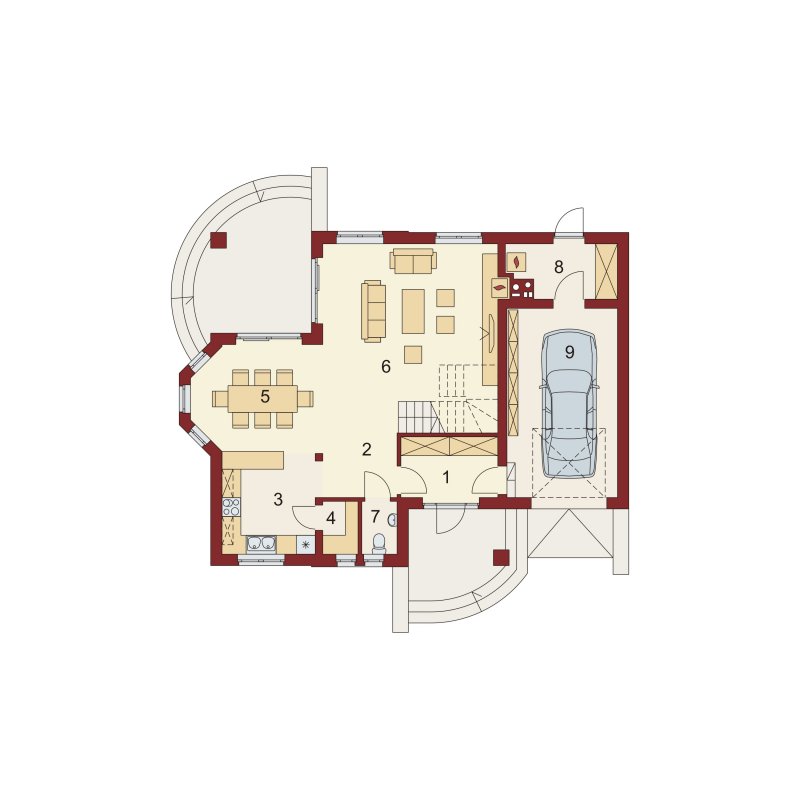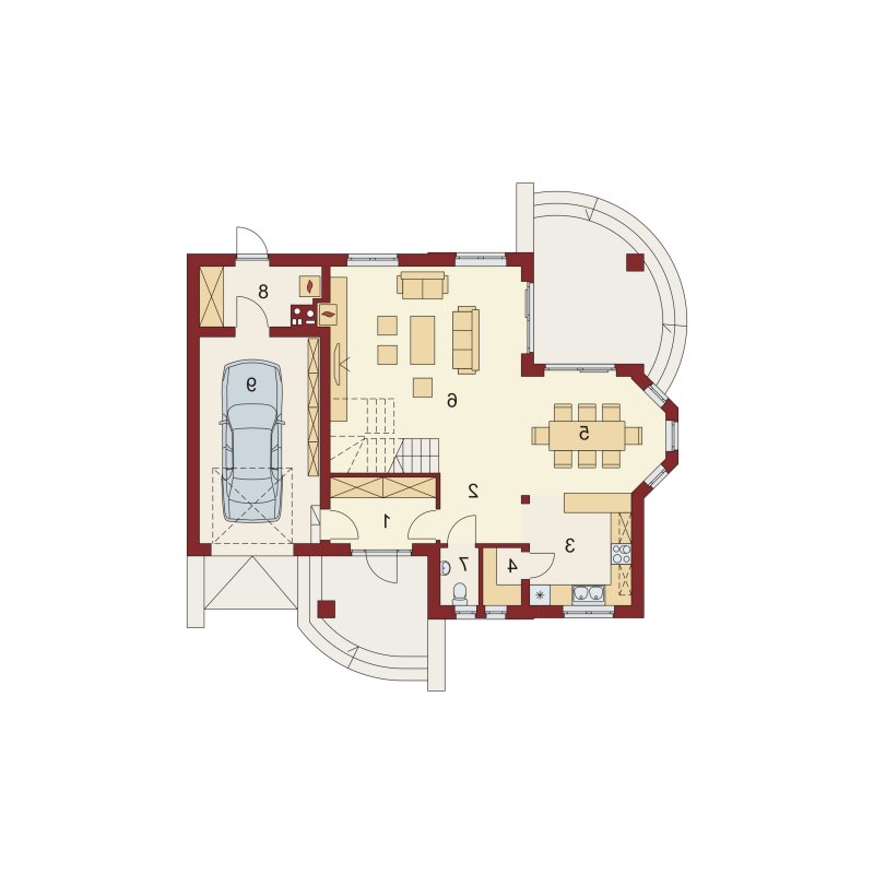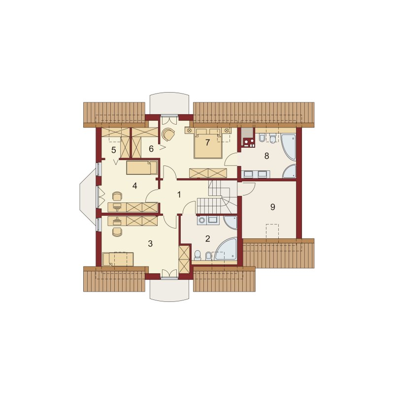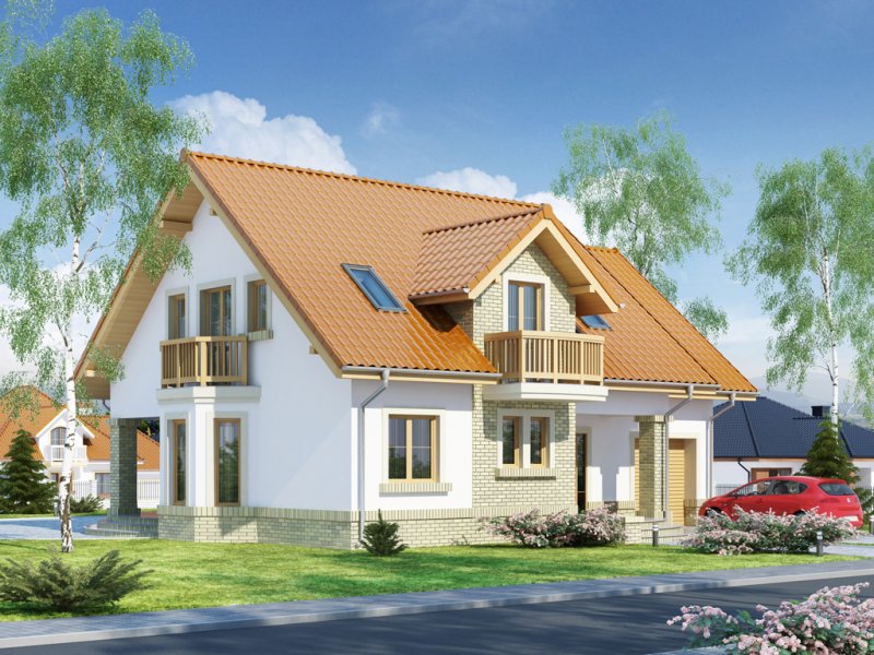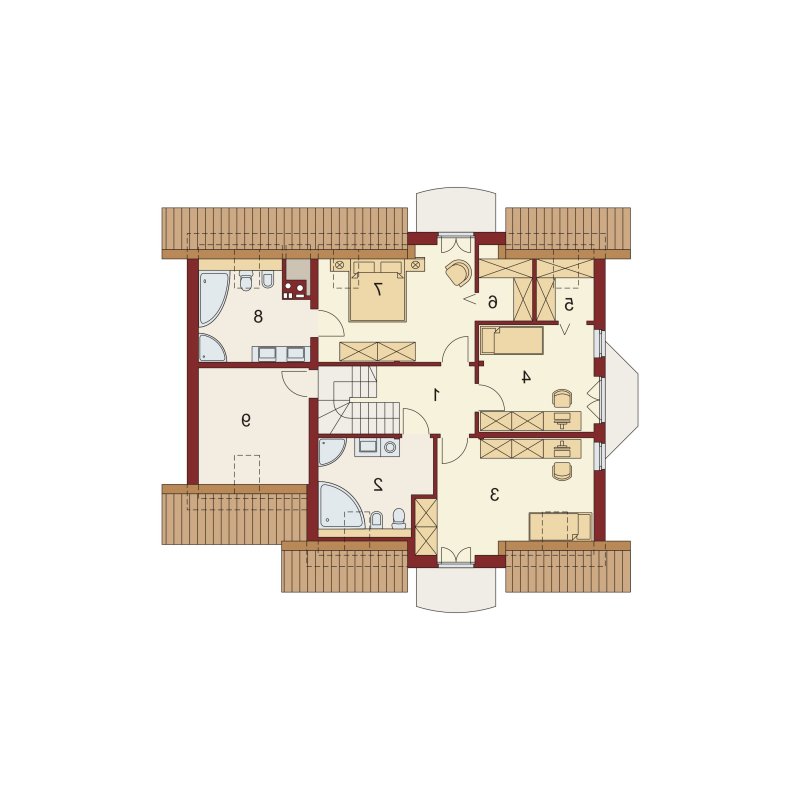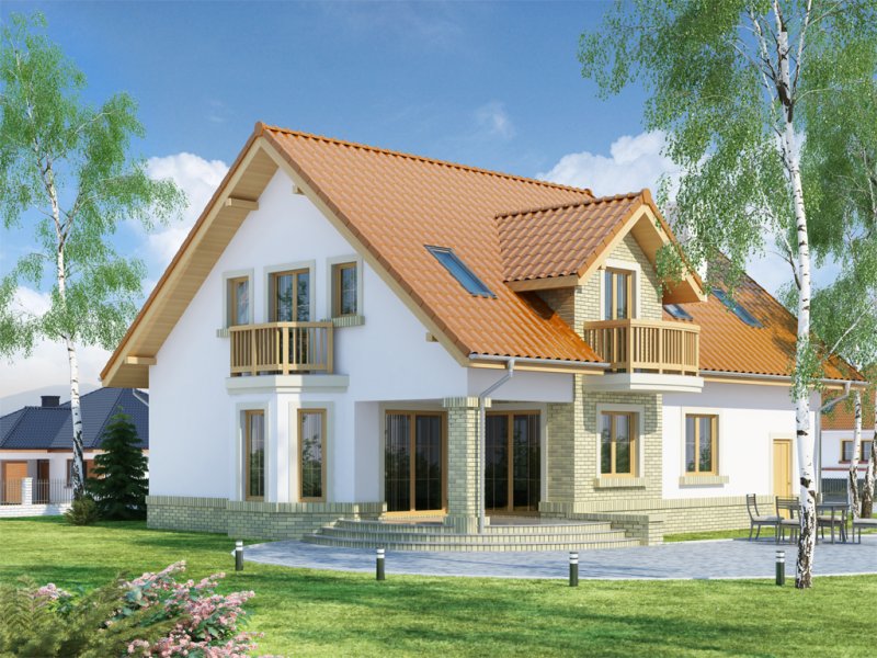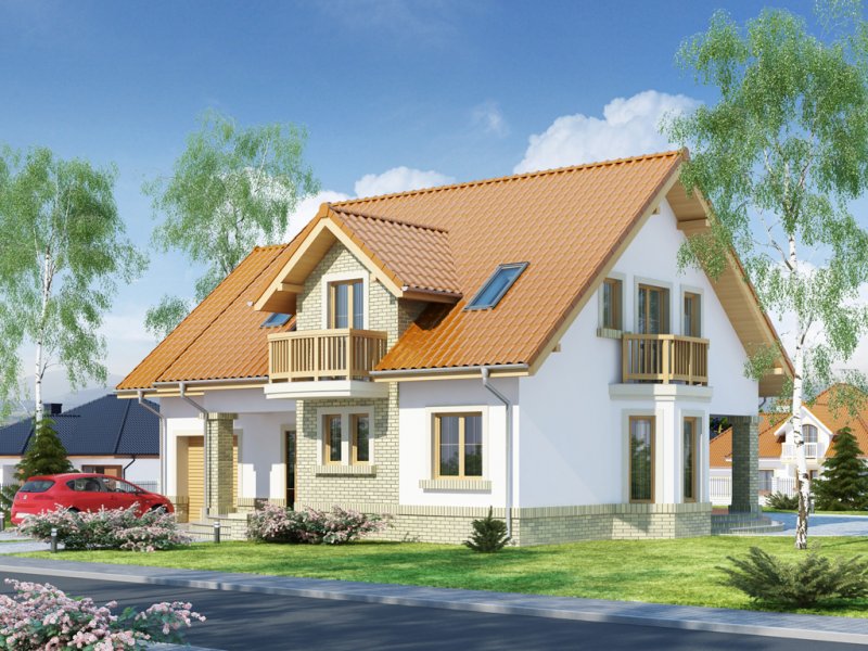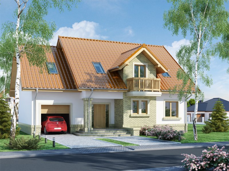 Bonita to funkcjonalny dom o tradycyjnej bryle, przeznaczony dla 4-osobowej rodziny. Mijając zadaszone wejście, trafiamy do ustawnego wiatrołapu z miejscem na szafy pod zabudowę. Wiatrołap dzieli strefę dzienną domu ze strefą gospodarczą. W skład strefy dziennej wchodzi oświetlona wieloma przeszkleniami jadalnia umieszczona w wykuszu, salon z przytulnym kominkiem i widokiem na zadaszony taras, otwarta kuchnia z praktyczną spiżarnią oraz wc. Zwolennicy kuchni zamkniętych, dzięki zastosowaniu ścianki działowej, mają możliwość wydzielenia samej kuchni lub całej części kuchenno-jadalnianej. Według potrzeb domowników, istnieje możliwość przekształcenia wc w łazienkę kosztem spiżarni. Dostęp na taras przewidziano zarówno z salonu jak i strefy jadalni. Część gospodarcza domu to jednostanowiskowy garaż oraz pomieszczenie gospodarcze/kotłownia wyposażone w dodatkowe wyjście na ogród. Na poddaszu znajduje się strefa nocna domu, która składa się z trzech sypialni, ogólnodostępnej łazienki oraz strychu. Dwa pokoje zaprojektowano z odrębną garderobą, dodatkowo jedna z sypialni posiada indywidualną łazienkę. Strych dostępny z półpiętra można w ramach adaptacji przeznaczyć na dodatkowy pokój hobby, gabinet itp.