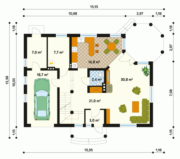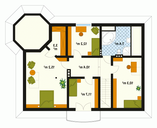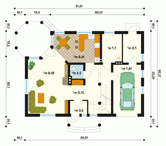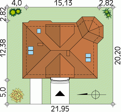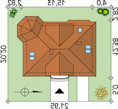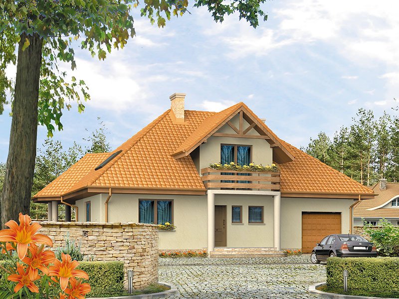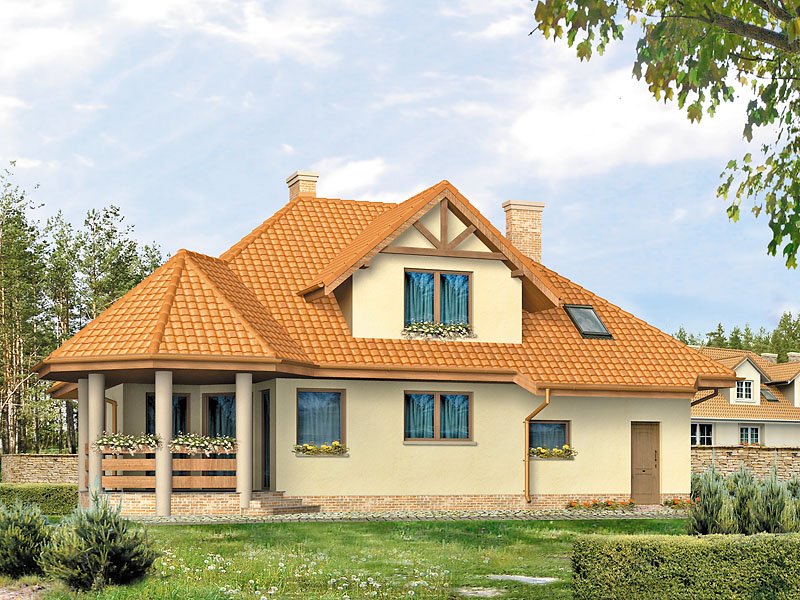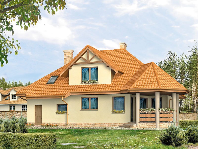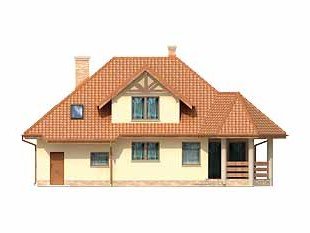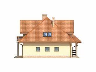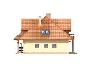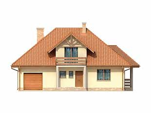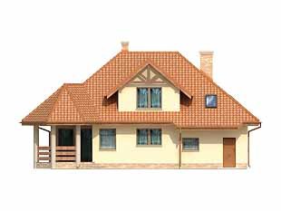 Dom jednorodzinny, parterowy z użytkowym poddaszem. Przeznaczony dla 4 – 5-osobowej rodziny. Dom, oprócz pięciu pokoi, wygodnej kuchni z jadalnią, zawiera jeszcze szereg praktycznych pomieszczeń gospodarczych.