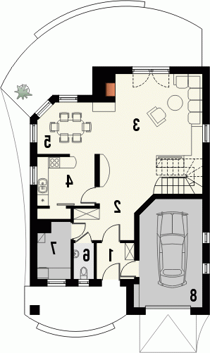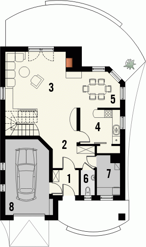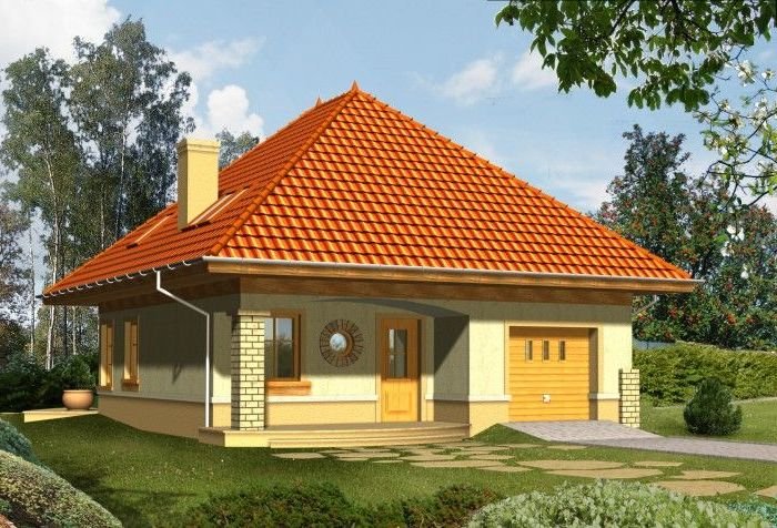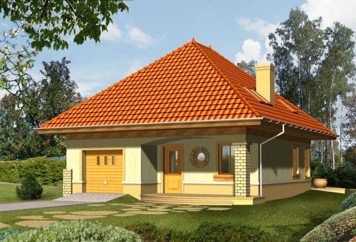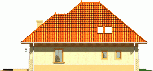 Budynek niepodpiwniczony piętrowy z garażem. Na parterze zaprojektowano salon z jadalnią, kuchnię ze spiżarką oraz wc i pomieszczenie gospodarcze. Garaż dostępny z wiatrołapu. Na poddaszu znajdują się trzy pokoje, w tym jeden ze schowkiem oraz łazienka. Dokumentacja dostępna również w odbiciu lustrzanym.