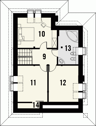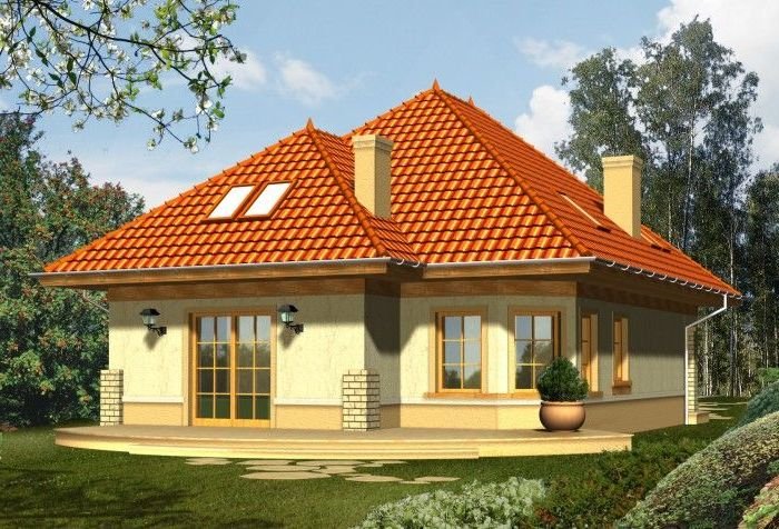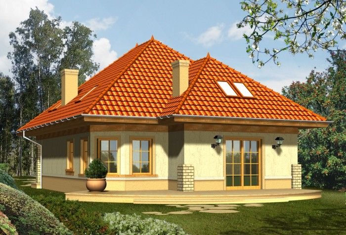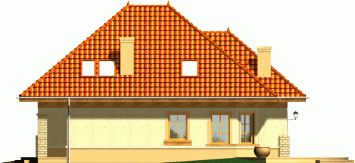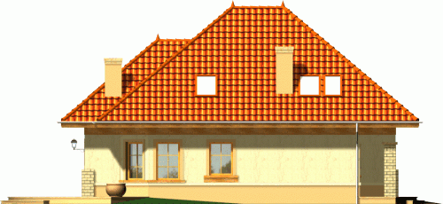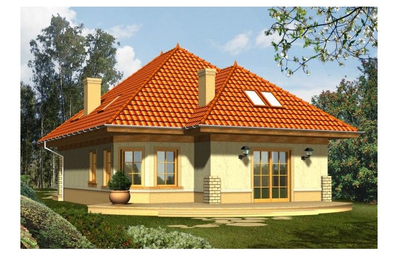 Dom z dachem kopertowym o tradycyjnym wyglądzie zewnętrznym. Front domu osłonięty jest podcieniem wejściowym, a taras od strony ogrodu przylega do całej szerokości elewacji, urozmaiconej ściętym przeszklonym narożnikiem jadalni. Widoczne z salonu schody uczynią wnętrze strefy dziennej bardziej przestronnym i otwartym.