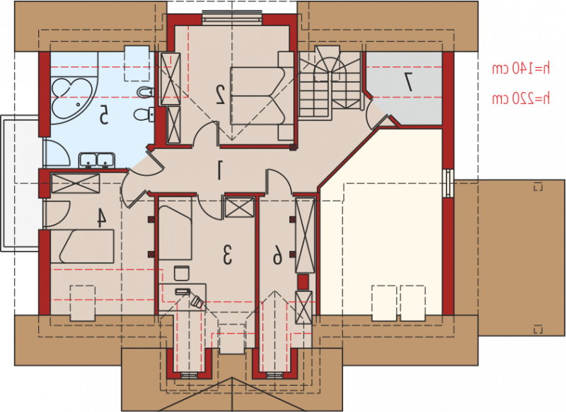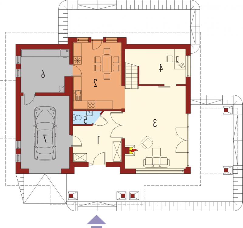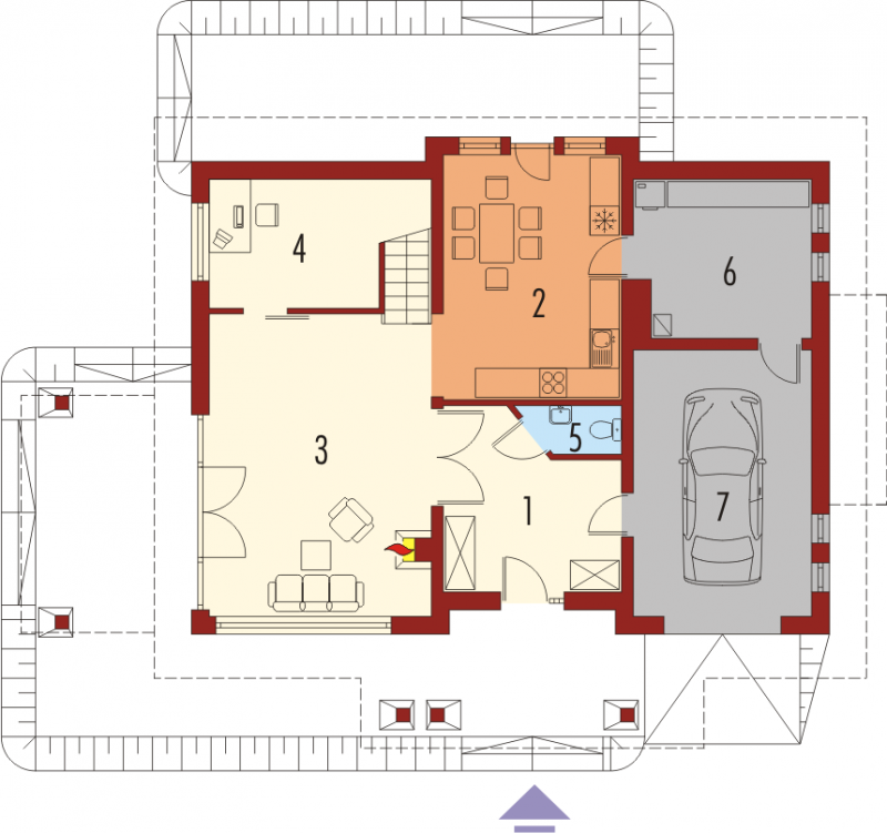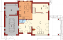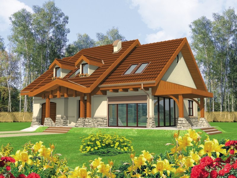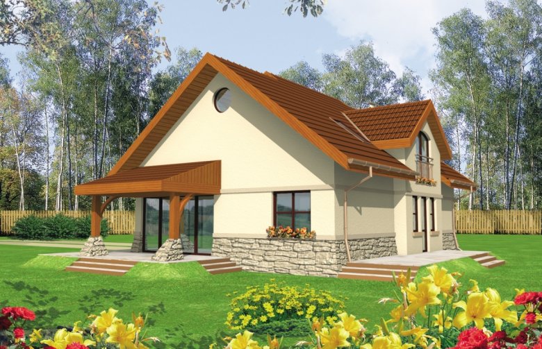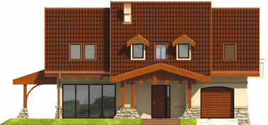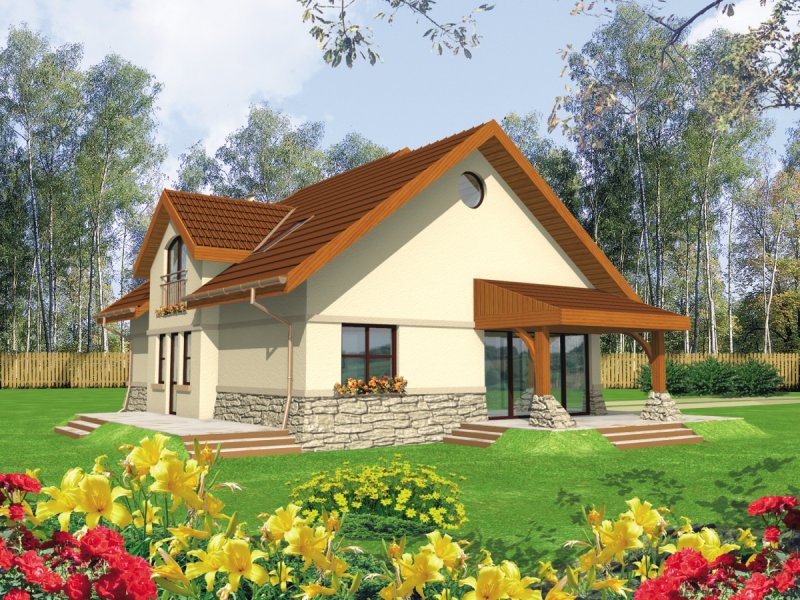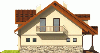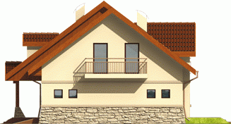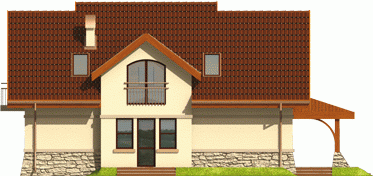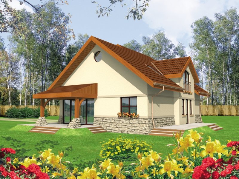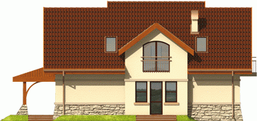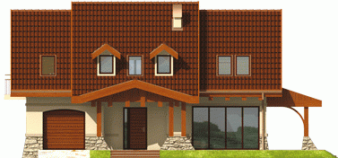Dom parterowy z użytkowym poddaszem niepodpiwniczony z wbudowanym garażem przeznaczony dla 4-osobowej rodziny. Bryła domu prosta dach dwuspadowy. Na parterze część gospodarcza z garażem - po prawej stronie holu po stronie lewej pokój dzienny z wyjściem na zadaszony taras gabinet oraz schody na poddasze. W części środkowej parteru znajduje się kuchnia z jadalnią i osobnym wyjściem do ogrodu. Poddasze to strefa nocna domu składająca się z trzech sypialń łazienki garderoby i niewielkiego pomieszczenia gospodarczego.