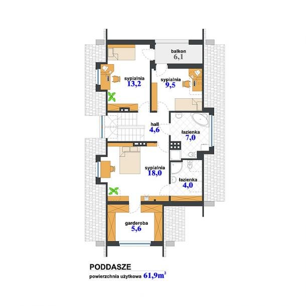 na piętrze zaprojektowano 2 pokoje, sypialnię rodziców z oddzielną łazienką i garderobą, oraz ogólnodostępną łazienkę