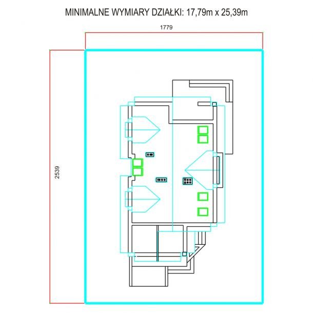 - Min. wymiary działki 23.47x17.49 m