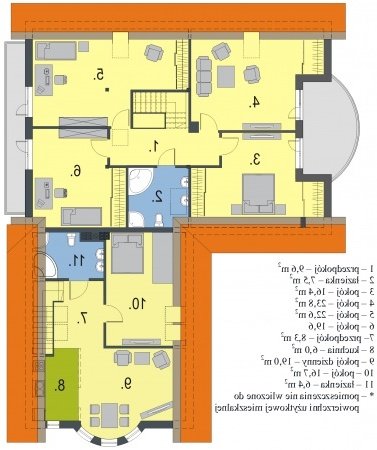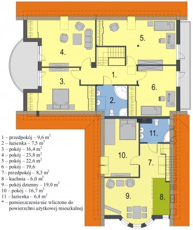 Piękny dom o wygodnym i przestronnym wnętrzu. Dobrze rozplanowana funkcja daje możliwość oddzielenia wypoczynku od pracy i snu. Jest przewidziane również miejsce dla prac gospodarczych. Poddasze z czterema sypialniami to miejsce odpoczynku i nauki dla dzieci. Dodatkowo na poddaszu zaprojektowano niezależne, przytulne mieszkanie z odrębnym wejściem. Może ono służyć prowadzeniu różnego rodzaju działalności gospodarczej.