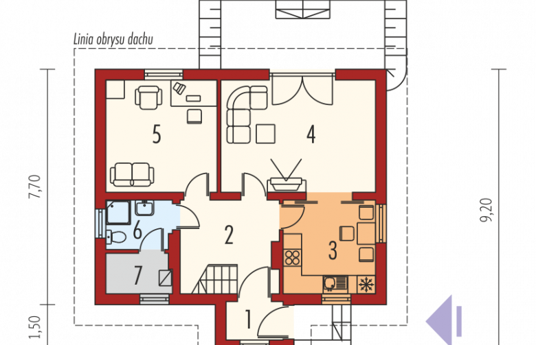 Dom parterowy z użytkowym poddaszem, niepodpiwniczony, przeznaczony dla 4-osobowej rodziny. Posiada prostą konstrukcję i przejrzysty układ funkcjonalny. Strefę dzienną na parterze stanowi pokój dzienny, kuchnia i dodatkowy pokój gościnny, strefę nocną – na poddaszu – trzy sypialnie, garderoba i łazienka. Dzięki prostej bryle koszt budowy domu jest niewysoki.