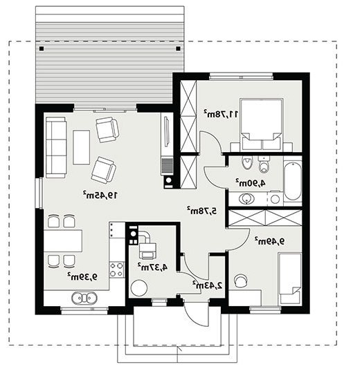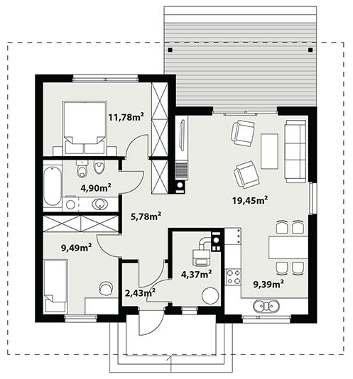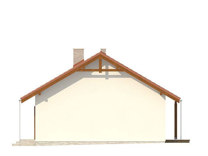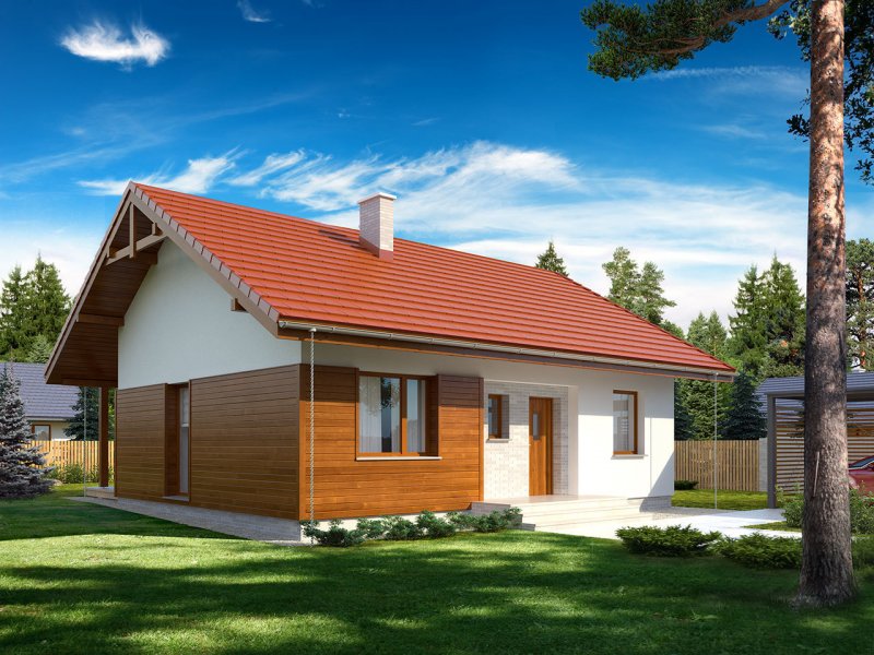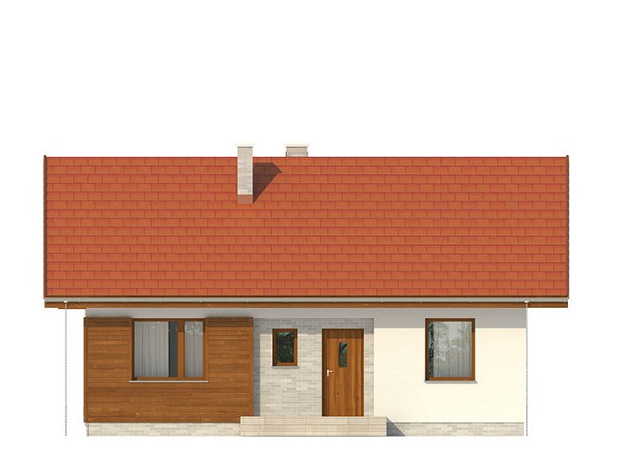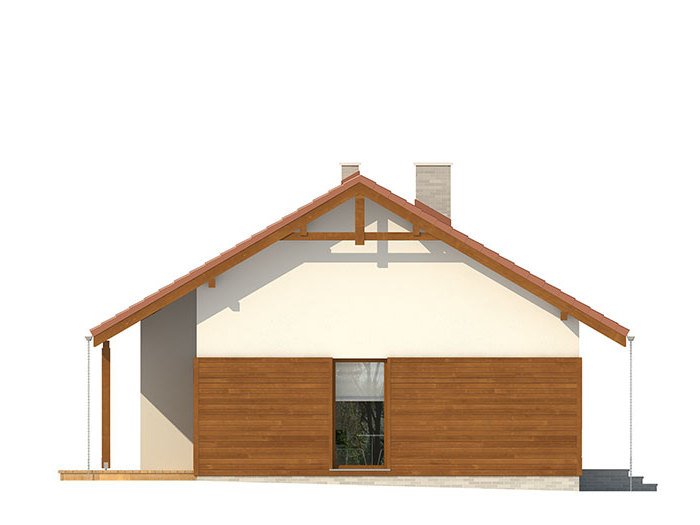 Nieduży jednorodzinny budynek mieszkalny, parterowy, zaprojektowany w technologii szkieletu drewnianego. Ergonomiczny i optymalny układ pomieszczeń zapewnia komfort 3-osobowej rodzinie. Funkcjonalnie rozplanowana przestrzeń została wyraźnie podzielona na część dzienną i nocną. Część reprezentacyjna domu, to przestronny salon połączony z jadalnią, który otwiera się na duży, zadaszony taras oraz kuchnia. Oprócz części dziennej, zaprojektowano dwie sypialnie i dużą łazienkę, które stanowią część intymną domu. Wymiary kotłowni umożliwiają montaż kotła na każdy rodzaj paliwa. Sama bryła budynku nawiązuje do archetypu domu jednorodzinnego. Rzut budynku powstał w oparciu o rzut prostokąta, zaś sam dom został przykryty dachem dwuspadowym. Dom tym samym jest tani i prosty w budowie oraz niedrogi w utrzymaniu i eksploatacji. Projekt dostępny jest również w technologii murowanej.