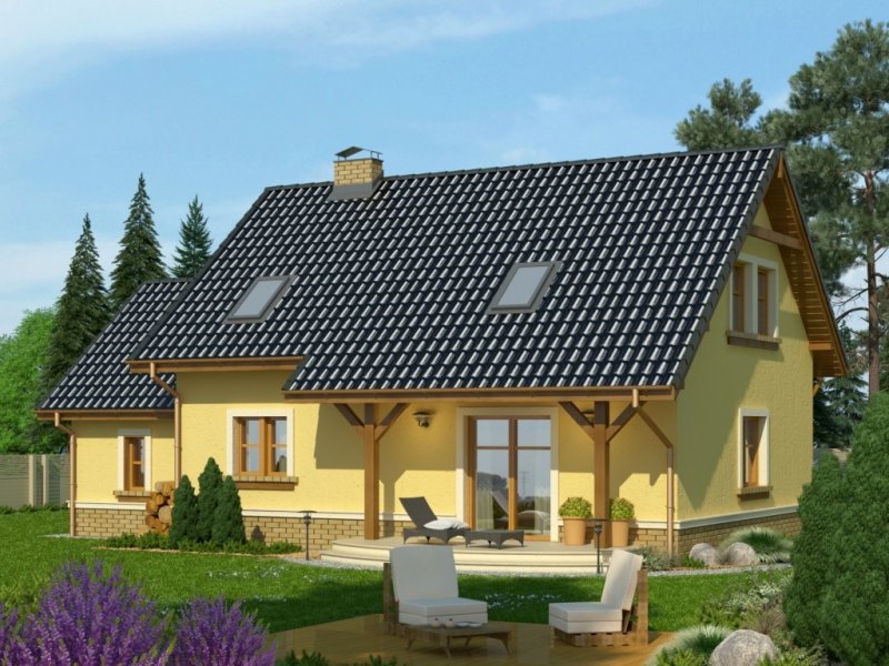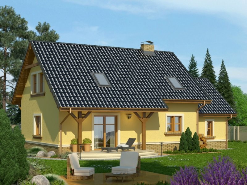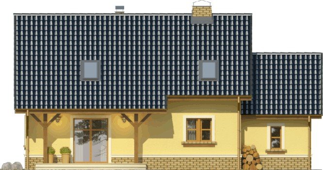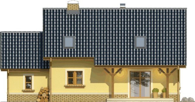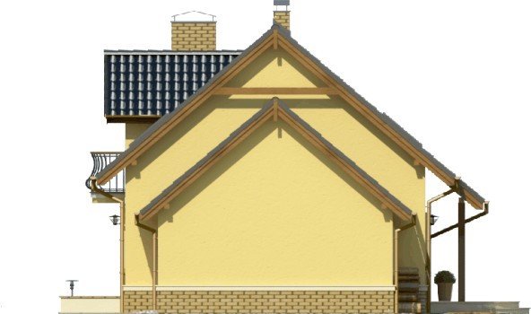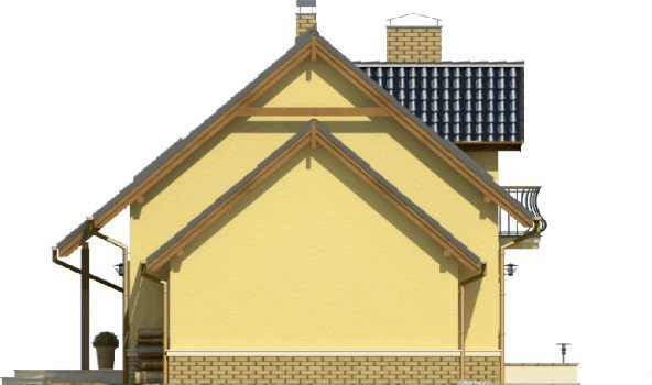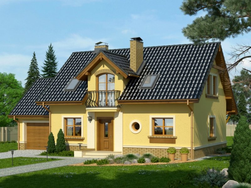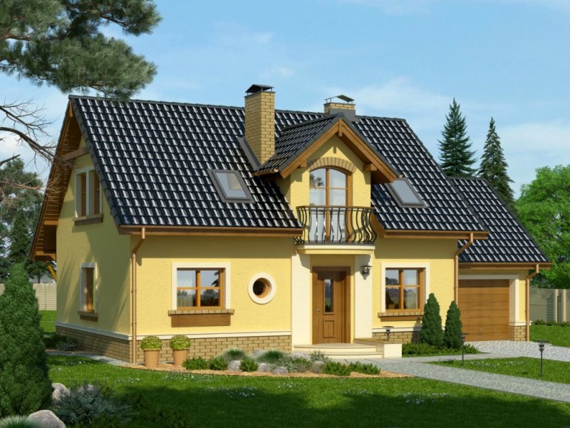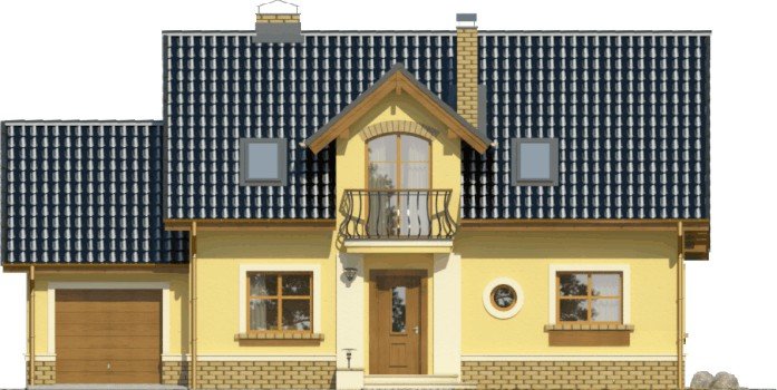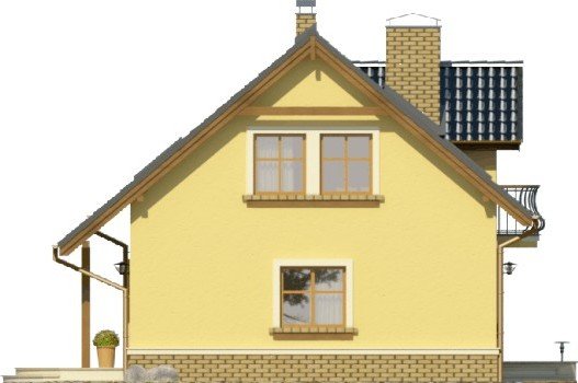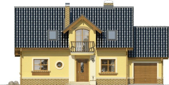 Klasyczny dom z dachem dwuspadowym z bryłą garażu dostawioną z boku. Uwagę zwracają harmonijne fasady z oknami ujętymi w opaski oraz podkreślone poprzez balkon powyżej wejście główne. Wyjście na taras atrakcyjnie zadaszone obniżoną połacią dachu opartą na drewnianych słupkach.