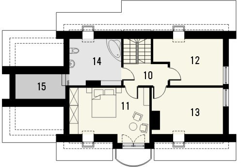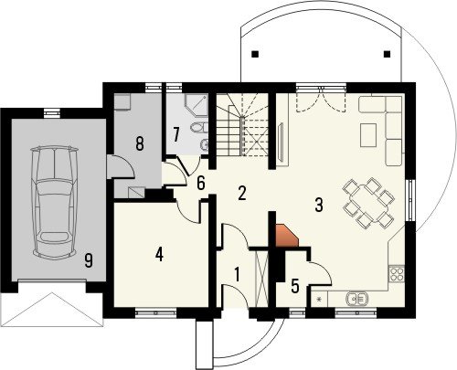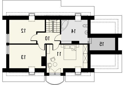 Budynek niepodpiwniczony piętrowy z garażem. Na parterze zaprojektowano pokój dzienny z jadalnią i kuchnię ze spiżarką oraz wydzielony pokój, pom. gospodarcze i łazienkę. Na poddaszu znajdują się trzy pokoje w tym jeden z dużym oknem balkonowym oraz łazienka. Dokumentacja dostępna również w odbiciu lustrzanym.