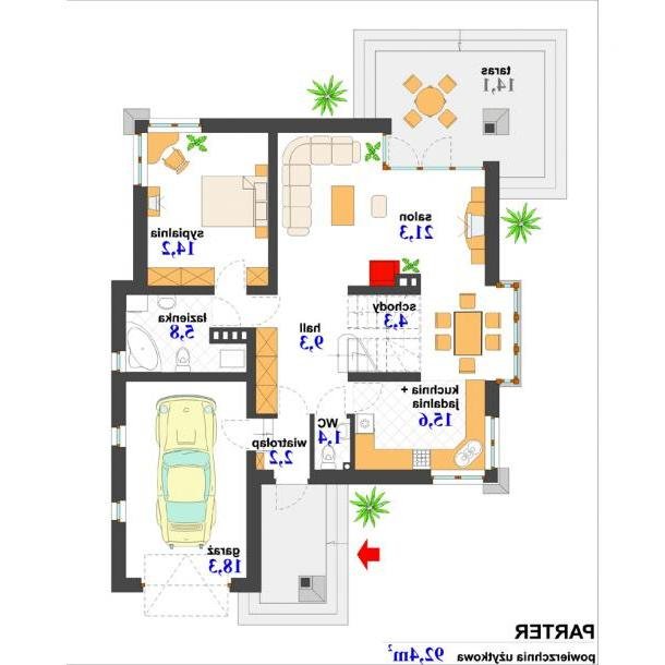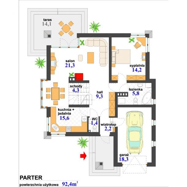 * na parterze zaprojektowano salon z kominkiem i wyjściem na zadaszony taras, kuchnię z aneksem jadalnym w formie oranżerii, WC, sypialnię i łazienkę rodziców oraz garaż