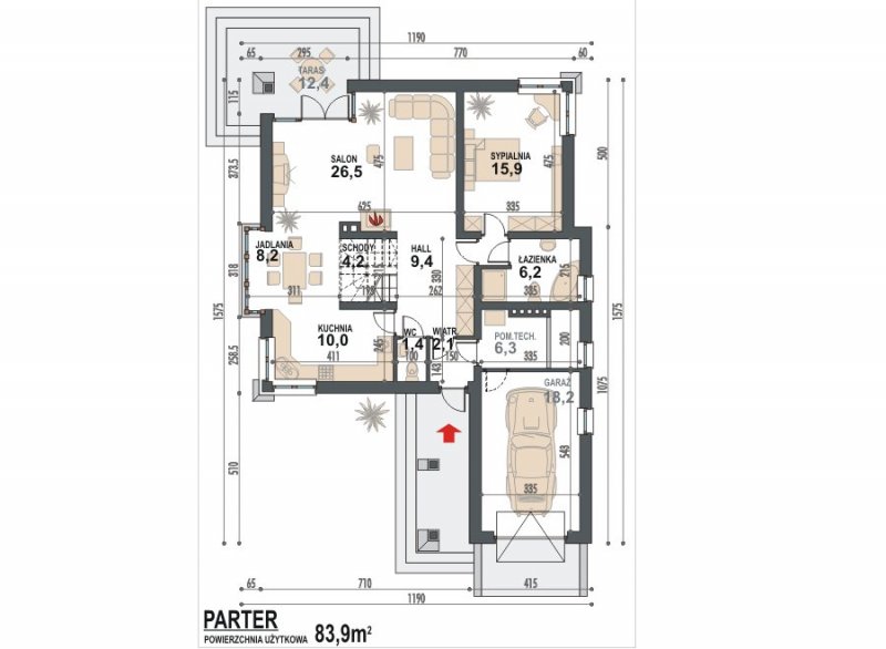* na parterze zaprojektowano reprezentacyjny salon z kominkiem połączony z jadalnią, otwartą kuchnię, sypialnię rodziców z osobną łazienką, WC oraz kotłownię i garaż