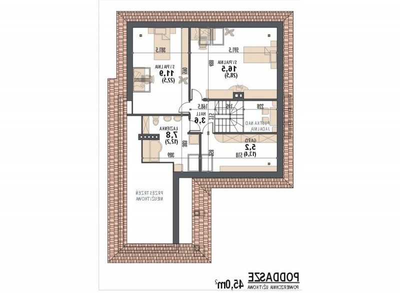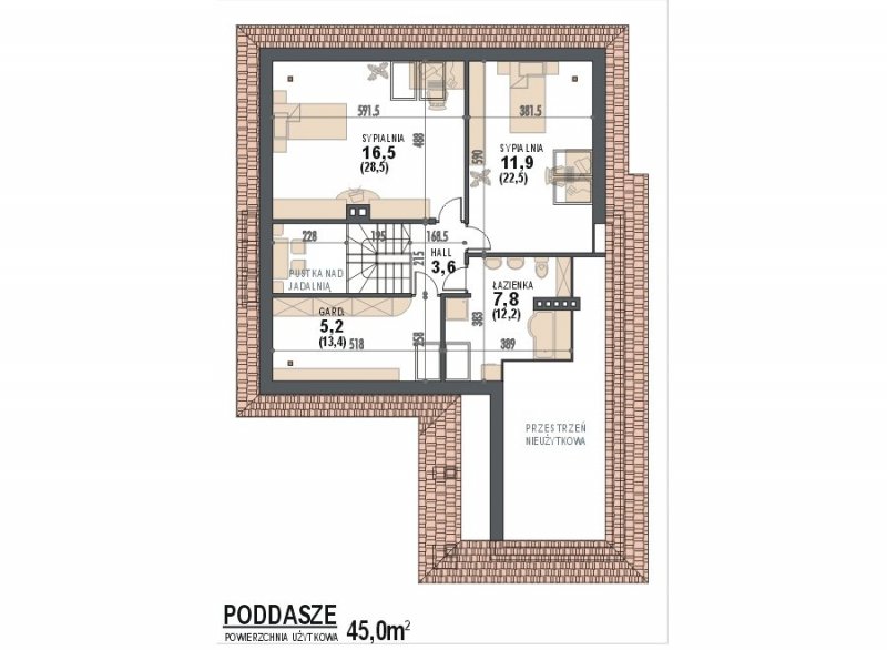* na poddaszu znajdują się dwie duże sypialnie, przestronna łazienka oraz garderoba – schowek, istnieje możliwość dowolnej aranżacji poddasza