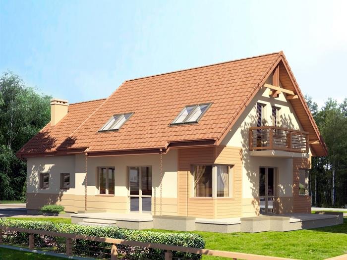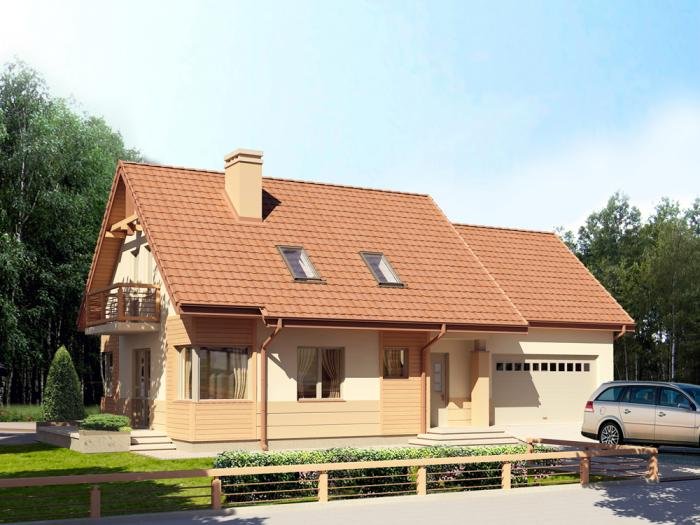 * jednorodzinny dom parterowy z poddaszem użytkowym i garażem dwustanowiskowym (istnieje wersja jednostanowiskowa), niepodpiwniczony