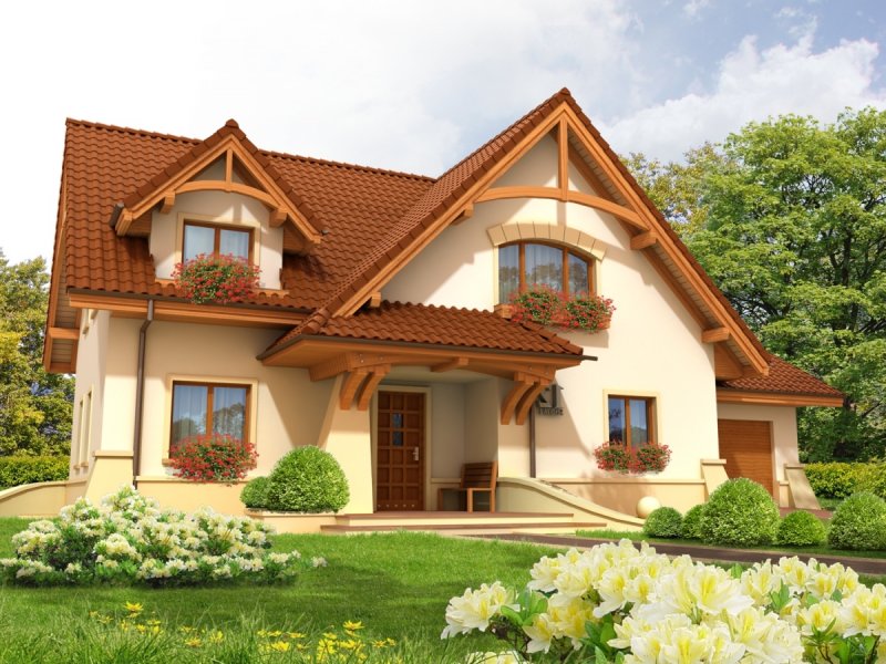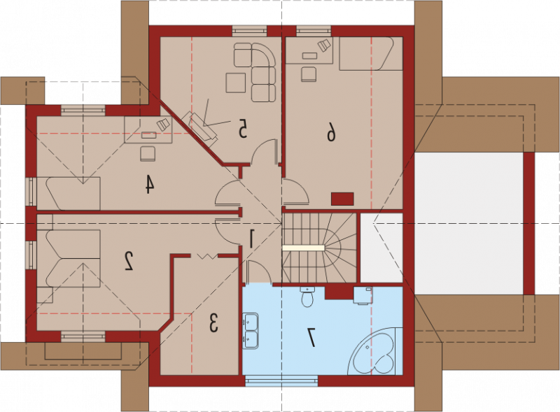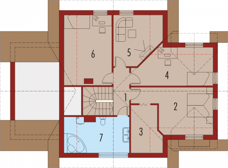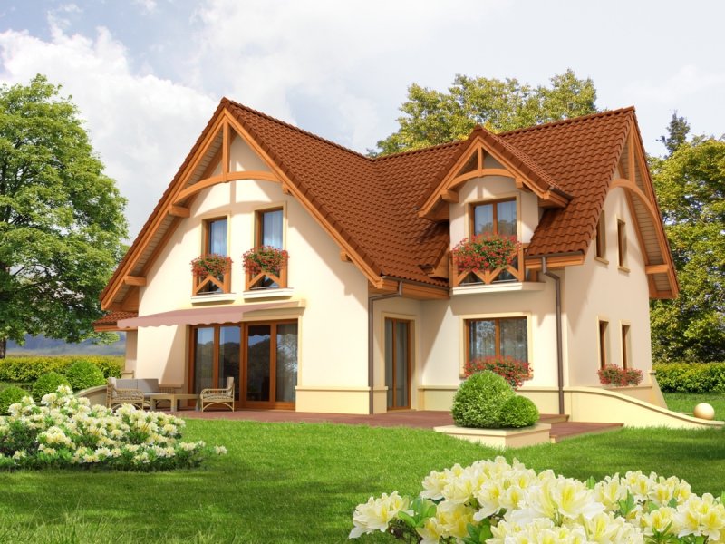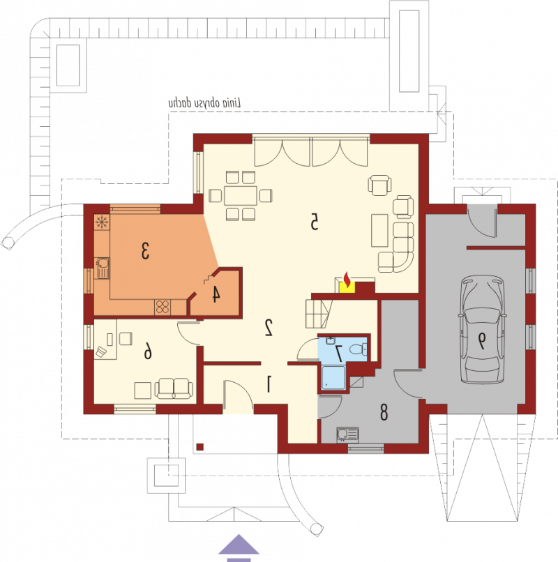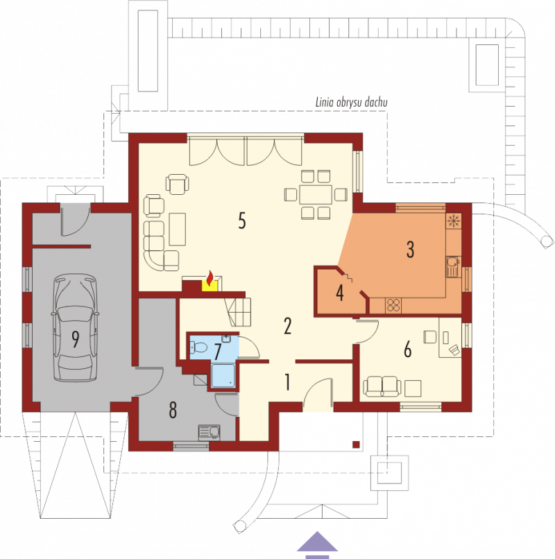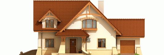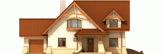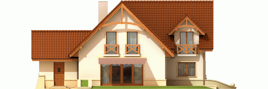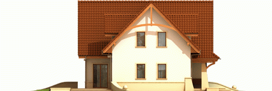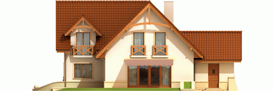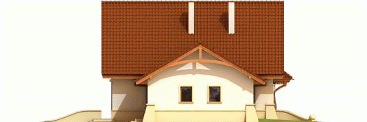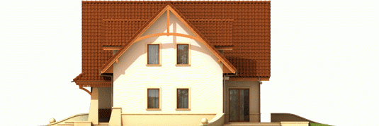 Dom parterowy z użytkowym poddaszem, niepodpiwniczony, z garażem jednostanowiskowym, przeznaczony dla 4-5-osobowej rodziny. Bezpośrednio z wiatrołapu mamy dostęp do przejściowego pomieszczenia gospodarczego oraz do przestronnego holu prowadzącego do gabinetu, łazienki i dużego pokoju dziennego z centralnie usytuowanym kominkiem. W tej części zaprojektowana została również jadalnia i otwarta kuchnia wraz ze spiżarką. Poddasze to trzy wygodne pokoje, sypialnia z własną garderobą oraz duża, jasna łazienka.